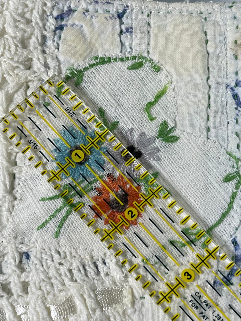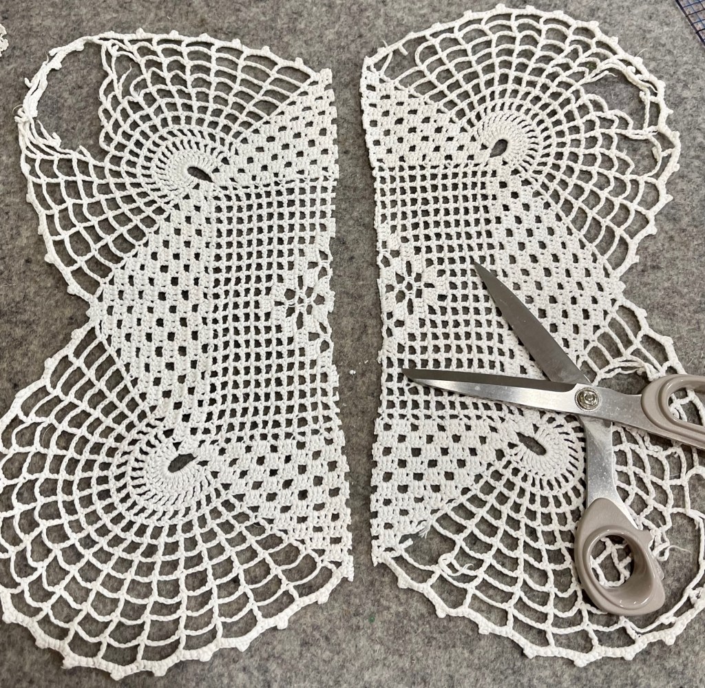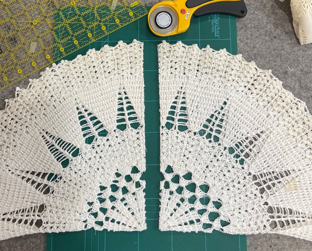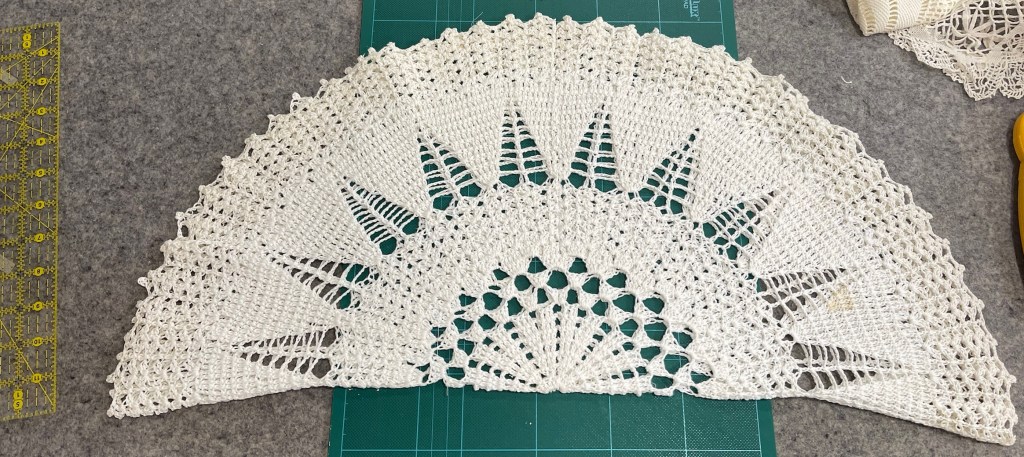 Then there was this unusual shaped doily. The first picture shows you the extensive damage and the size is far too large for this quilt. I decide I’ve got nothing to lose by experimenting and cutting it apart into 4 sections.