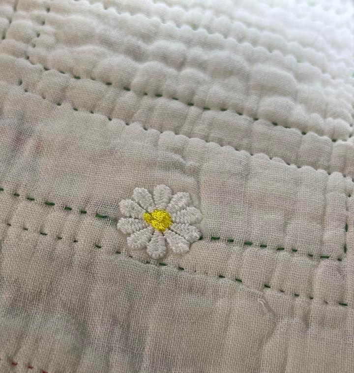 The daisy is first glued into place, the glue is dried with an iron and then stitched in place, machine straight stitch. I will place a slightly larger “something” on the quilt front later.
