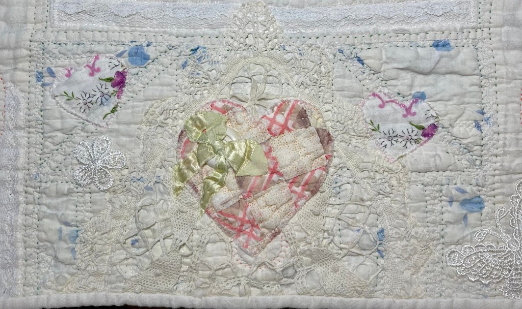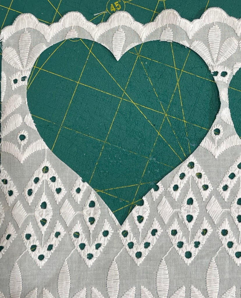 I also cut a few hearts from a lovely white embroidered fabric I purchased at JoAnn Fabrics a year or two ago.