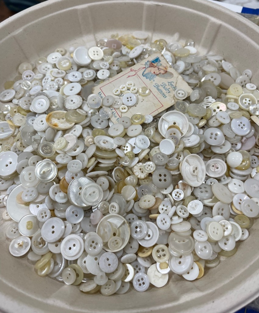 Once my button swags are stitched I can then add narrow ribbon button to button. To add interest I often will knot the ribbon both at the start and finish of the button swag as well as in the middle of each button.
