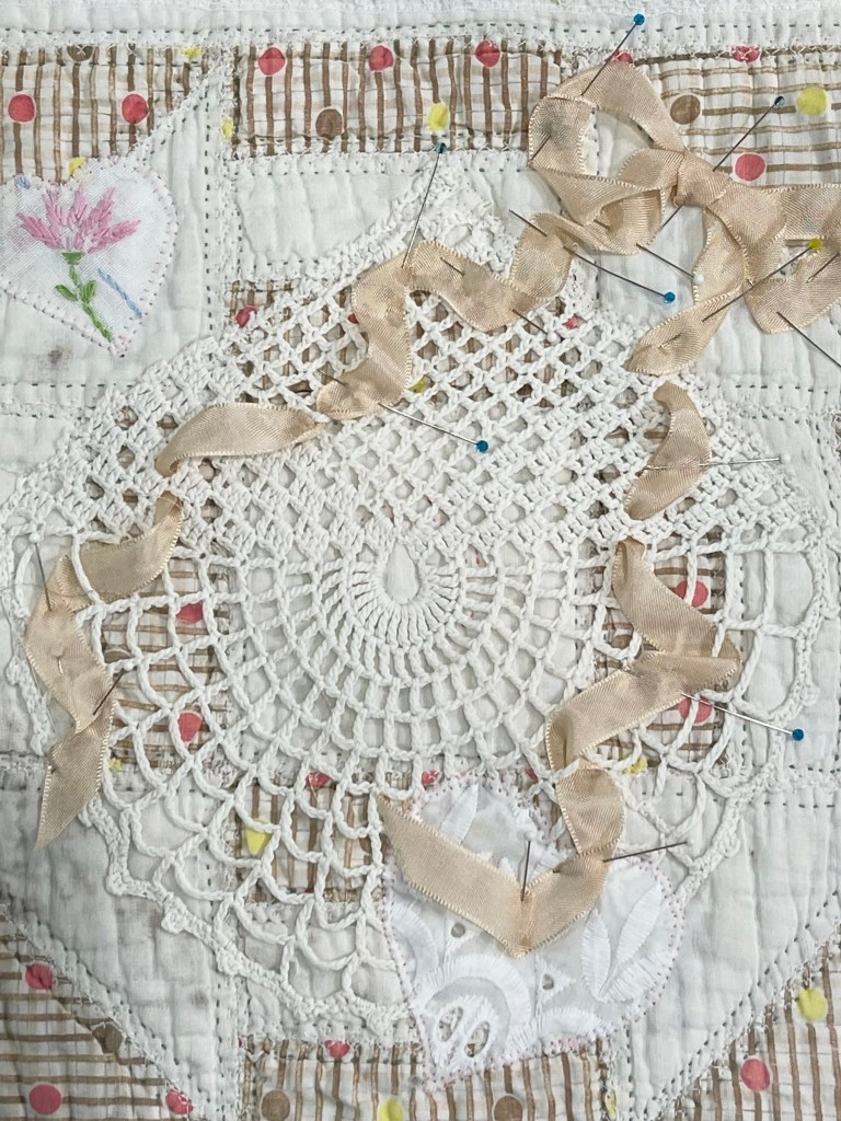 The project is taking shape! I’ve sewn hearts to every block, hung the quilt on my design wall and have begun to plan my next step: ribbons!
