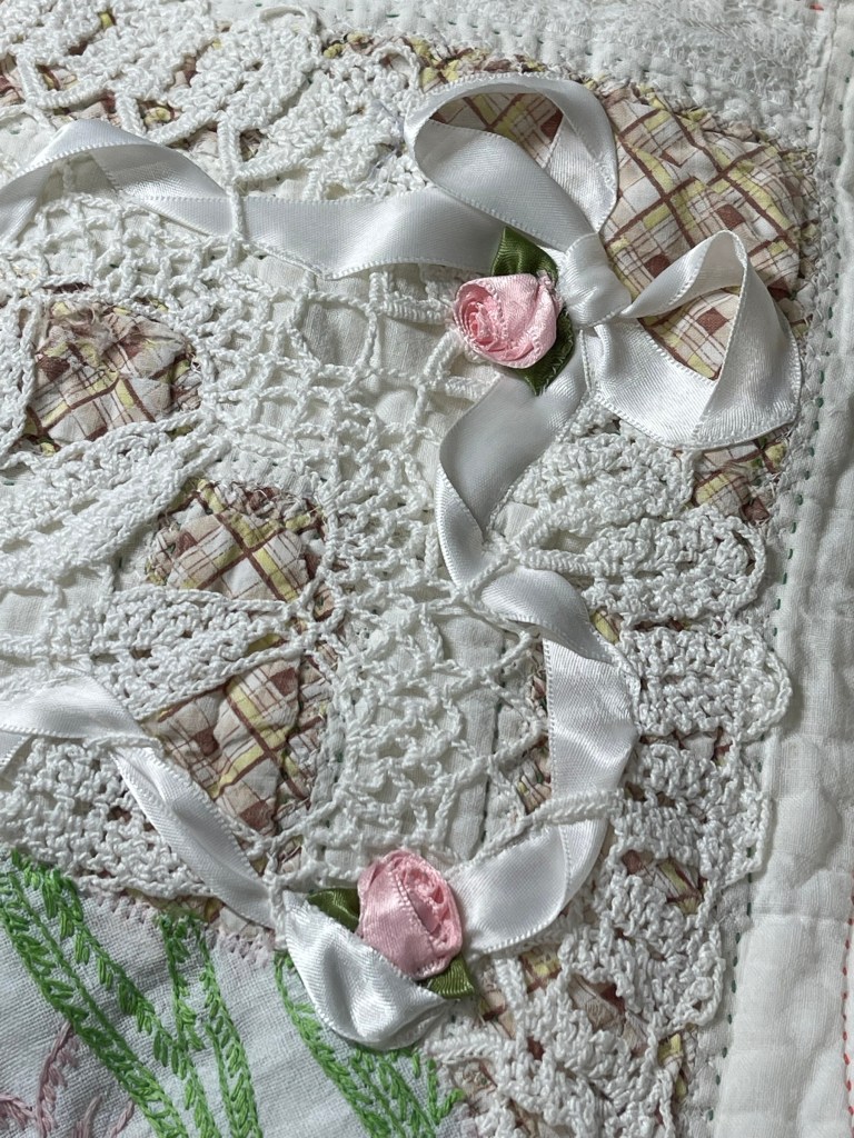 More commercially produced ribbon roses. To give them a more vintage look I flattened them with a steam iron before machine stitching them to the quilt.