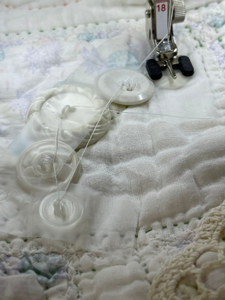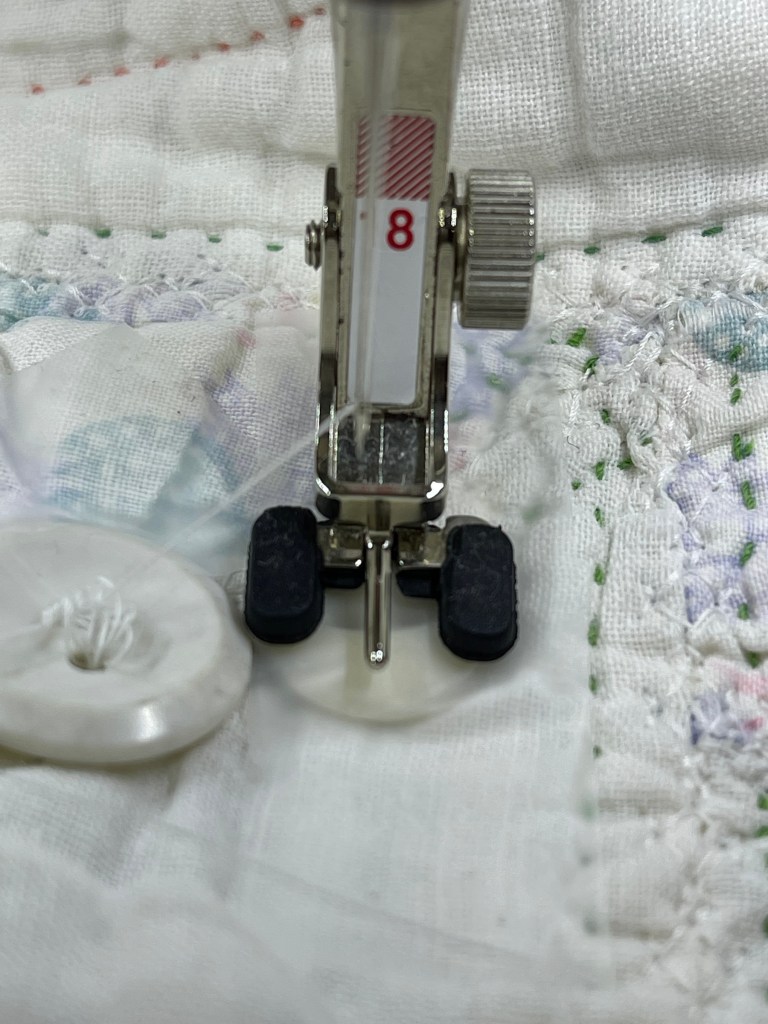 See the little metal bar between the black toes of the #18 foot? This little bar adds a “thread shank” to the button. I need this thread shank! Without it the button would be sewn tight to the quilt and weaving in the ribbon shown below would be difficult.