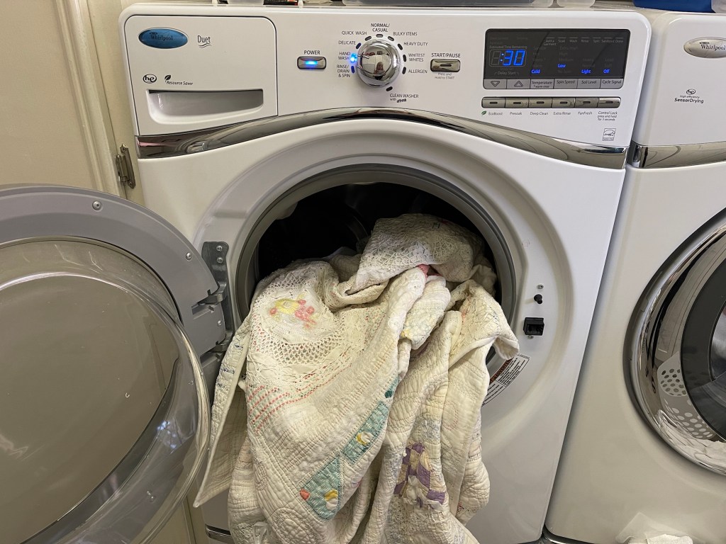 A trip through the washing machine and the quilt is ready to be blocked. Why block? The quilt I started with is old, well used and well laundered. As such it has shrunk a bit. When I machine stitched the vintage light ivory damask tablecloth binding to the quilt, the very act of stitching and the presser foot causes the quilt to slightly stretch out to more of its original size. Does this make sense? As such, the body of the quilt remains slightly smaller while the edges are now closer to the original quilt size. The result: wonky/wavy quilt binding edges.