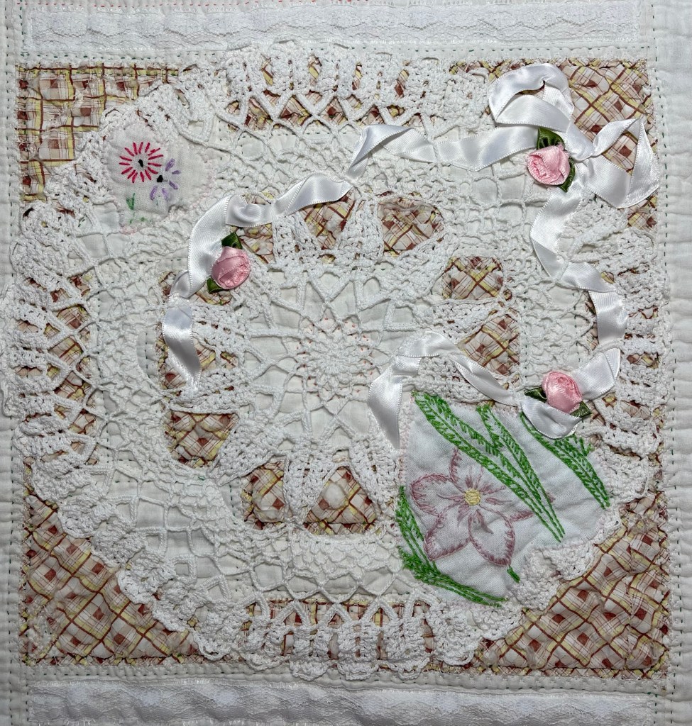 For added interest I wove a quarter inch white satin ribbon into the cut doily and as before, I machine stitch this piece to the quilt with a very small zig zag stitch. From this 12” round doily I was able to cut 8 pieces. But if you remember, I have 10 partial blocks that need doilies.