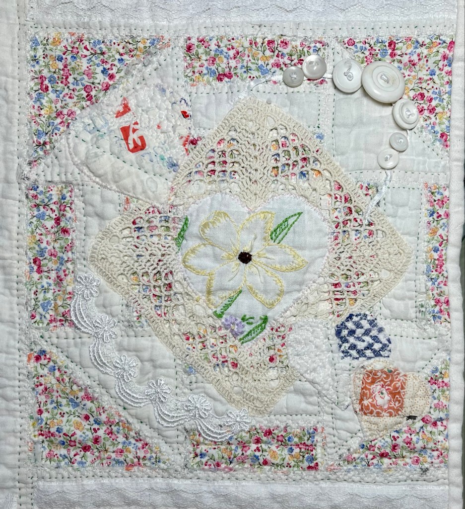 I have quite a few of these square crocheted doilies in both white and ivory. I’m planning to use these doilies on every other quilt block, randomly choosing between both colors.