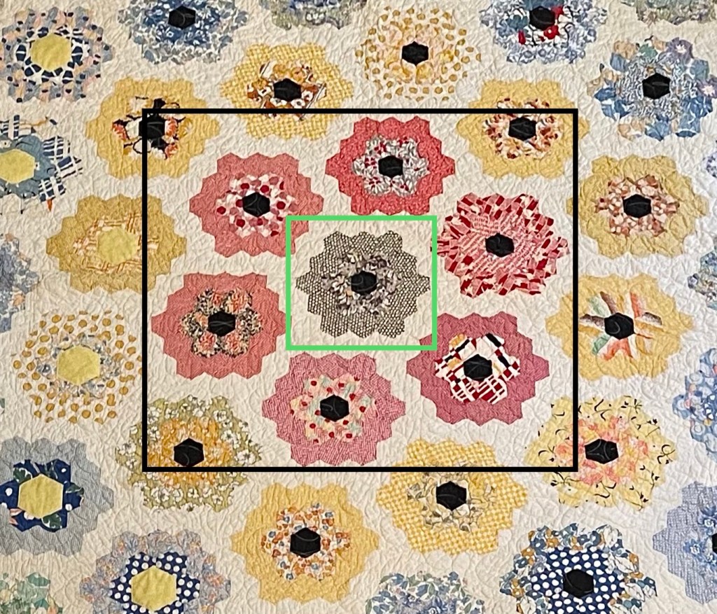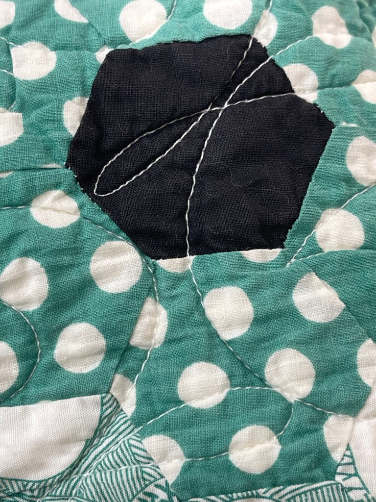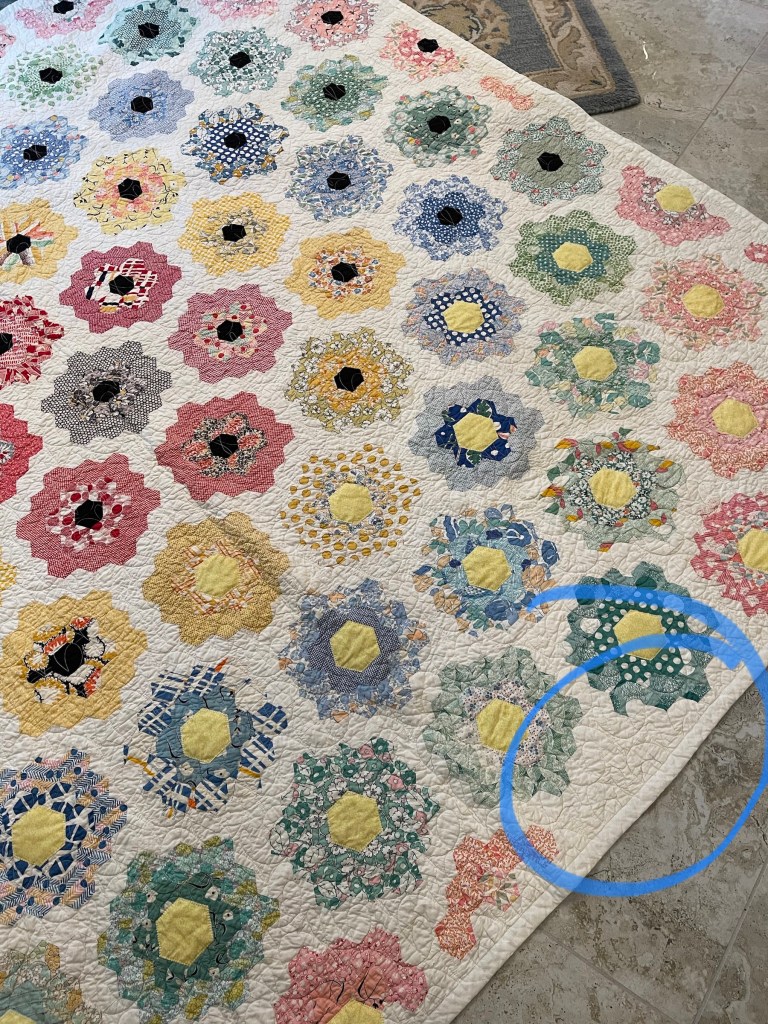 But let’s jump back to my earlier comment about the block colors set into a circle. Look at the picture below and what immediately jumps out? The blocks are not squared up with each other. The red blocks are offset by one hexagon width. They circle the center very dark block but the maker, either intentionally or by mistake stitched them together in this way. Does it kind of give me hives? Kind of yes, kind of no…