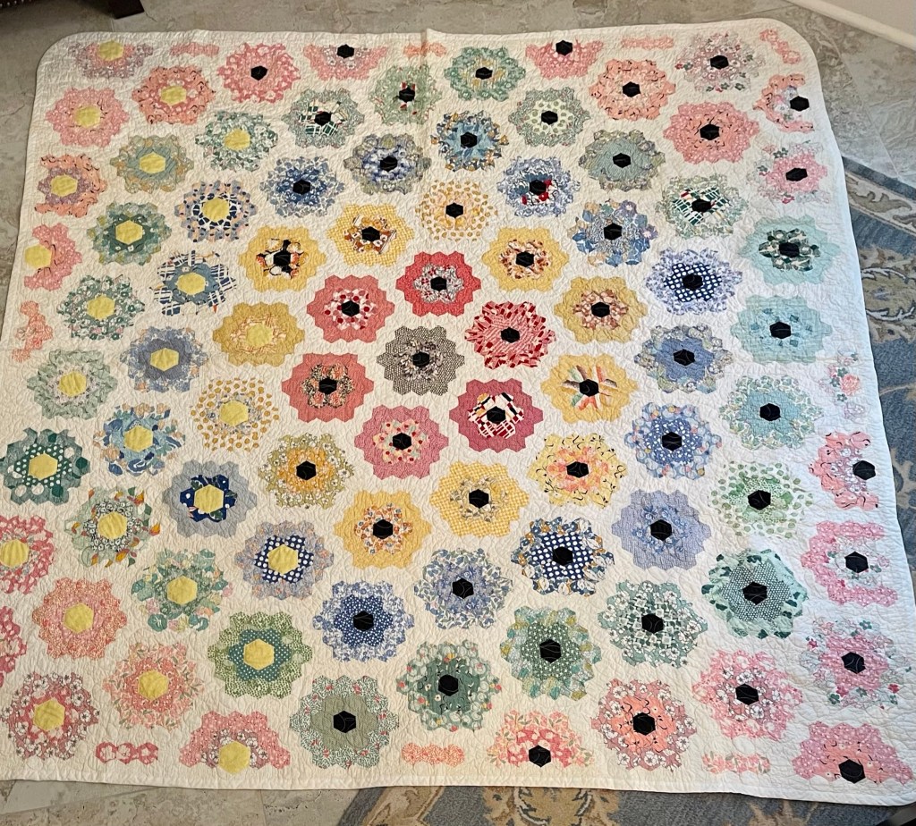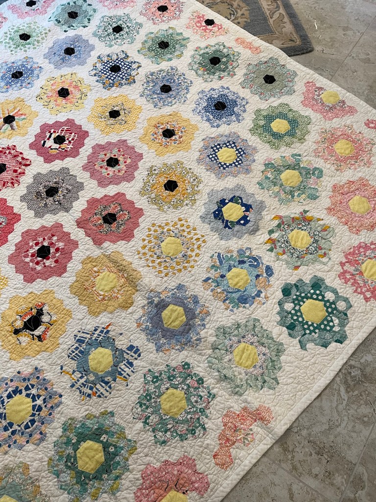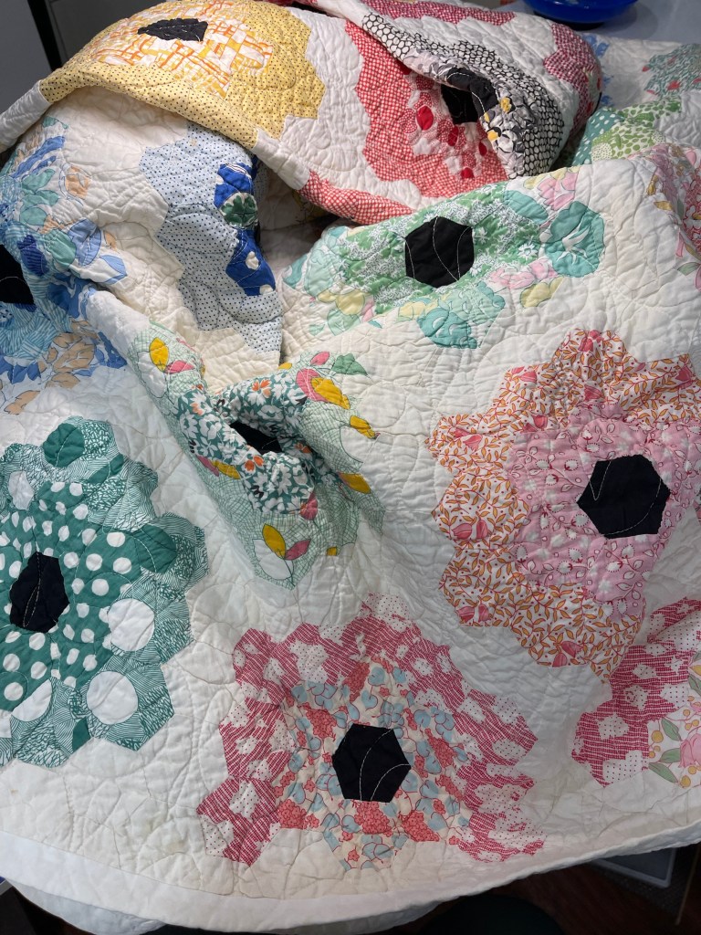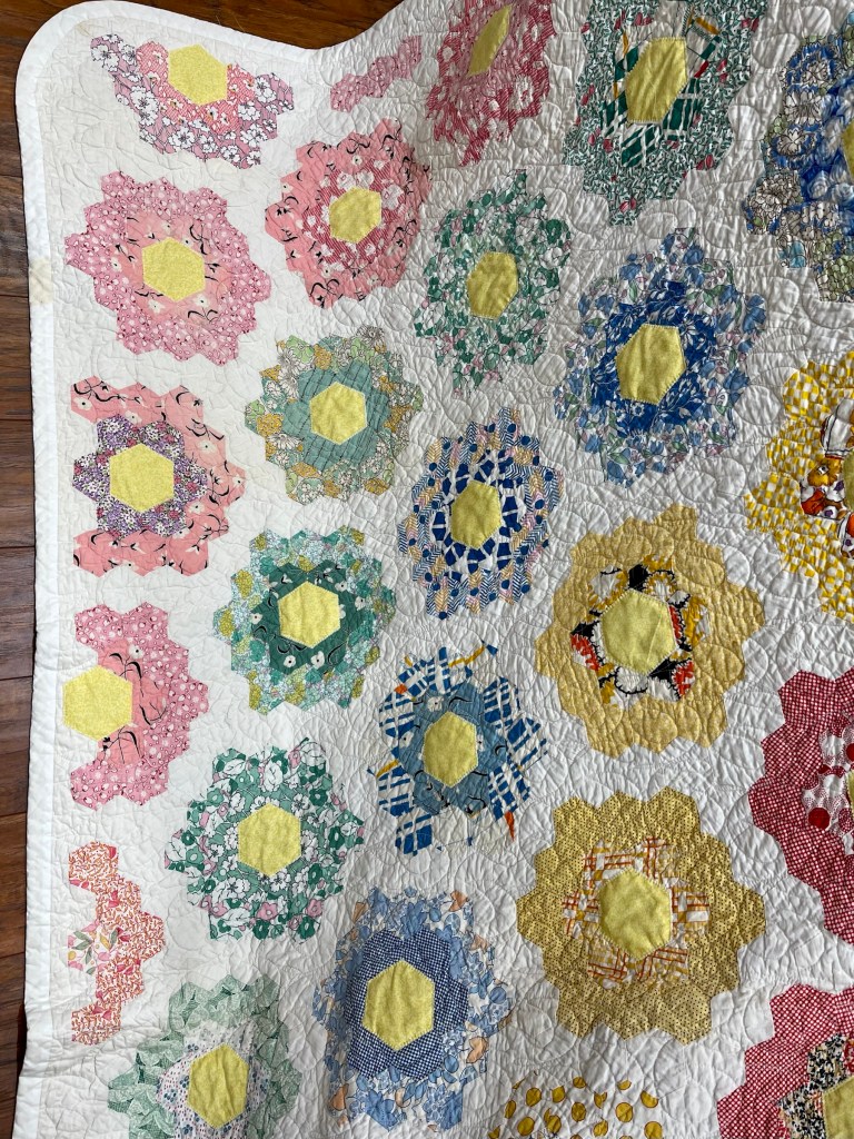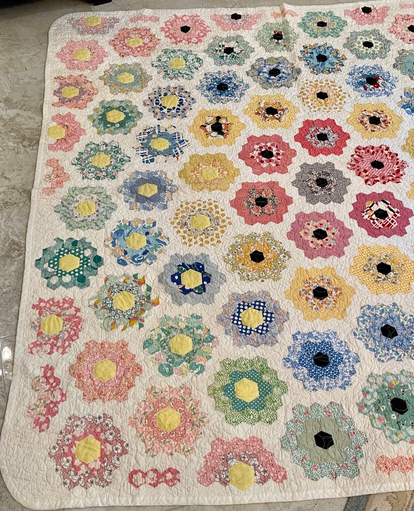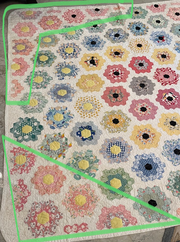 I set out to find a well used, well worn, etc. etc. Grandmother’s Flower Garden (GFG) quilt that I could, with a clear conscious, cut up without remorse. Finding nothing locally I reached out to a dear friend in the “vintage” business and she came to my rescue. She sent pictures of the GFG quilts available for purchase and I chose this one.
