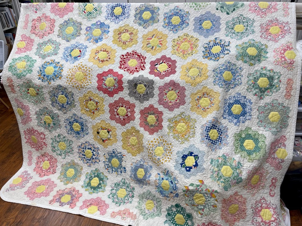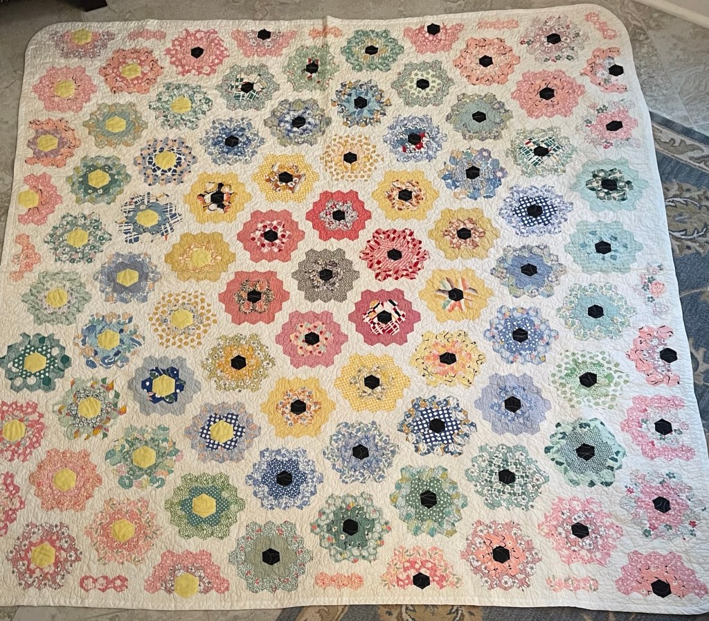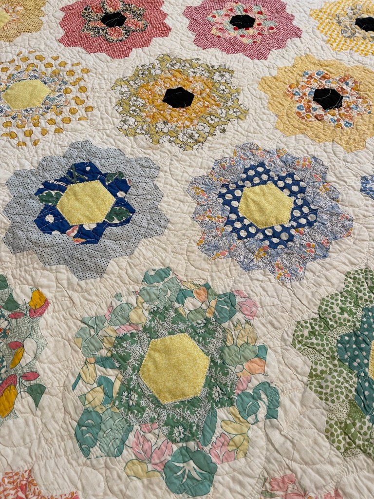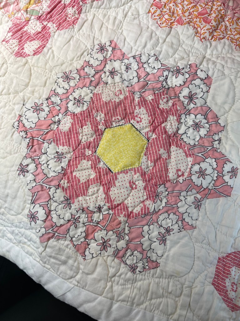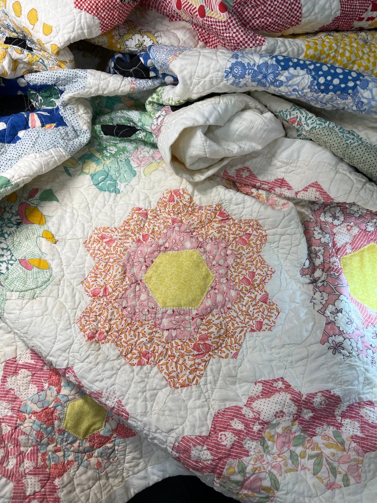 I set out to find a well used, well worn, etc. etc. Grandmother’s Flower Garden (GFG) quilt that I could, with a clear conscious, cut up without remorse. Finding nothing locally I reached out to a dear friend in the “vintage” business and she came to my rescue. She sent pictures of the GFG quilts available for purchase and I chose this one.
