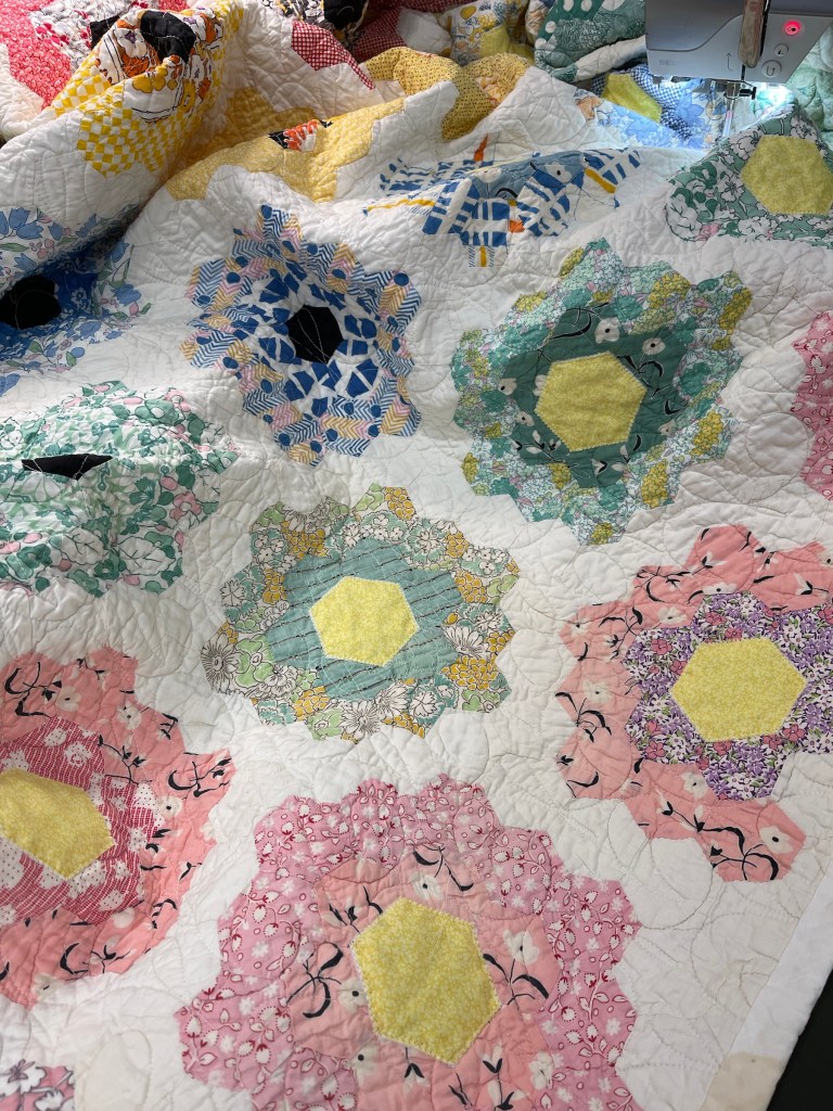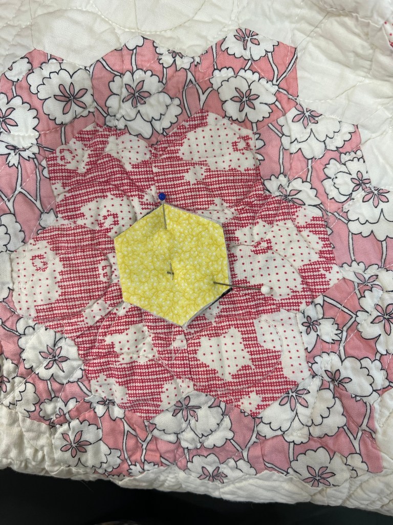 I’m really liking the look, mentally working through the oversized hexagon in the center and slowly but surely getting all 90 applique stitched. The oversized hexagon…I had to pin a few in place, walk away and the next day re-examine my idea. The “structured” part of brain was alarmed but the need to cover wonky hexies won out.