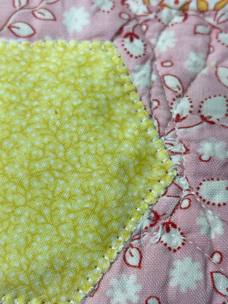 What would the original maker think? First I’m sure she would be very happy that I did not cut up her beautiful quilt and second, it’s nice knowing the new yellow centers could easily be removed, just a few hours and a seam ripper would take care of the revision.