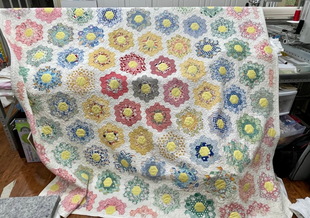 The flower blocks gradually lose hexagons until they are just a simple row of 3 pieces. But what else is evident? The quilt top edges are all white hexagons. No color touches the binding.