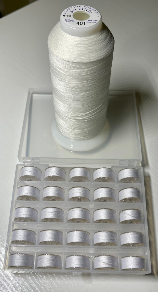 The threads I used: the needle has Superior Threads So Fine, a nice strong 50 wt. 3 ply, color 401. The bobbin is Thread Arts pre-wound 50 wt. color THPS101.
