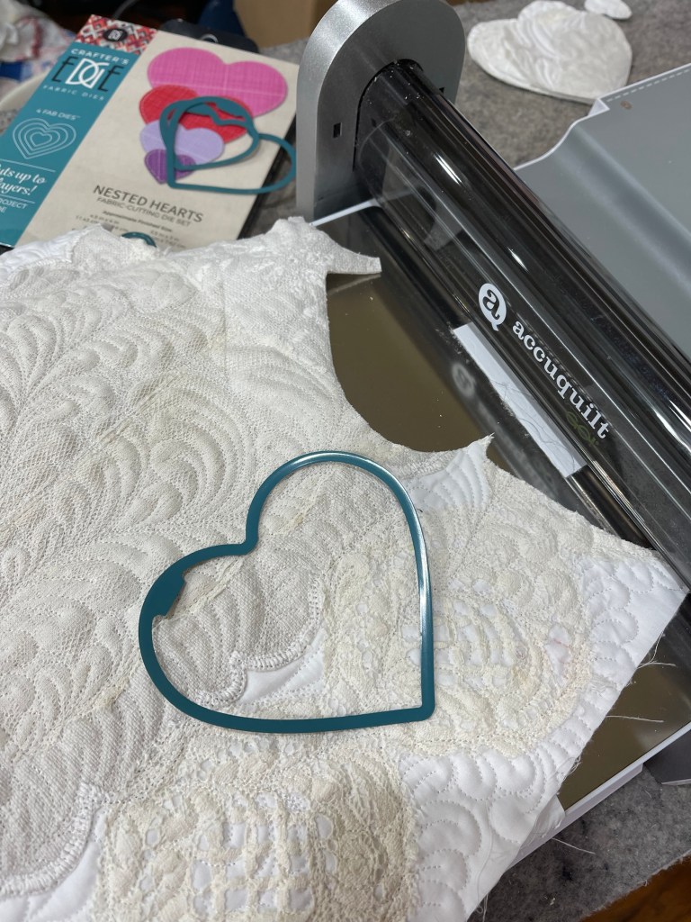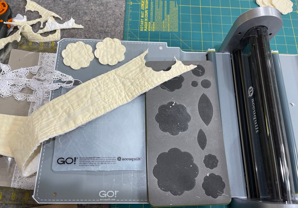 The cornerstones in the quilt sashings need flowers! I’m using my Accuquilt Cutter and Die to cut flower shapes from old very worn and torn quilt pieces.