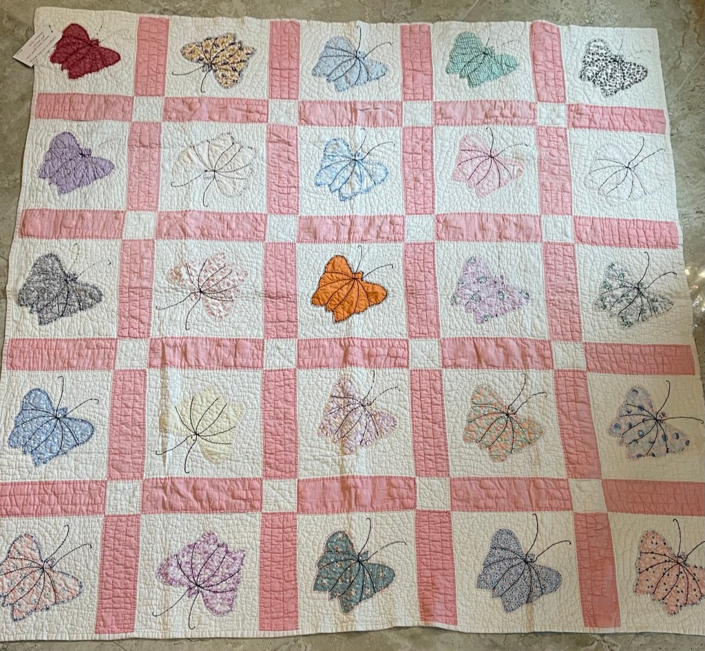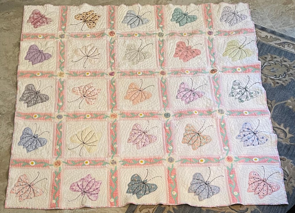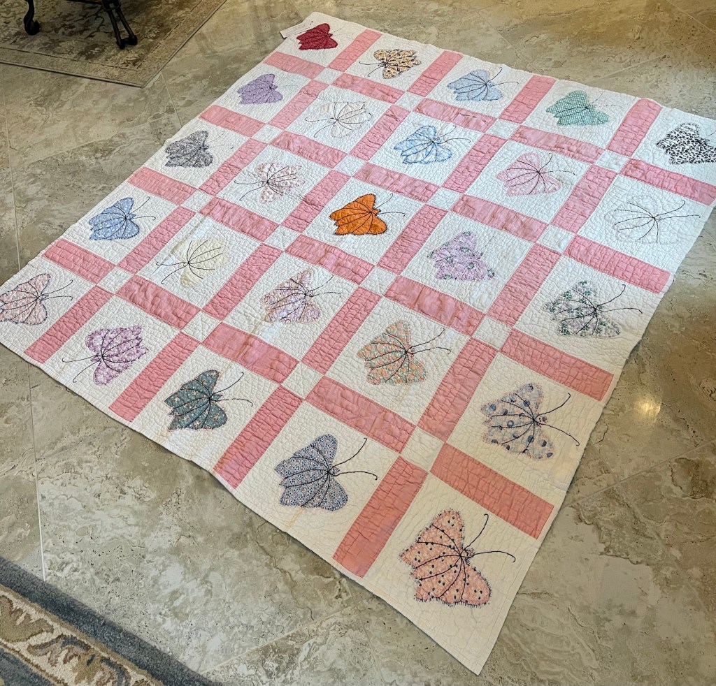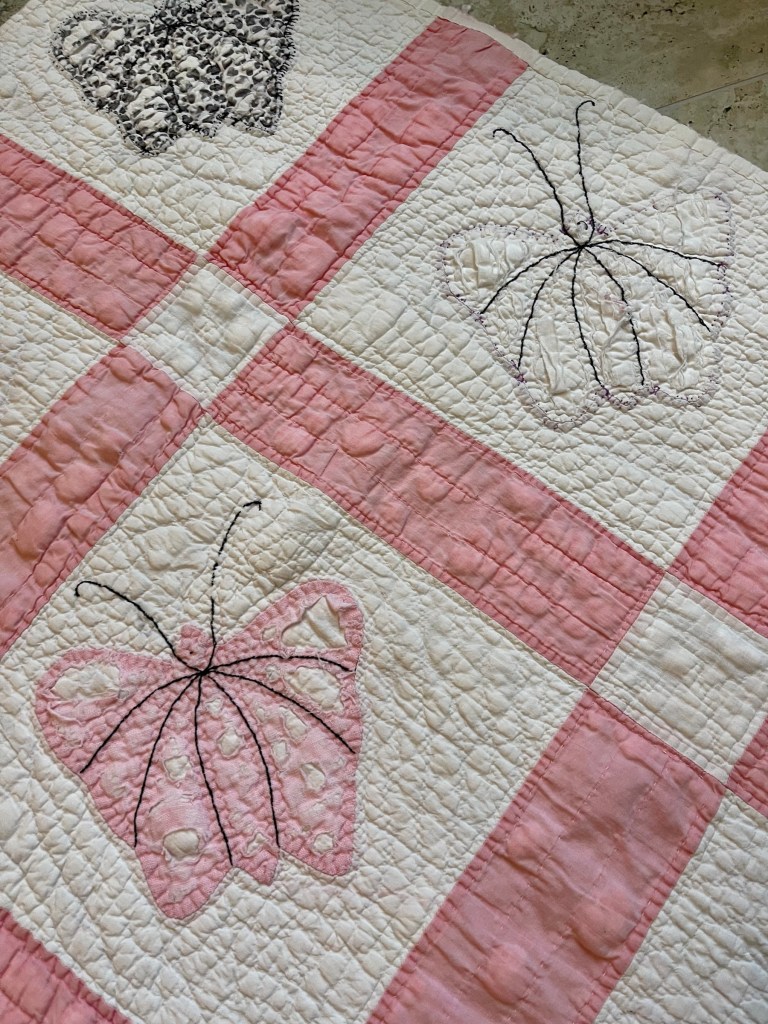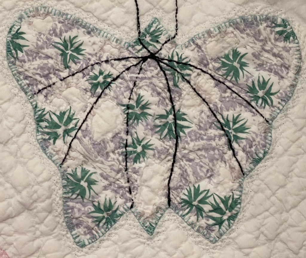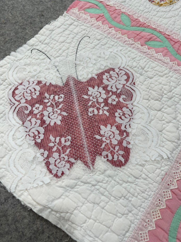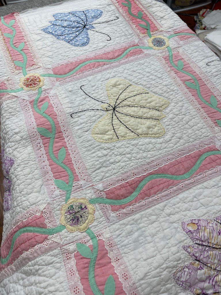 A once lovely 73×73” Butterfly quilt, well used, well laundered and most likely well loved, this quilt needs help. The fabrics are worn and torn over much of the quilt top and the batting…oh my goodness!