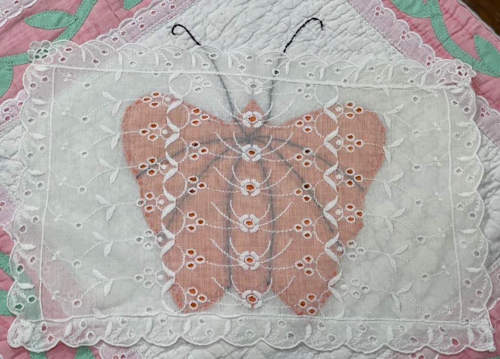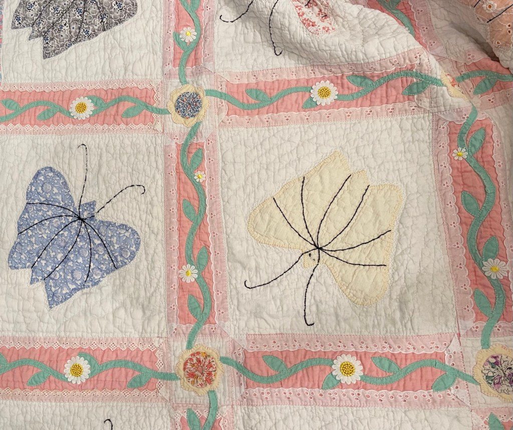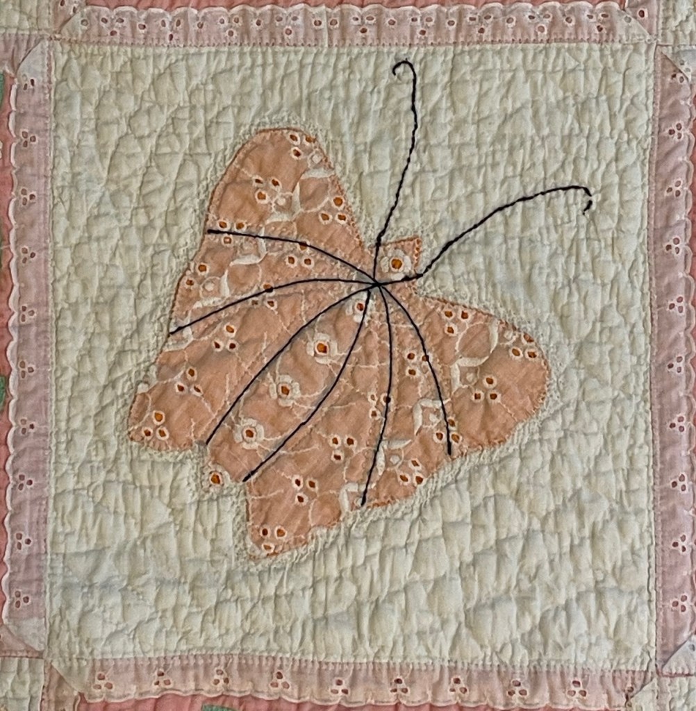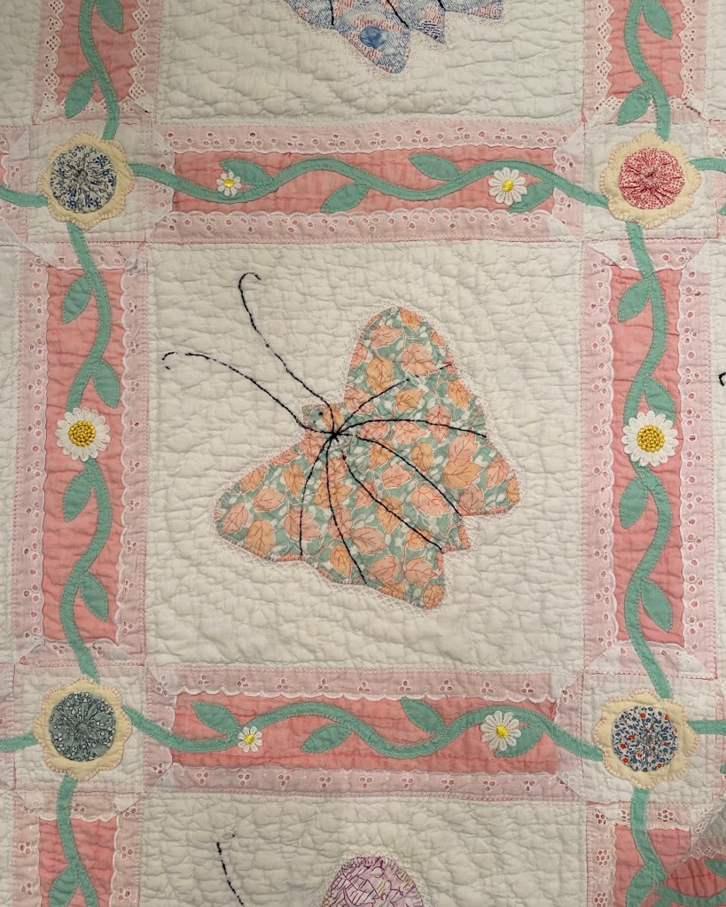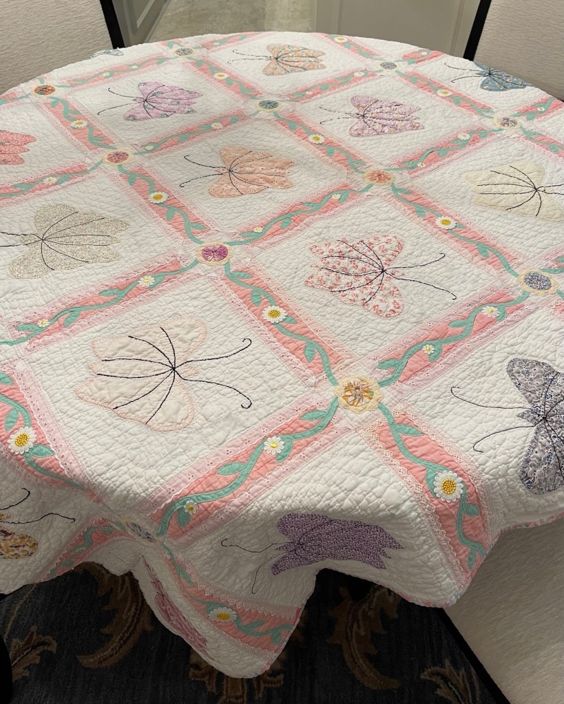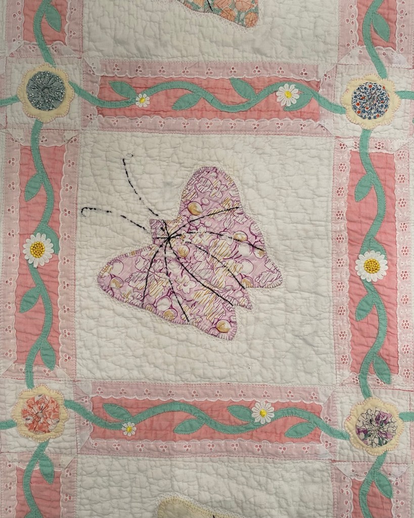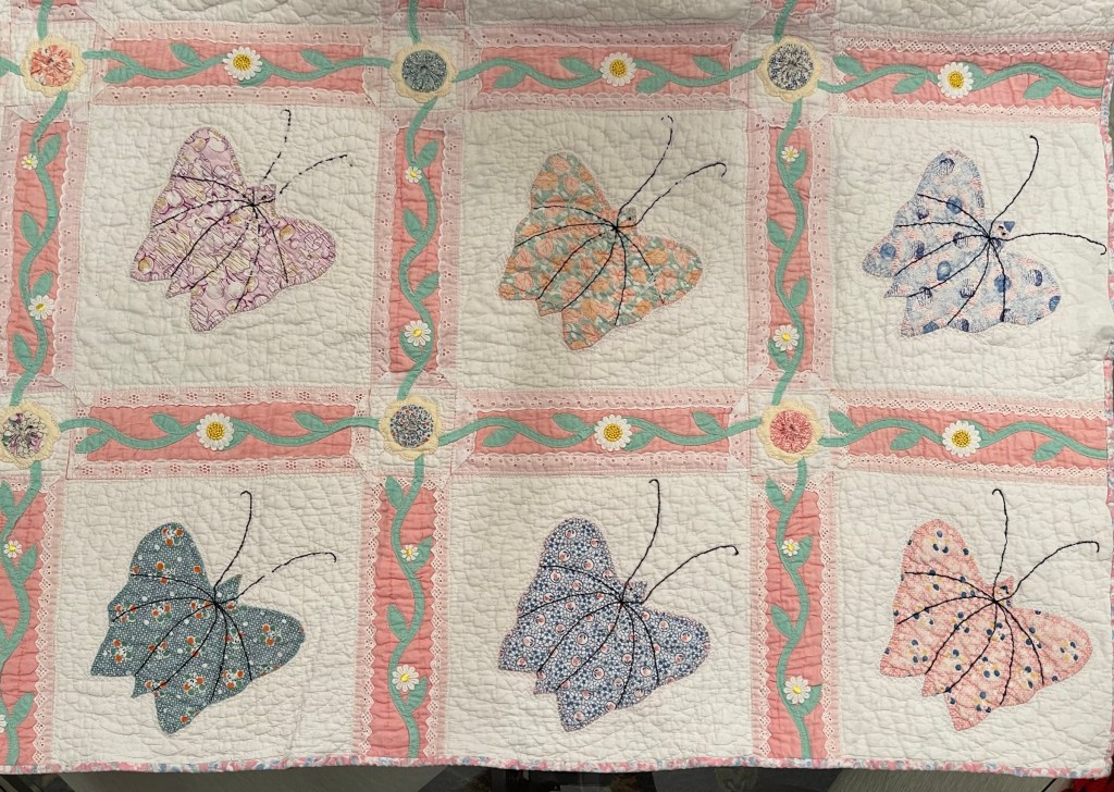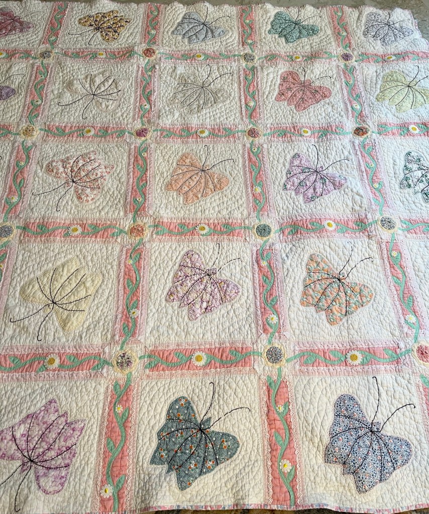 A once lovely 73×73” Butterfly quilt, well used, well laundered and most likely well loved, this quilt needs help. The fabrics are worn and torn over much of the quilt top and the batting…oh my goodness!