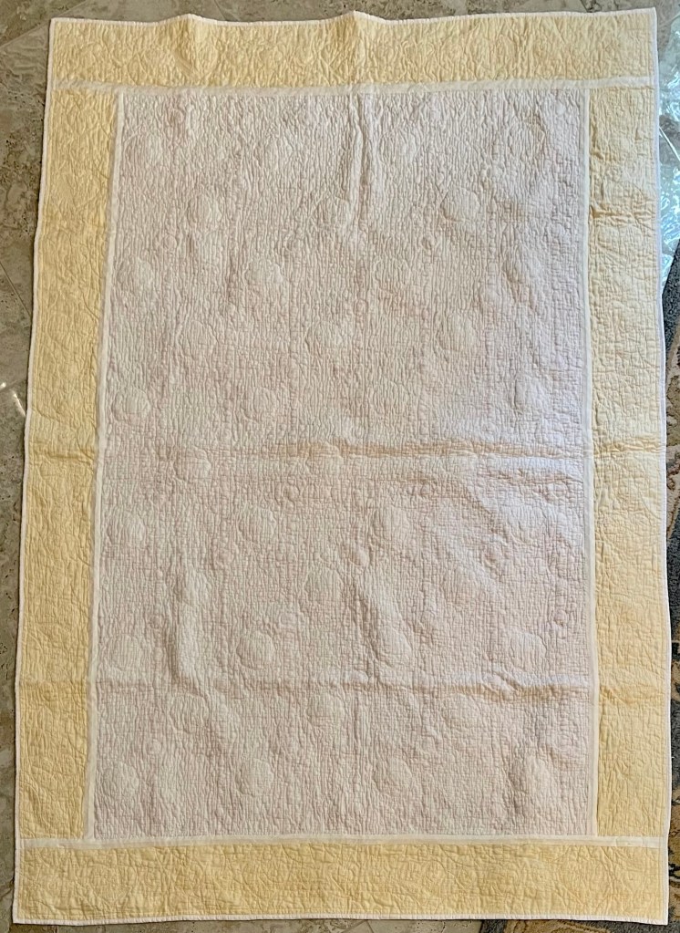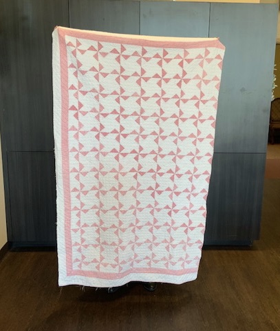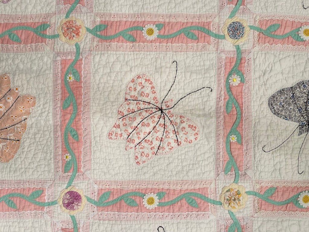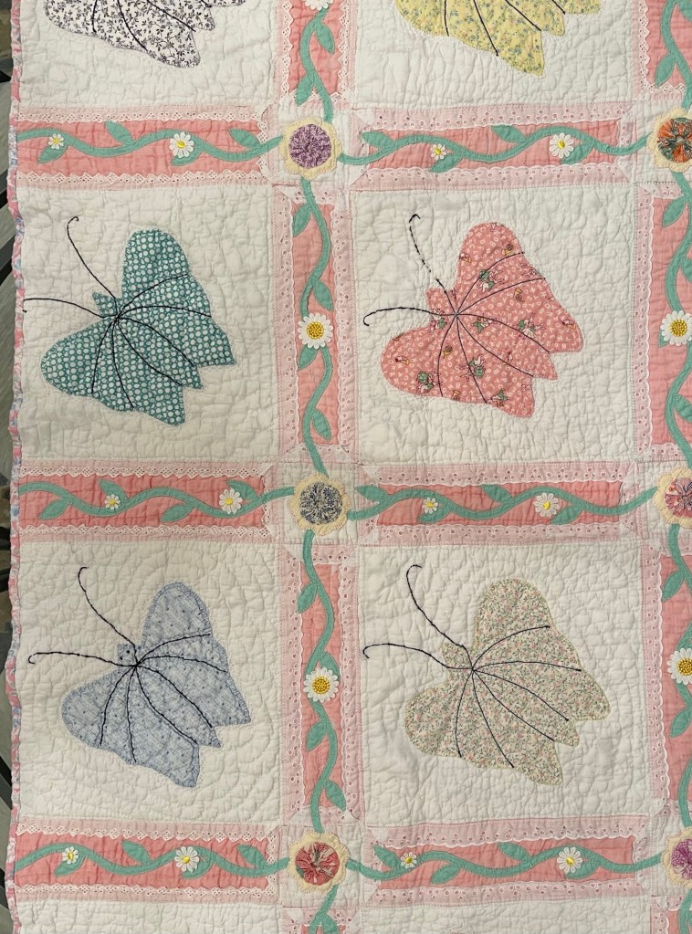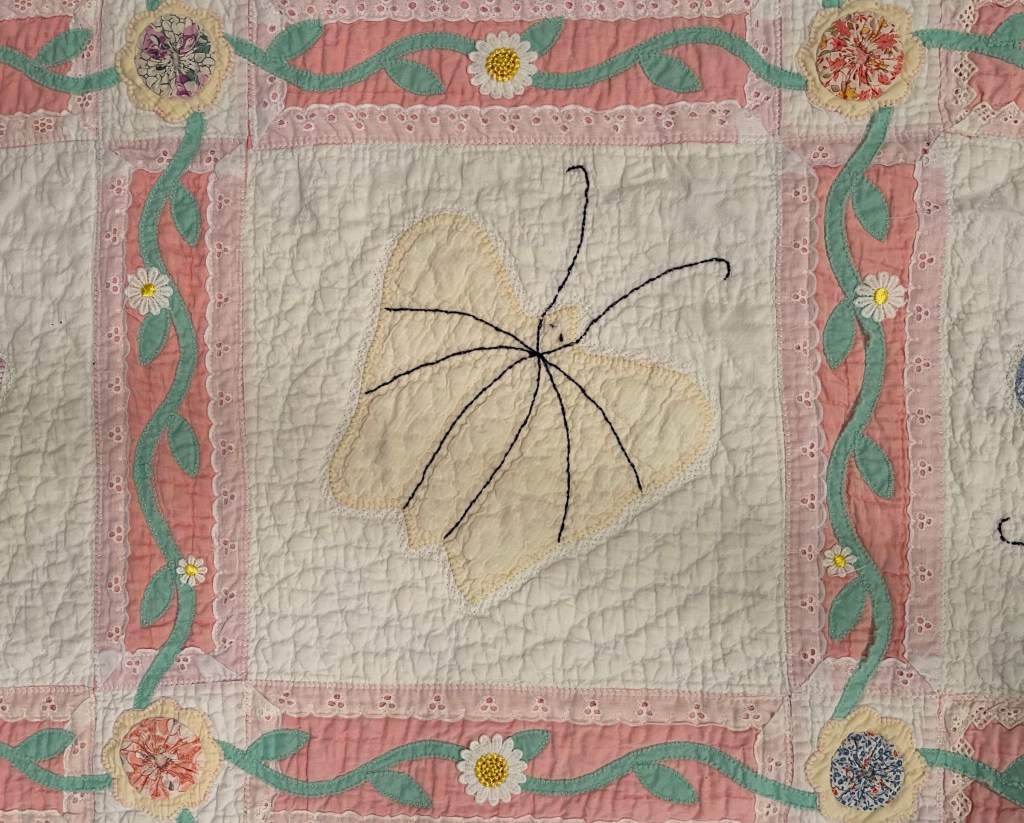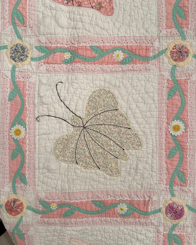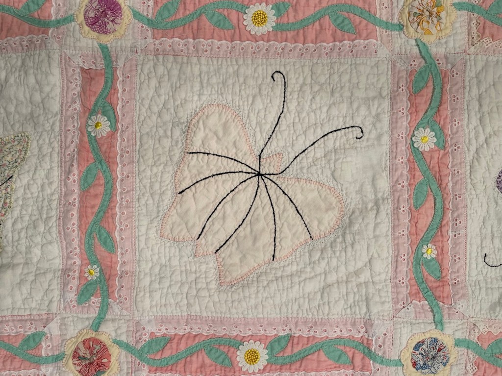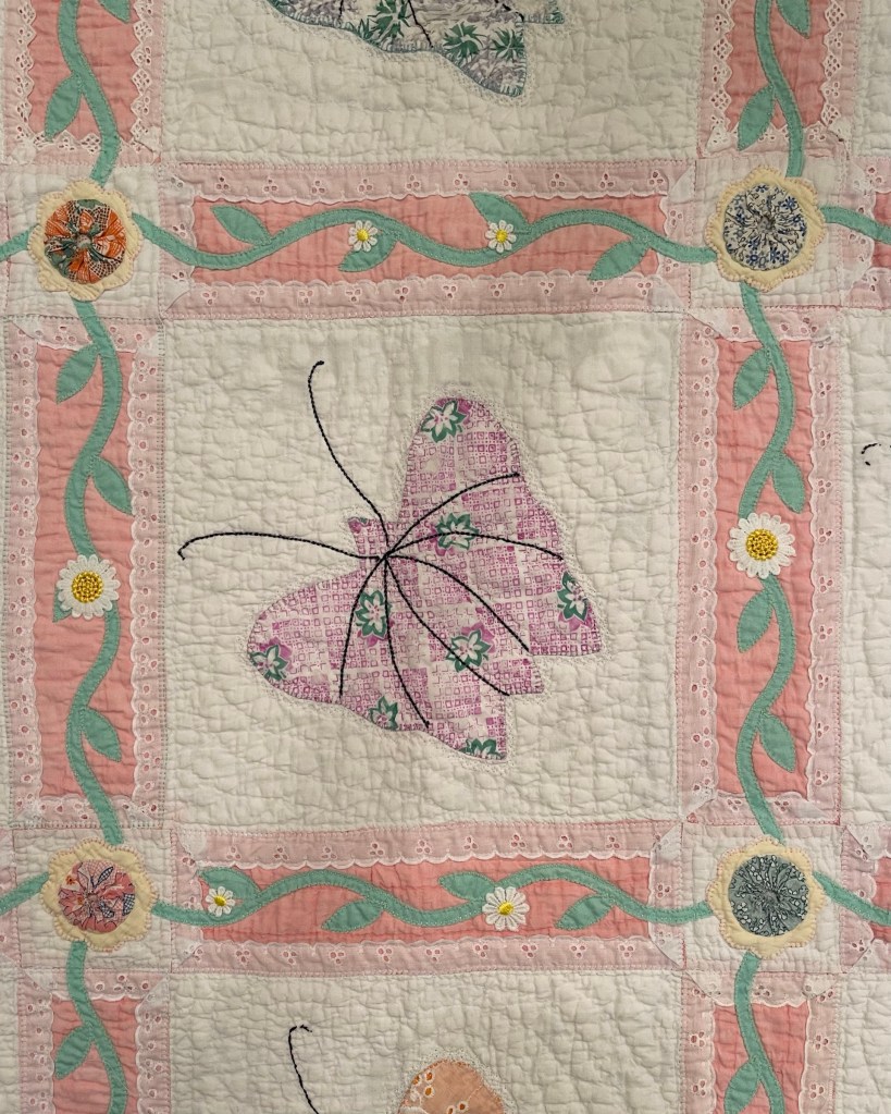 A once lovely 73×73” Butterfly quilt, well used, well laundered and most likely well loved, this quilt needs help. The fabrics are worn and torn over much of the quilt top and the batting…oh my goodness!