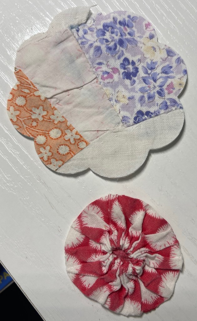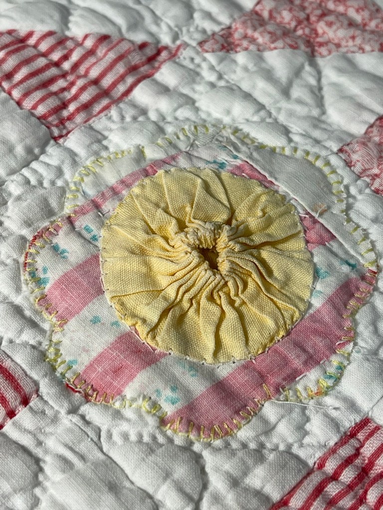 Each of the yellow old quilt flowers gets a vintage yo-yo machine stitched to the center.