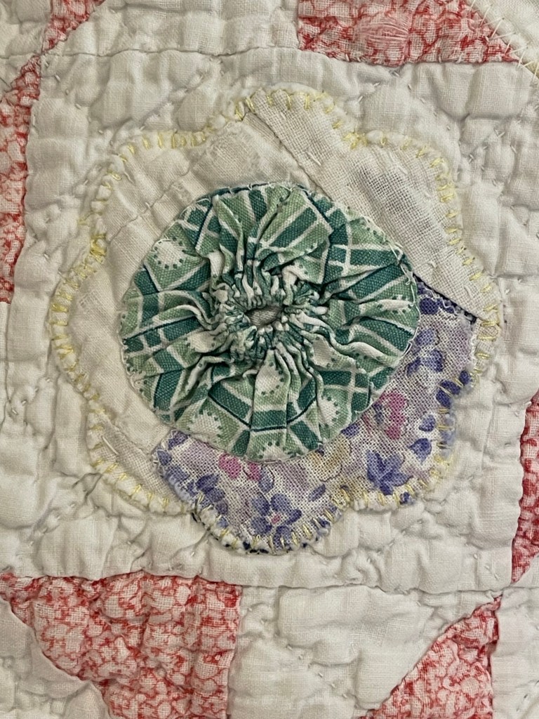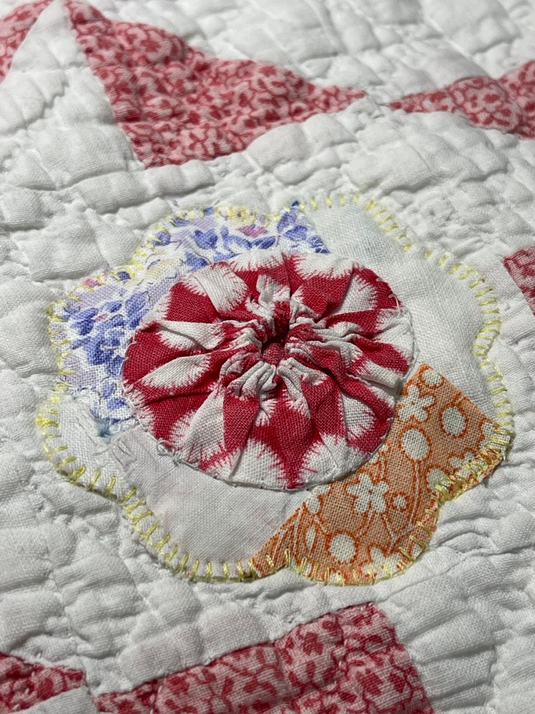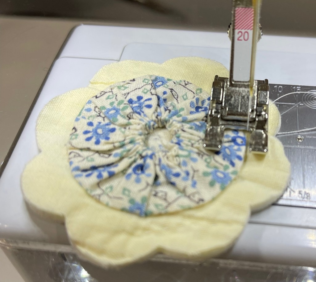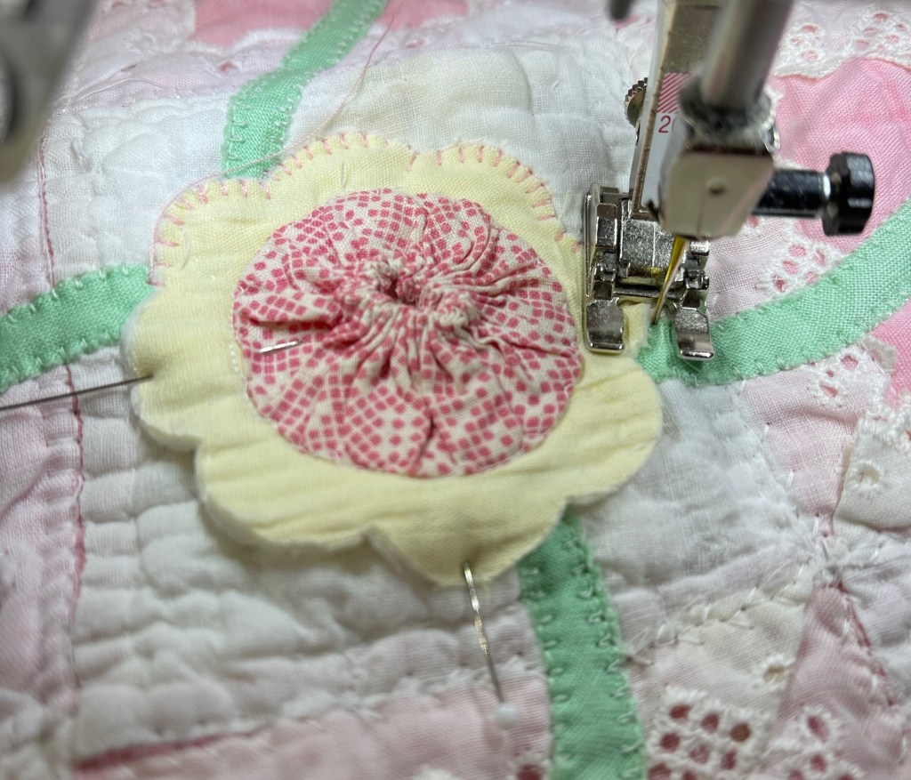 Once the yo-yo’s are secured, the unit is machine appliqued to the quilt.