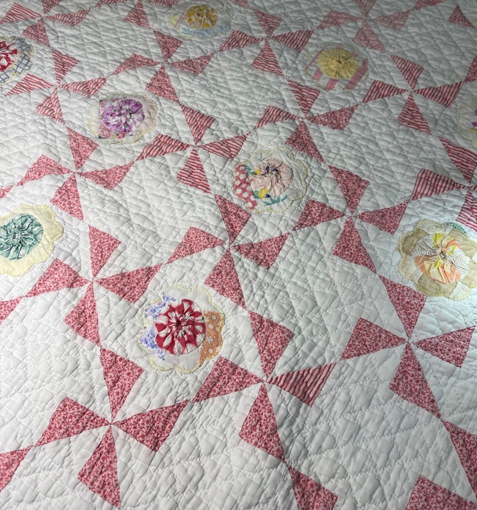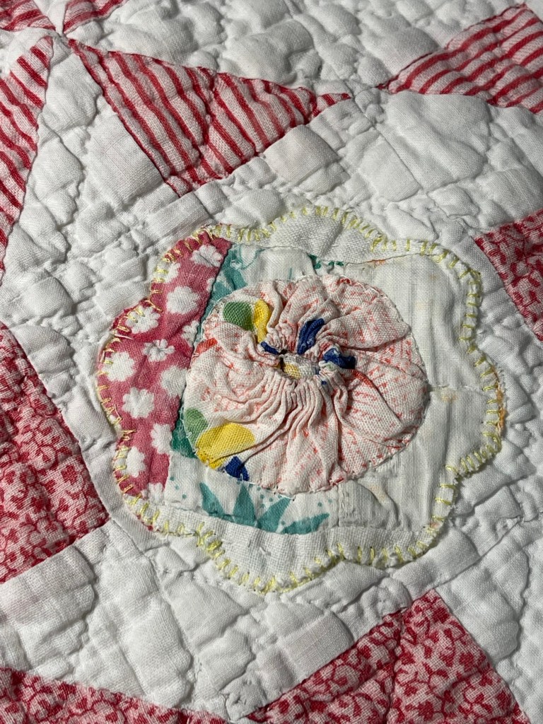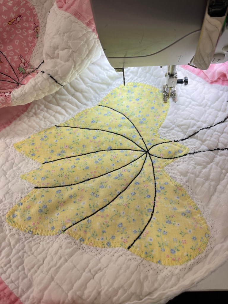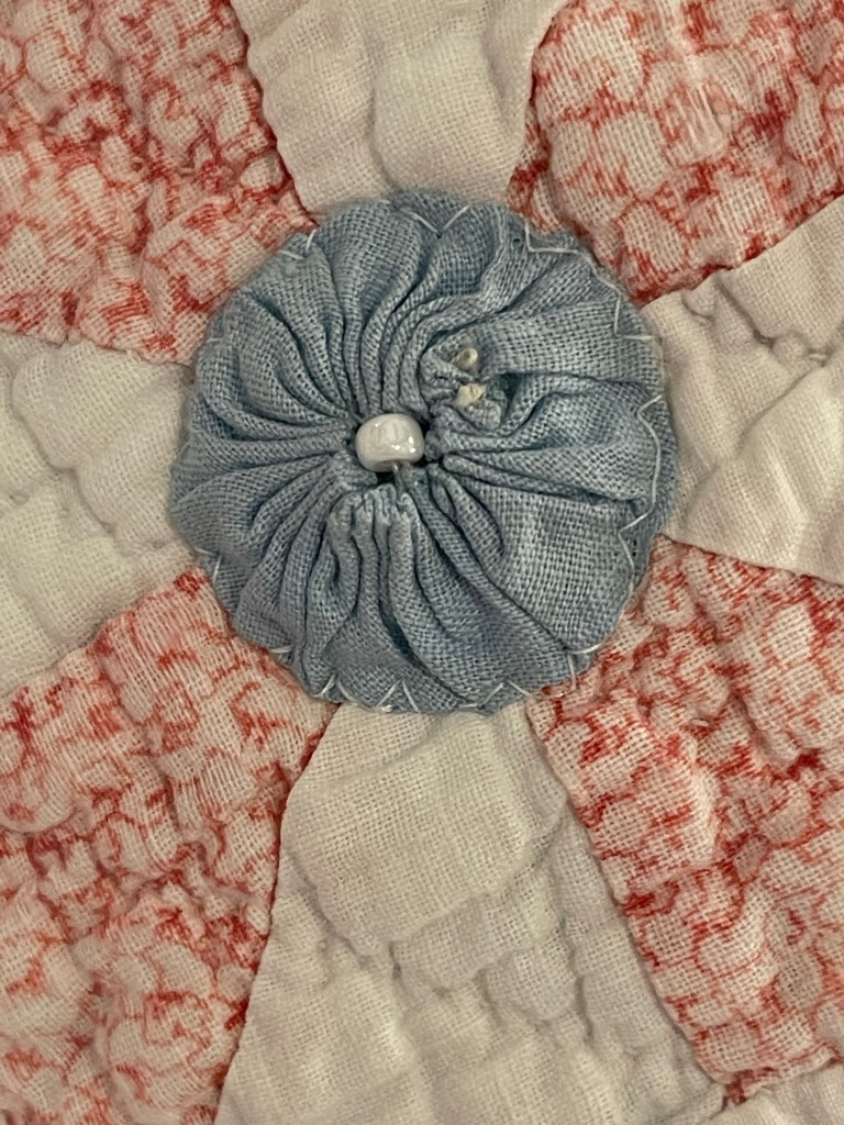Once the yo-yo’s are secured, the unit is machine appliqued to the quilt.