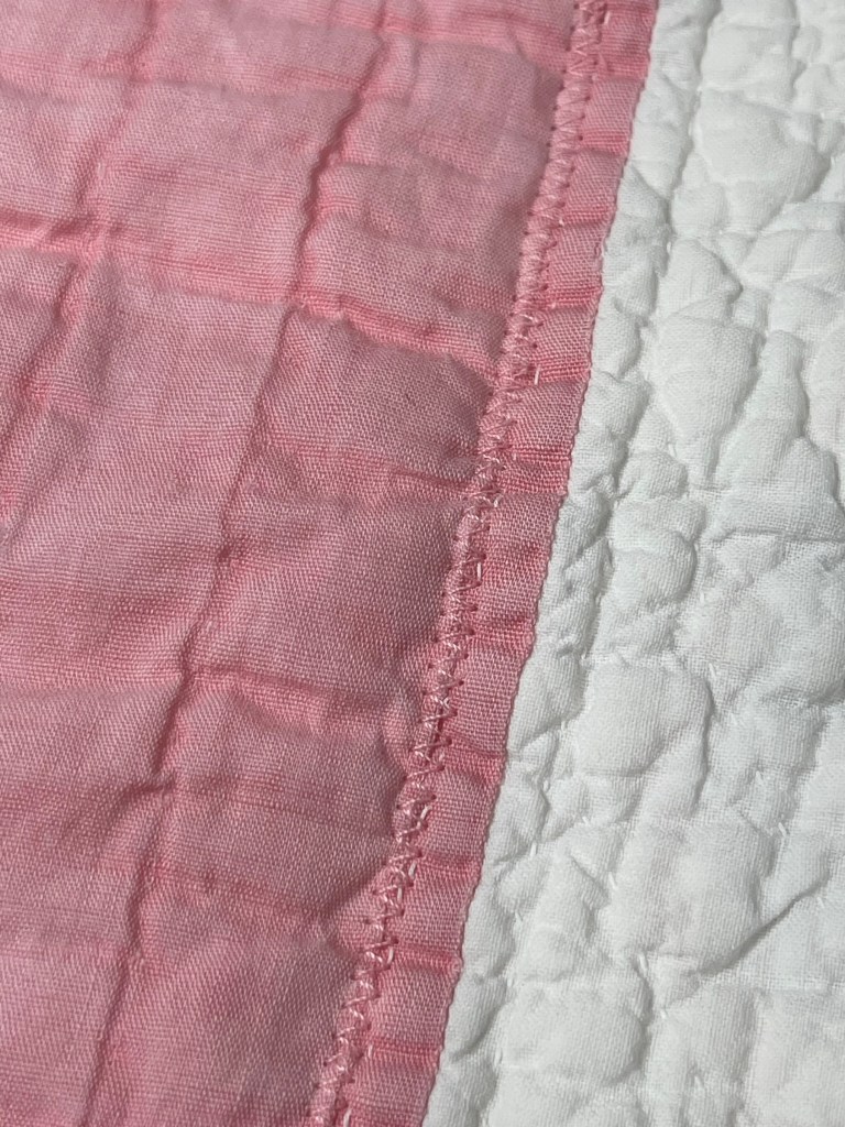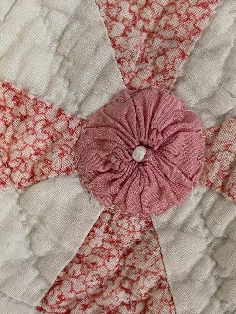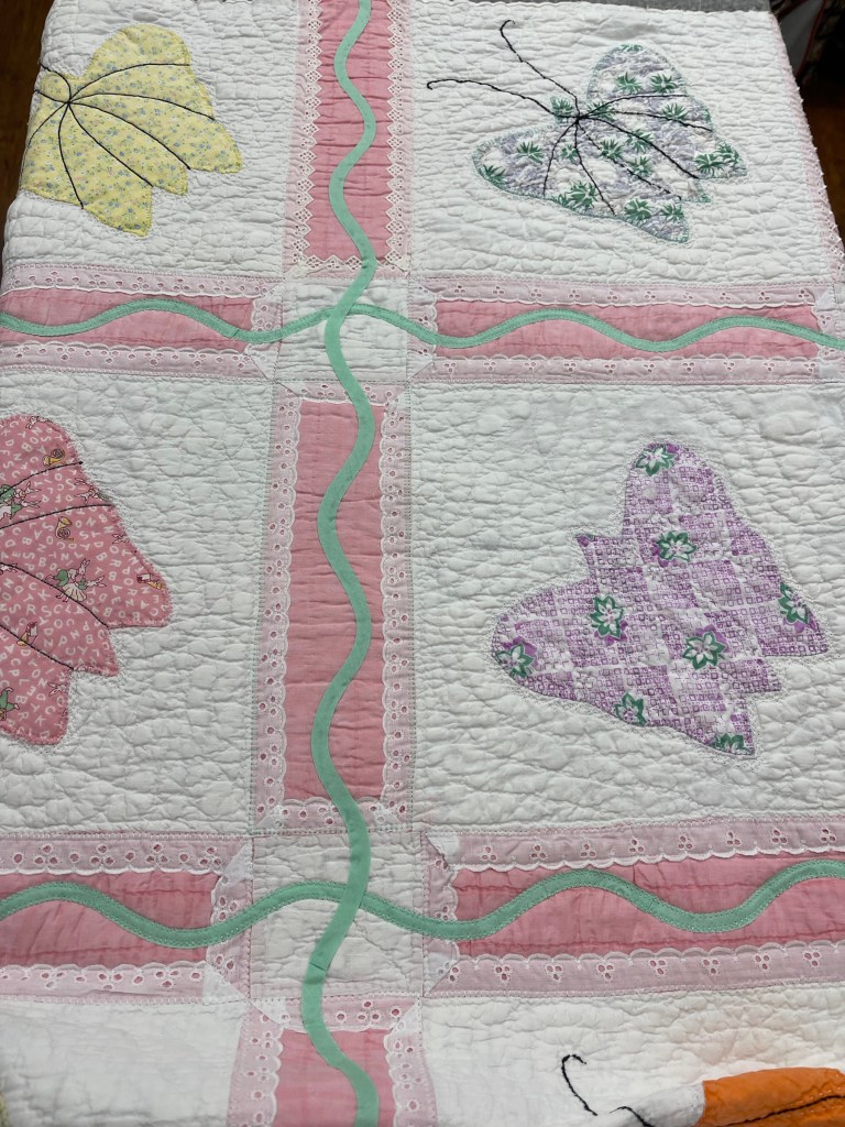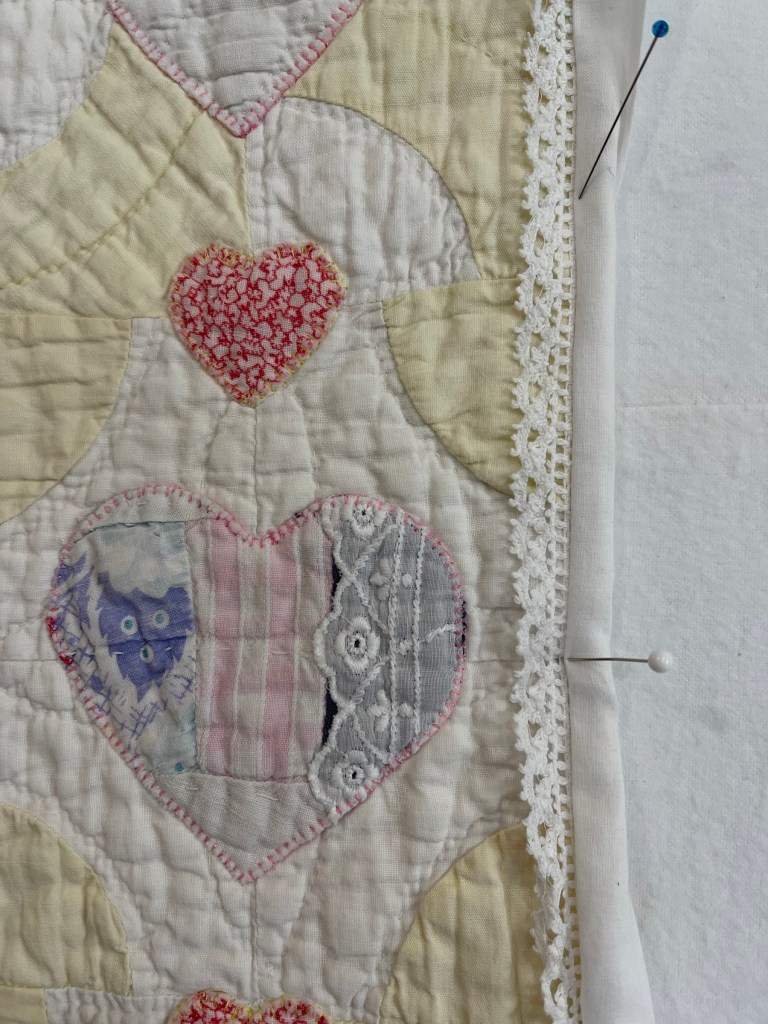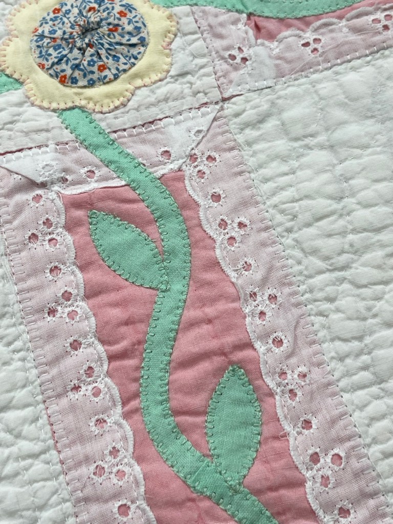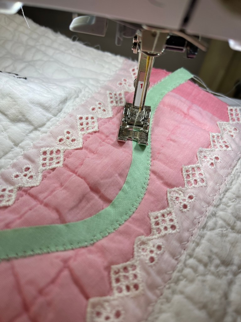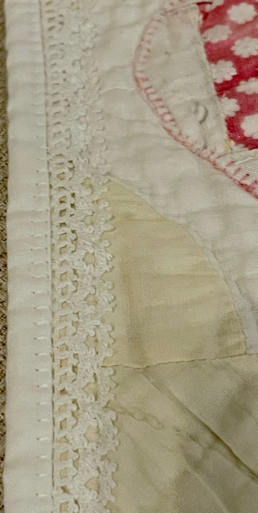 Here’s where I forgot to take pictures. Using various vintage white or very light ivory eyelet trims, I edged each of the sashing strips. Besides liking the look of eyelet, this also brought down the heavy look of the solid pink fabric. Imagine the pic below does not have green vines. 🤪
