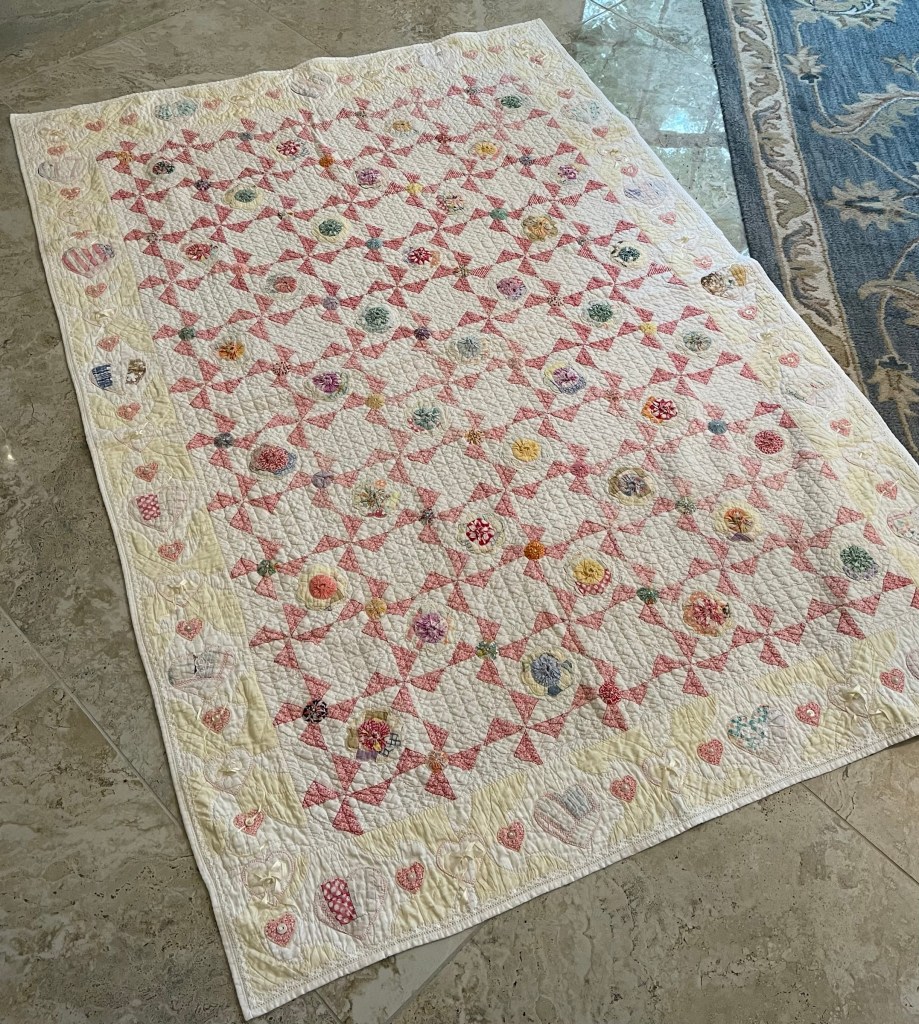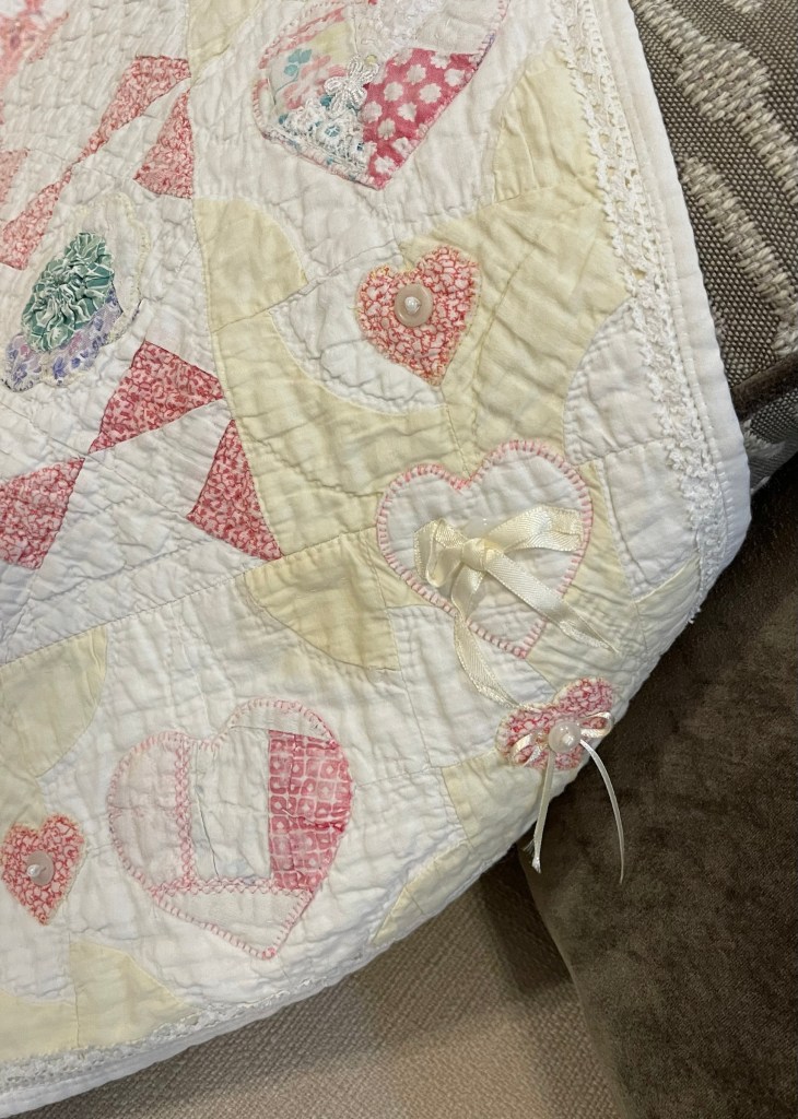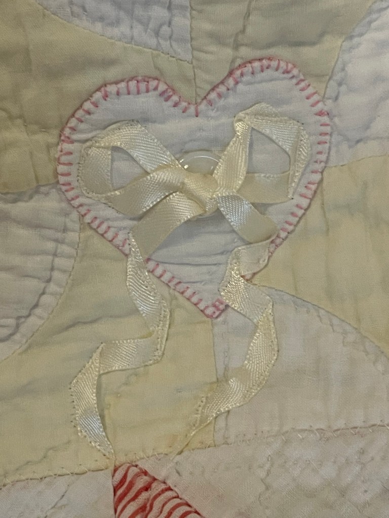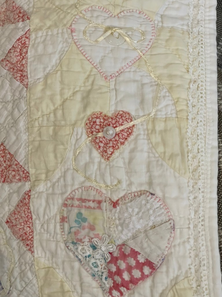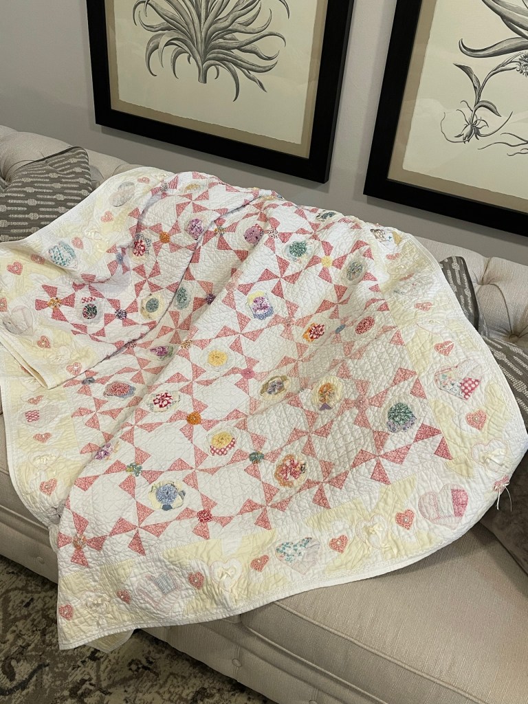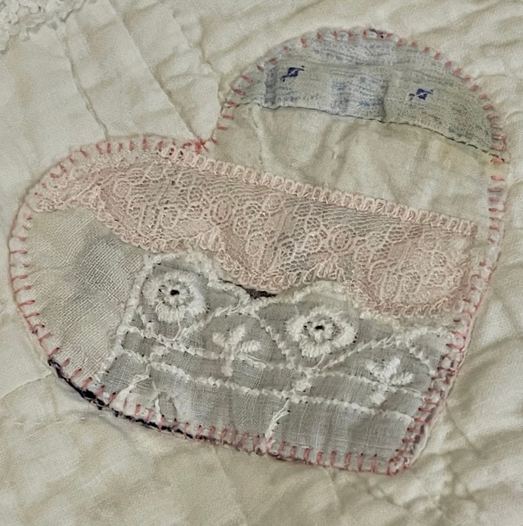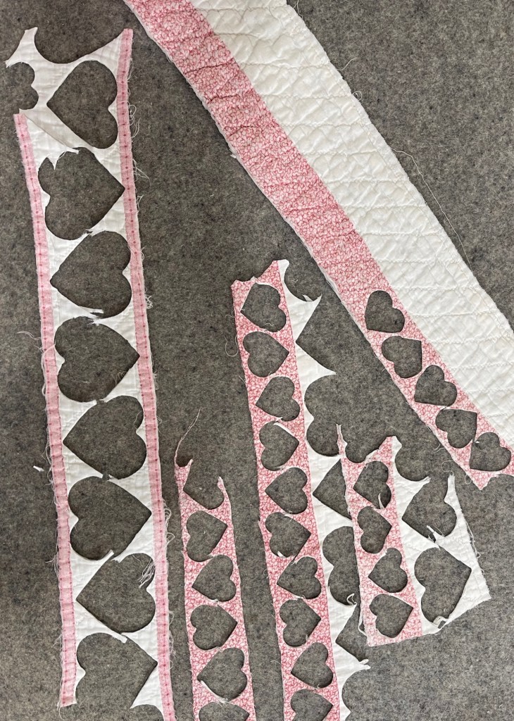 Here’s where I forgot to take pictures. Using various vintage white or very light ivory eyelet trims, I edged each of the sashing strips. Besides liking the look of eyelet, this also brought down the heavy look of the solid pink fabric. Imagine the pic below does not have green vines. 🤪
