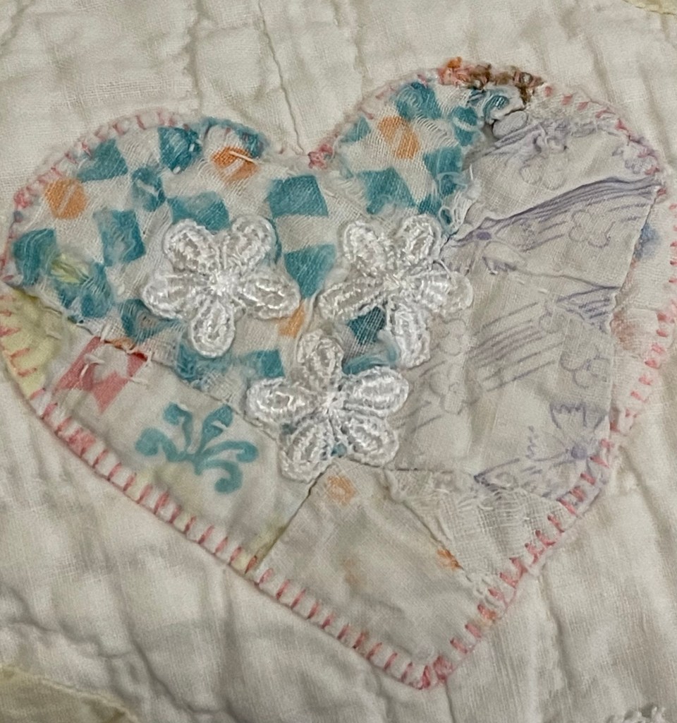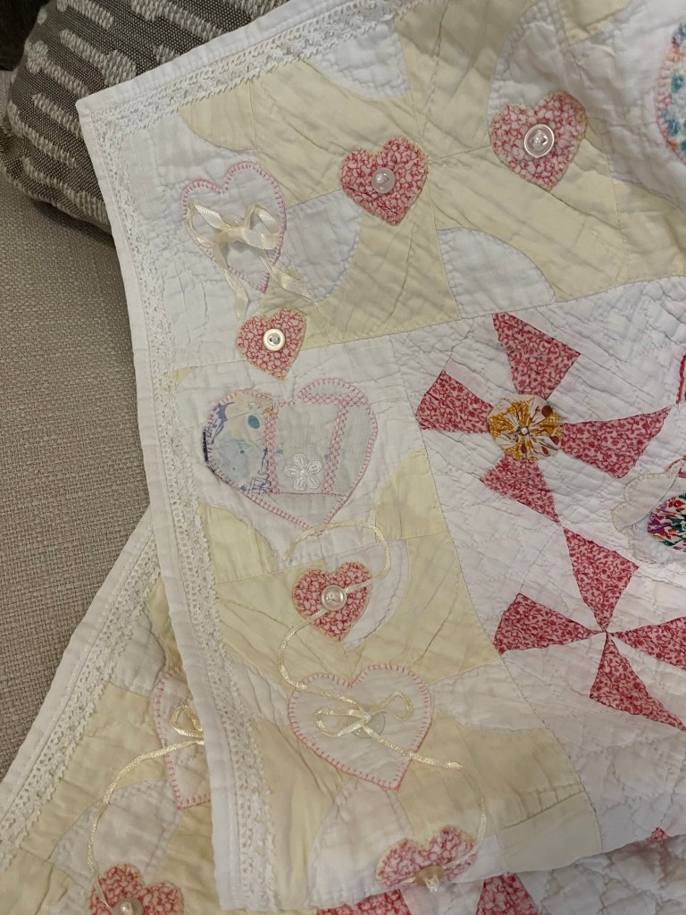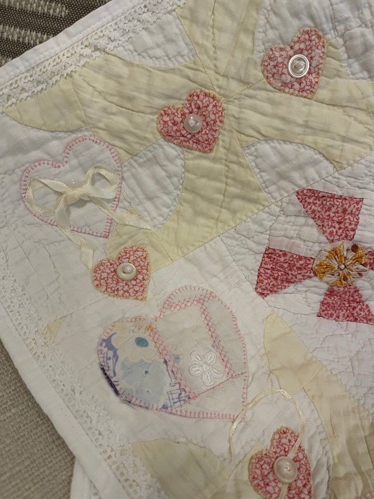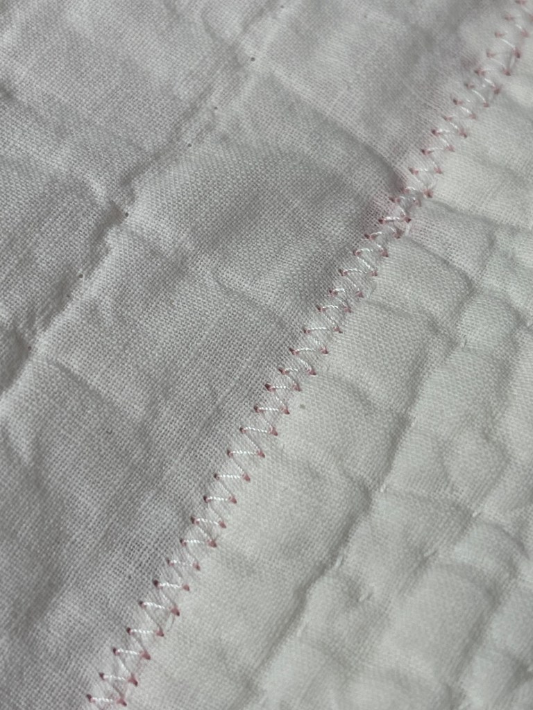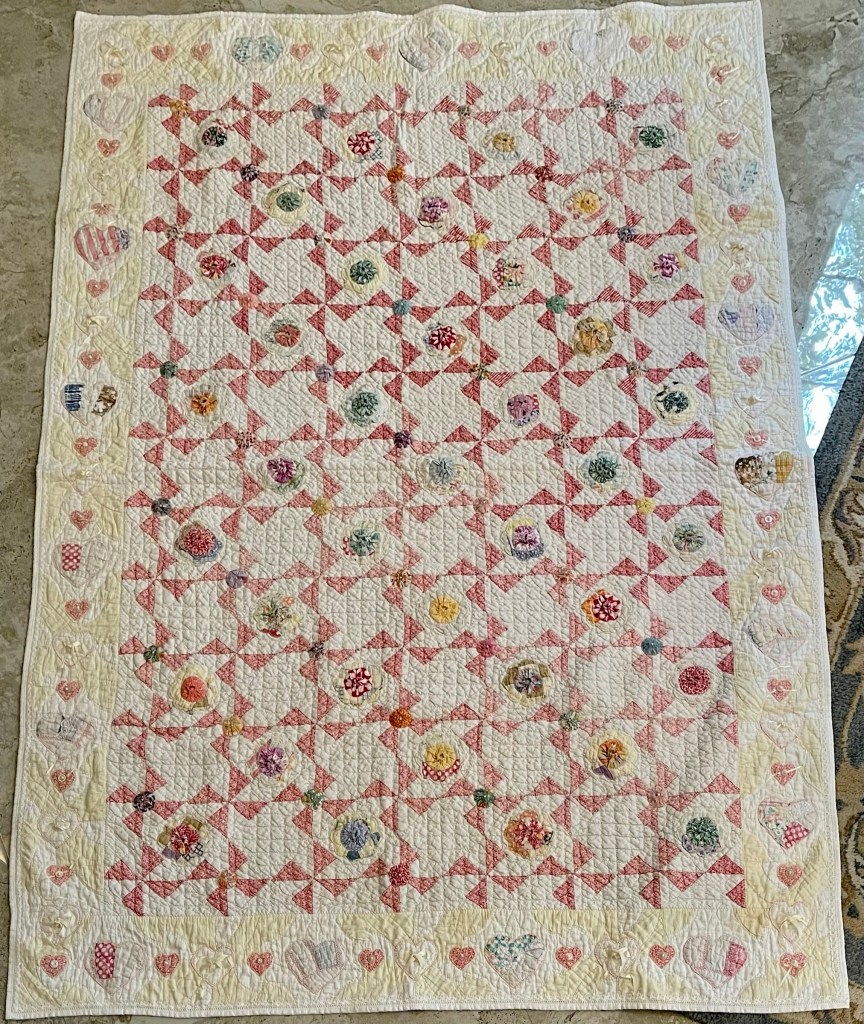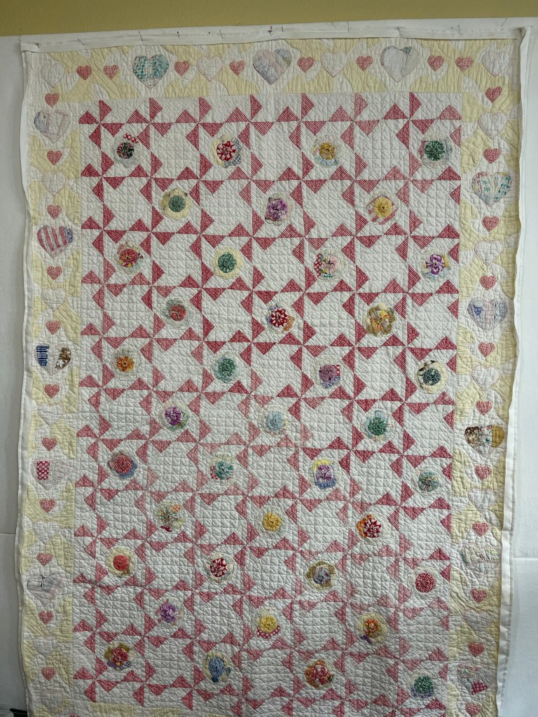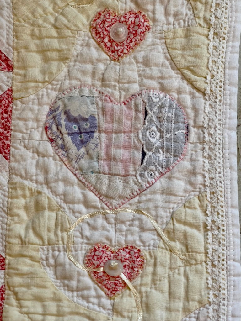 Here’s where I forgot to take pictures. Using various vintage white or very light ivory eyelet trims, I edged each of the sashing strips. Besides liking the look of eyelet, this also brought down the heavy look of the solid pink fabric. Imagine the pic below does not have green vines. 🤪
