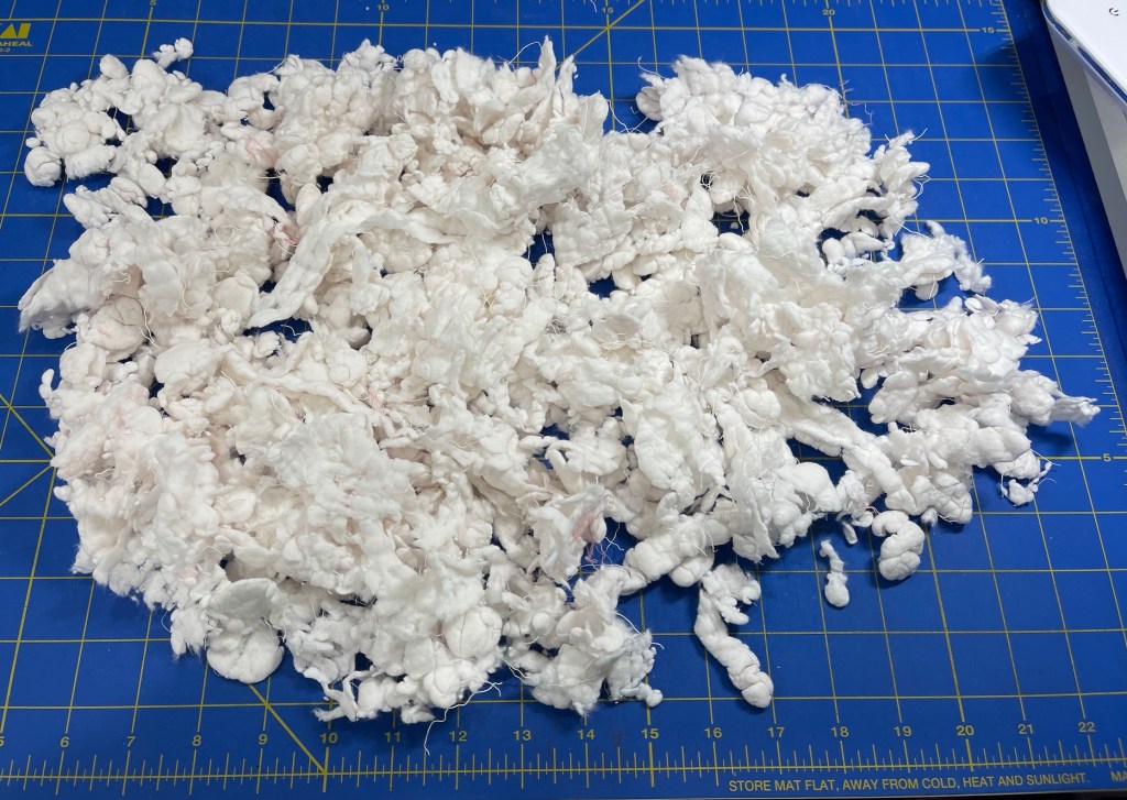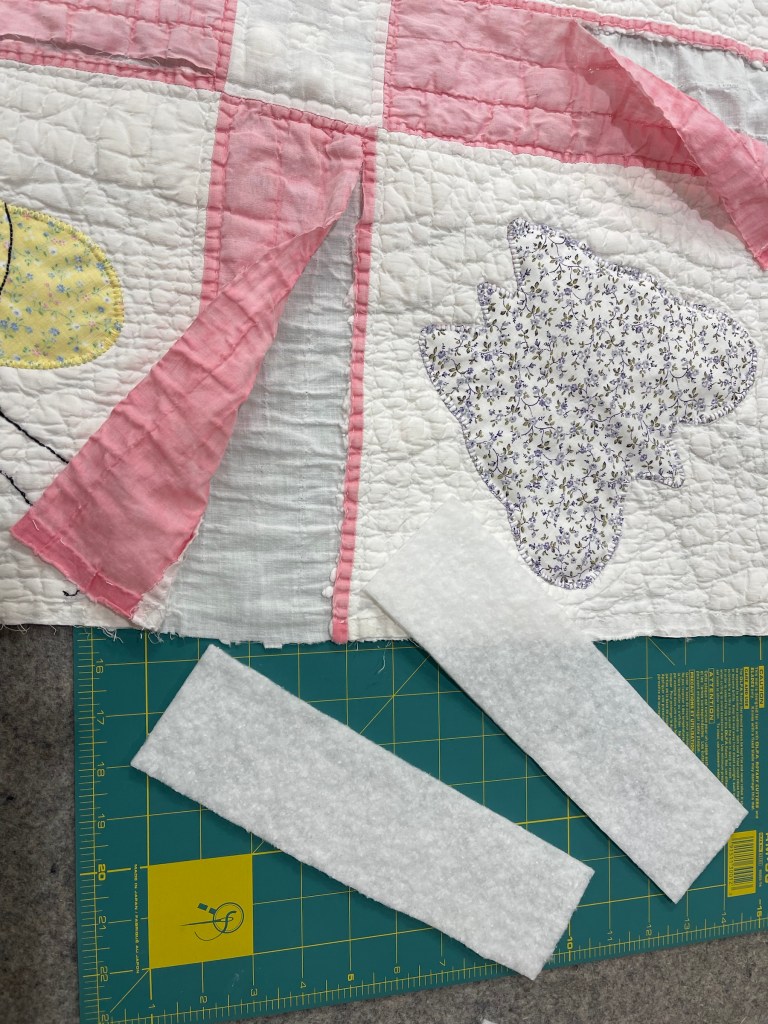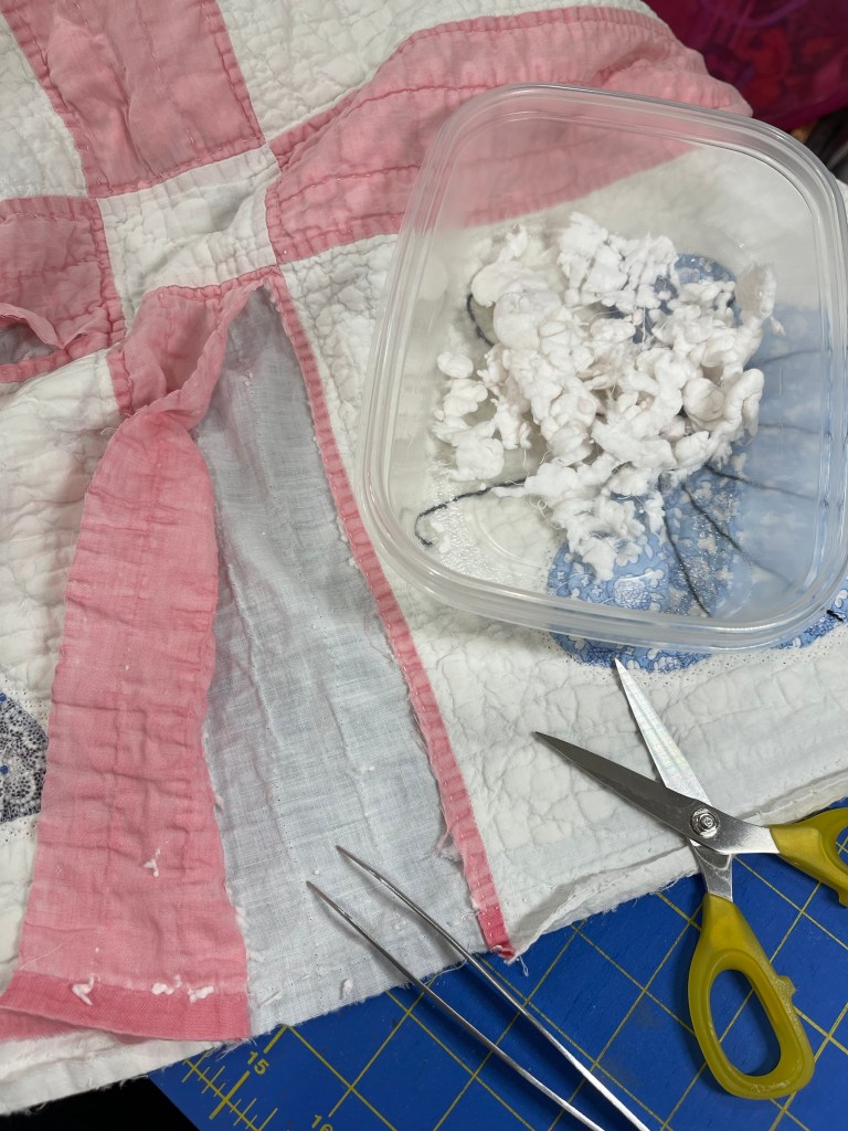 Rather than have a quilt with hard large lumps I decided to experiment and remove the sashing batting. “Oh sure” I thought, this will be fast and easy…well…I was wrong. ☹️ I ended up needing to slice open the long side of the sashing, removing the remaining quilting stitches and pulling out the lumpy white cotton batting.