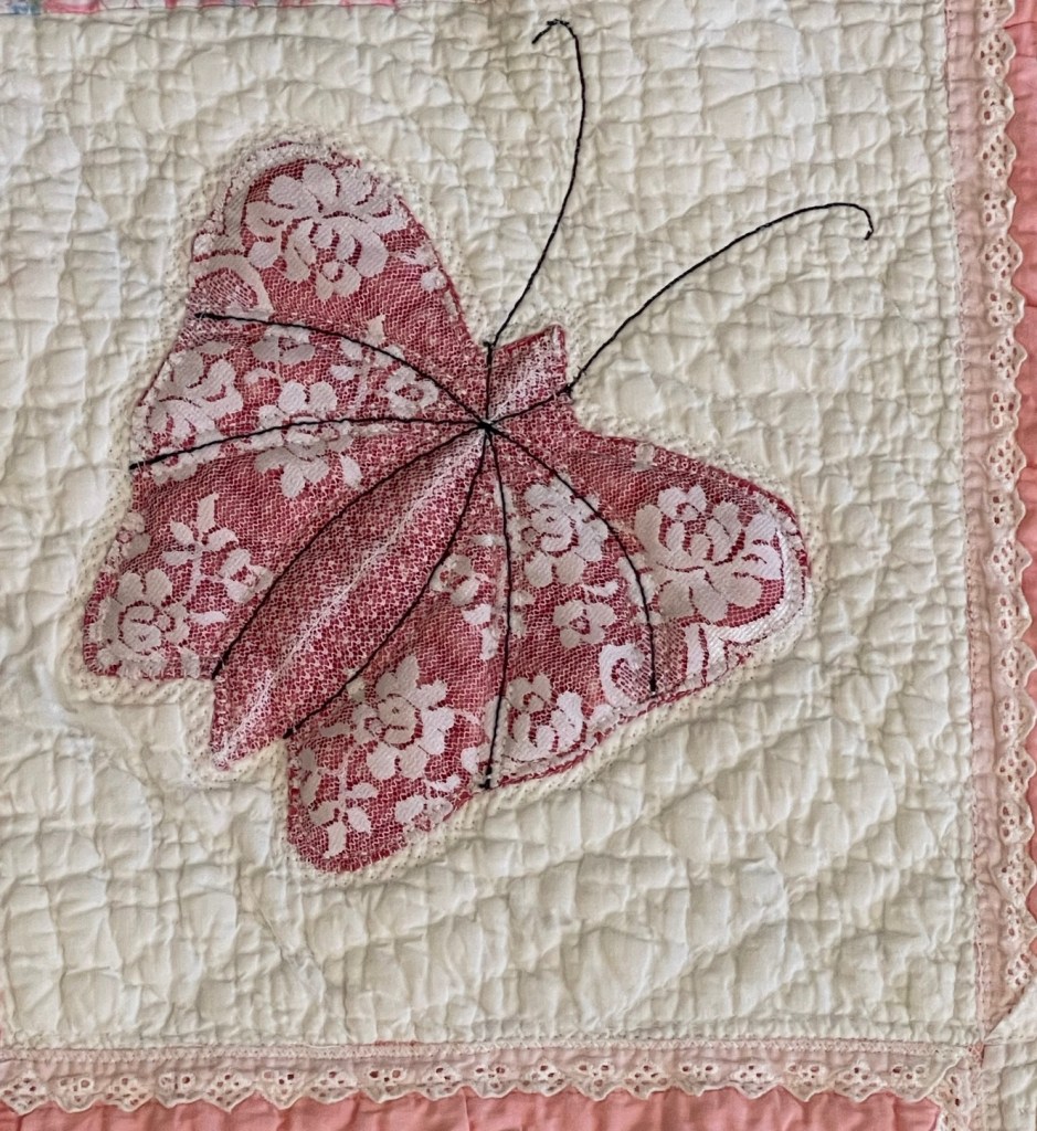And the batting in the sashing strips has migrated to form hard lumps. The picture below shows a lump that is at least a half inch thick. The butterfly blocks are heavily hand quilted and most if not all the batting stayed in place. Sadly the sashing strips have only 2 straight lines of quilting and time and use has caused many of these straight stitching lines to pop (break).