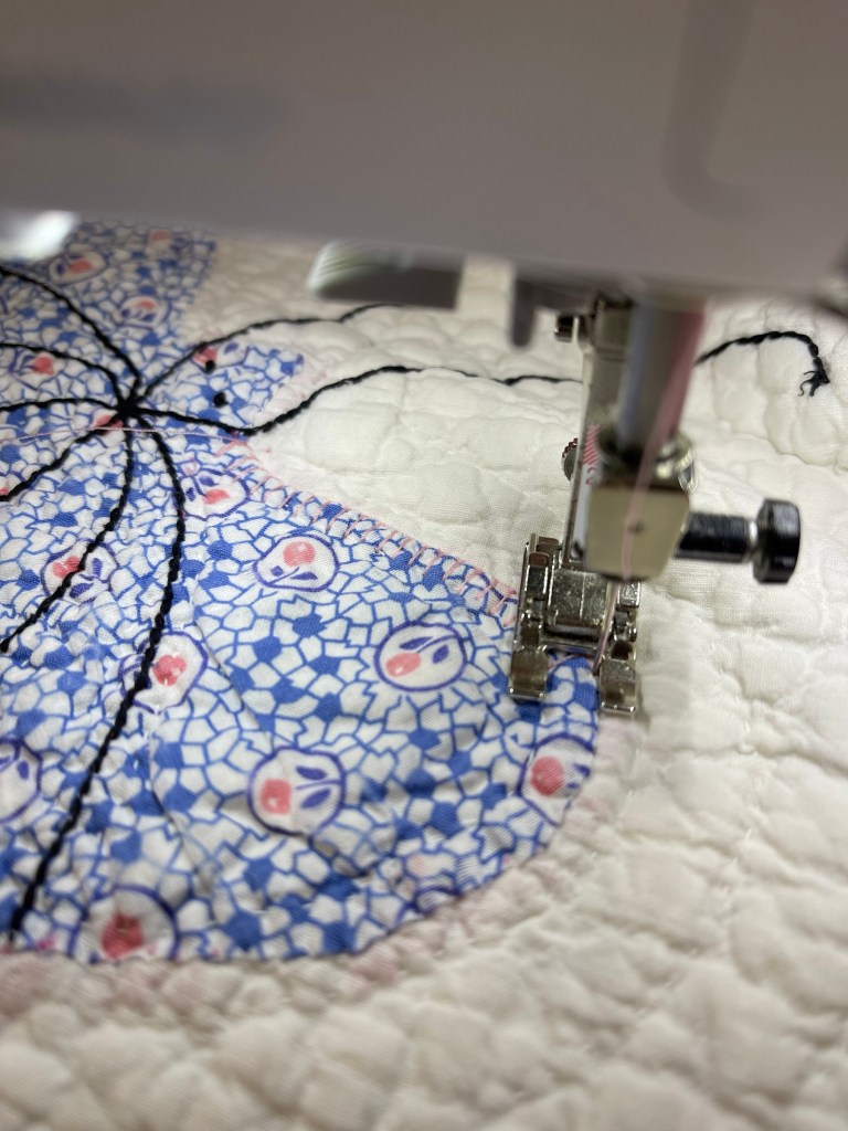 There’s so much more to tell you about in this picture above. After pinning the motif in place I raw edge machine applique stitched around the outer edge.