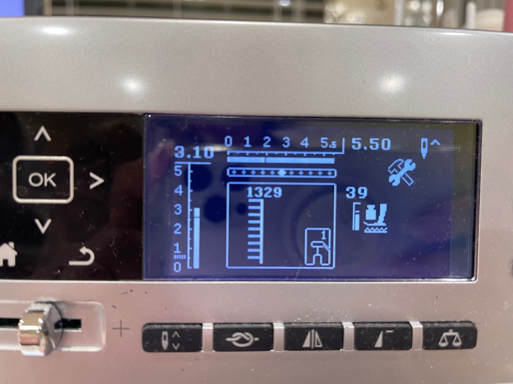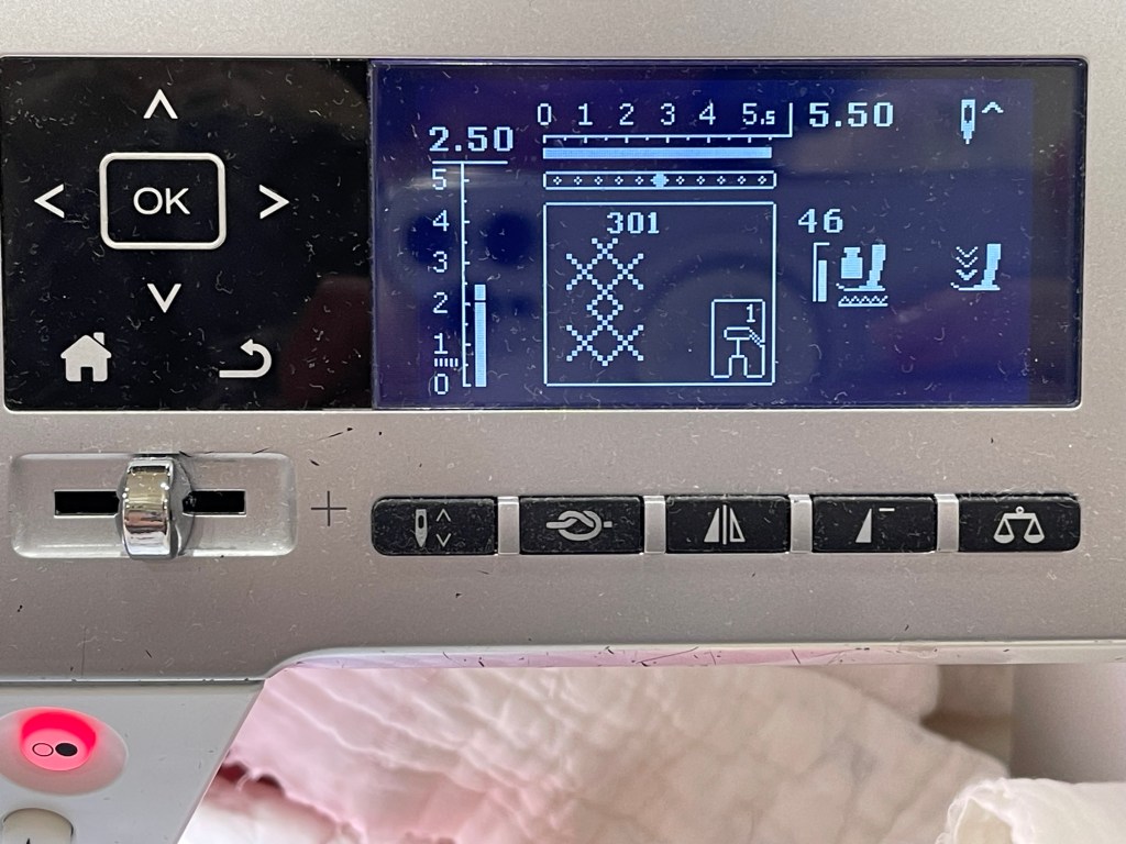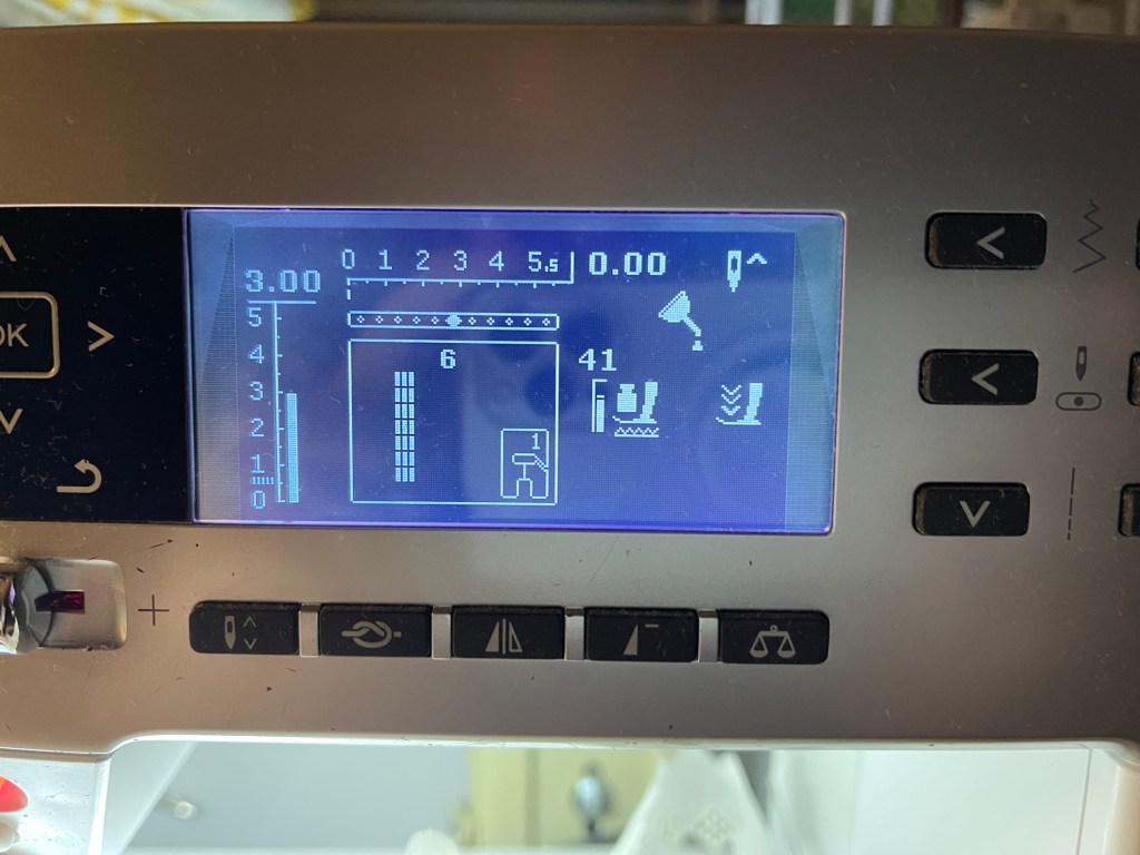 Next, using a 12 weight black thread from Aurifil and the Triple Stitch on my machine I stitched the black lines. Below you’ll find what the stitches look like on my sewing machine screen:
