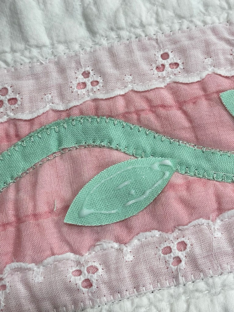 The green vines, cut on bias, are held in place with Elmer’s Washable School Glue and you may notice the glue bottle has a blue tip? it’s the end of a mechanical pencil and produces such a nice narrow line of glue!