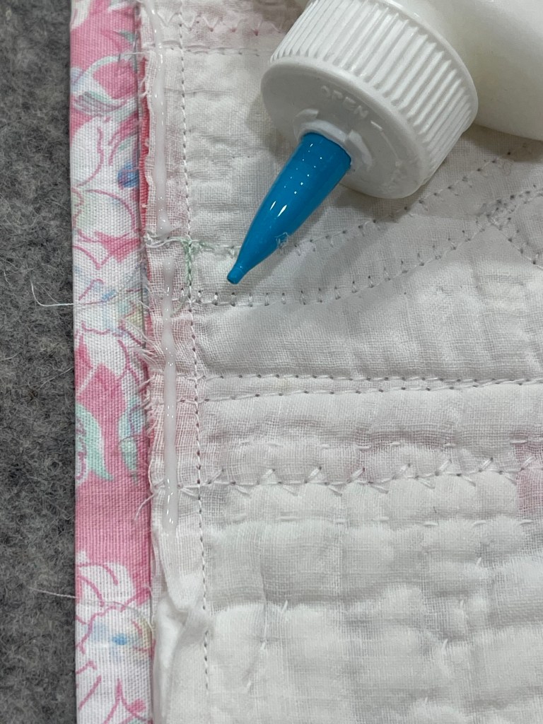 Success! I was “pin free” as I hand stitched the binding down. Note: if trying this, do not!!!…do not glue close to or on the machine stitch line. It is very difficult to hand stitch your binding closed thru dried glue!