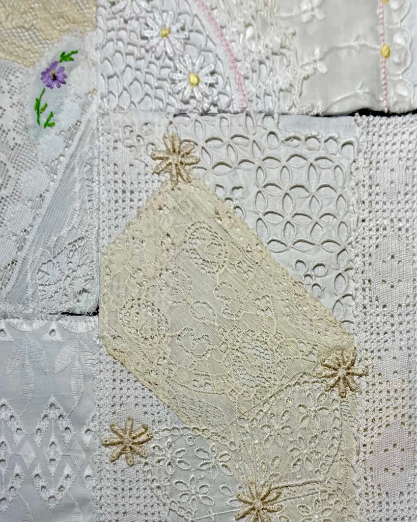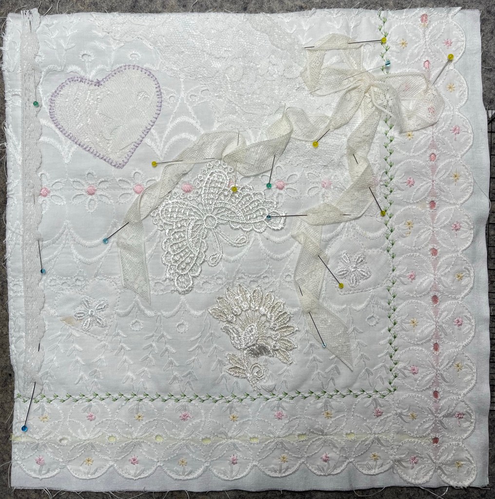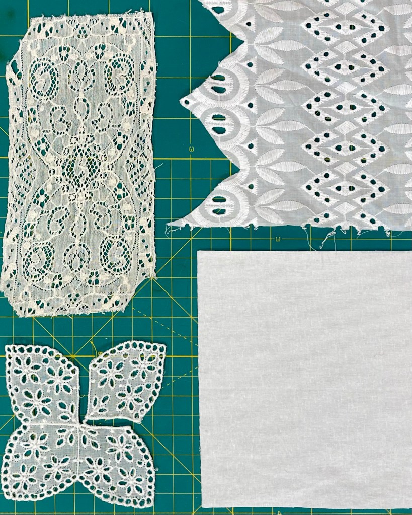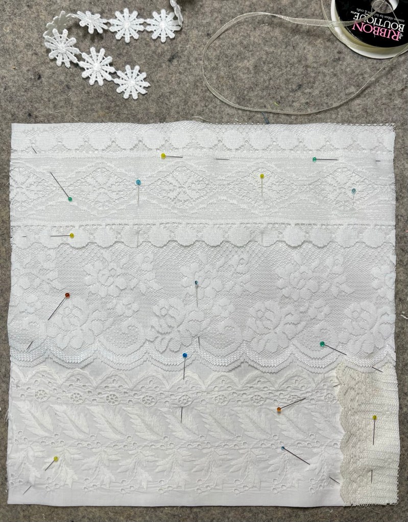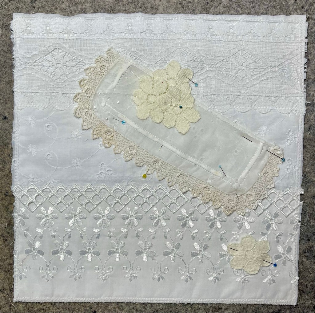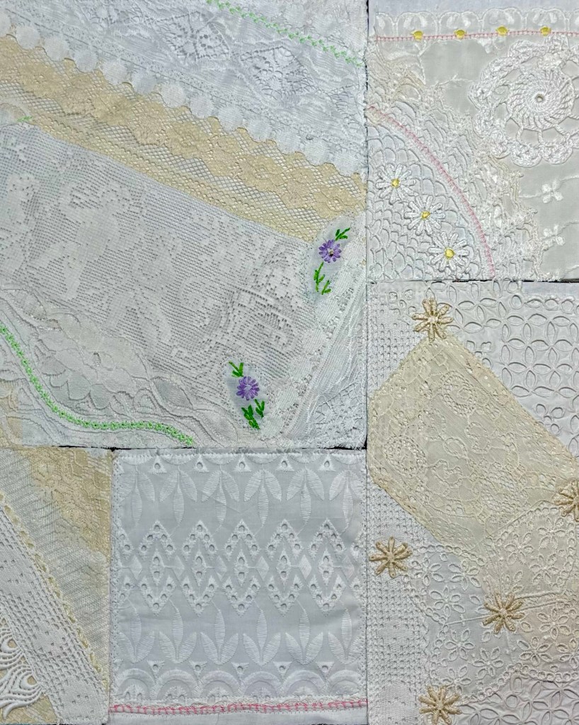I began by making simple blocks randomly embellished with trims and laces and eyelets with a very small pop of color here and there.