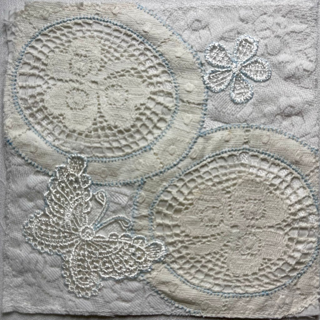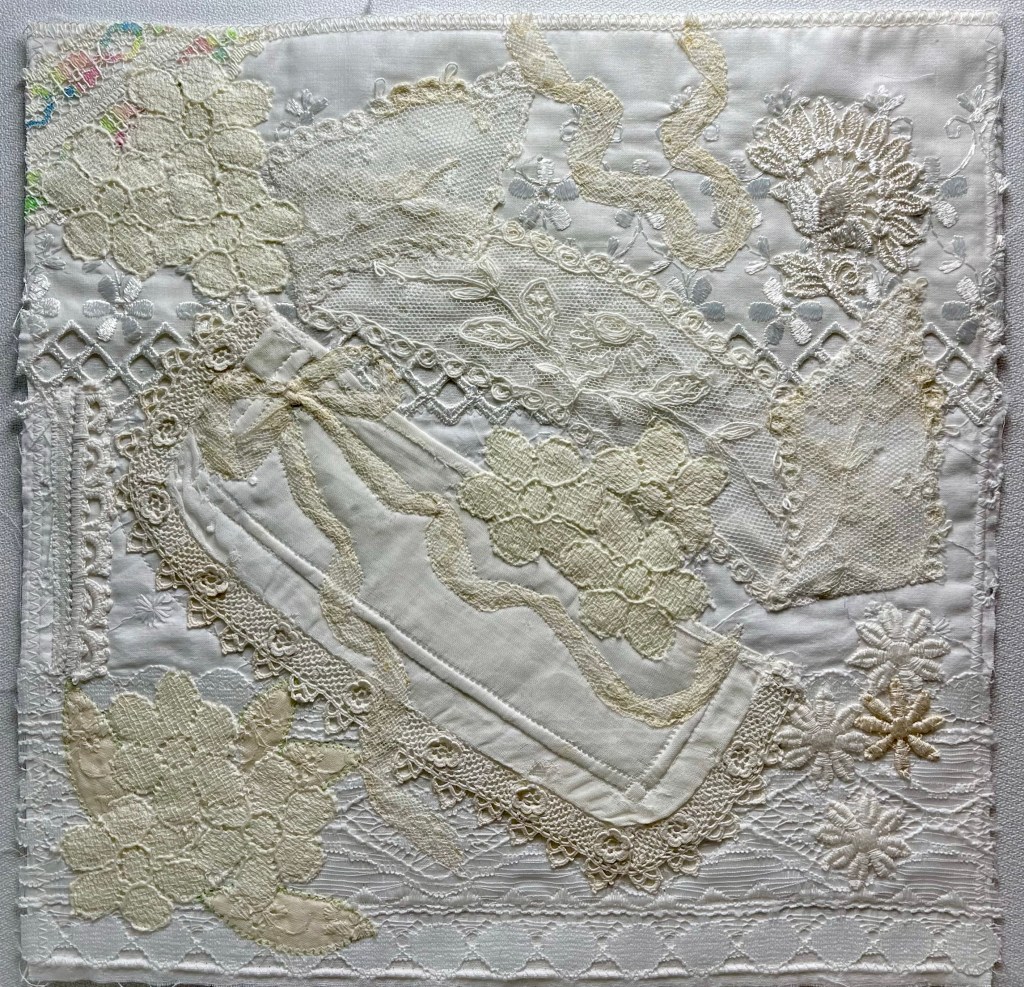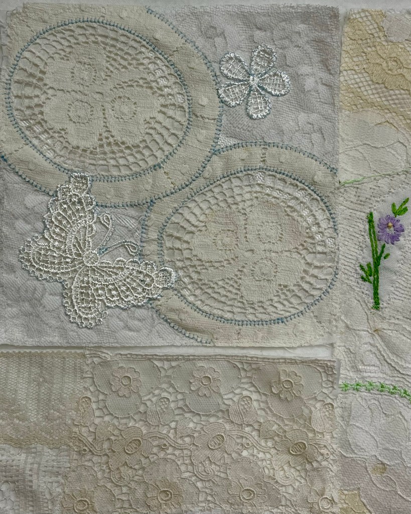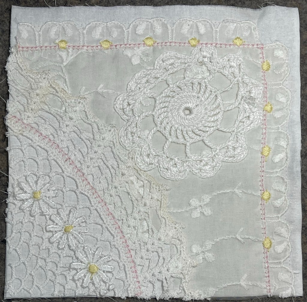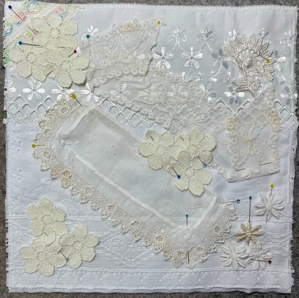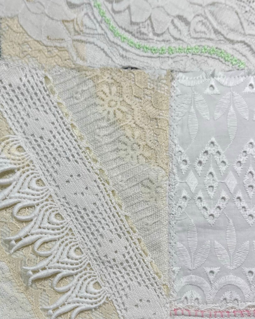 I began by making simple blocks randomly embellished with trims and laces and eyelets with a very small pop of color here and there.