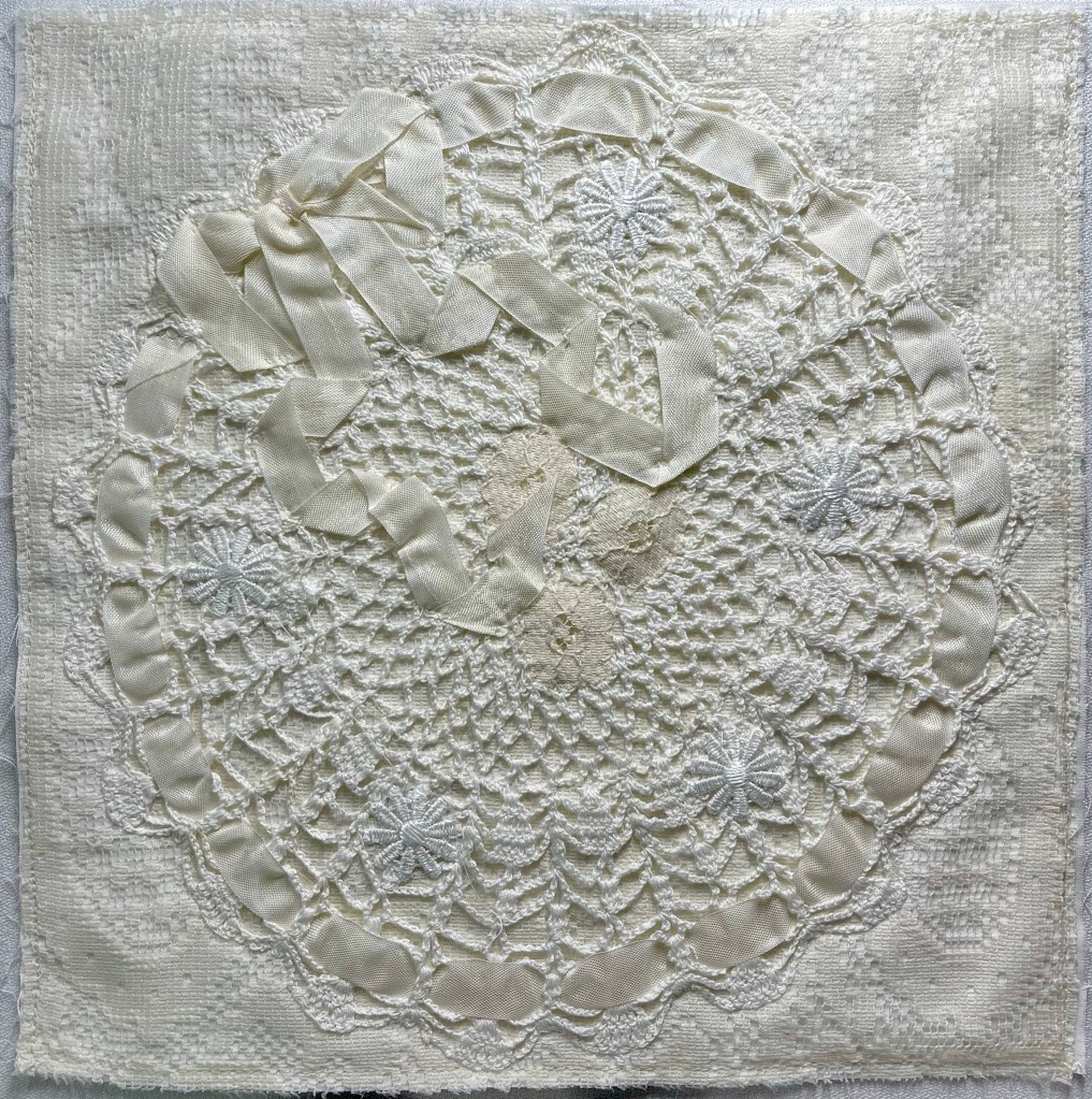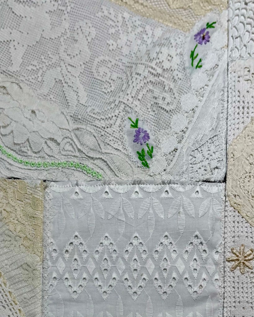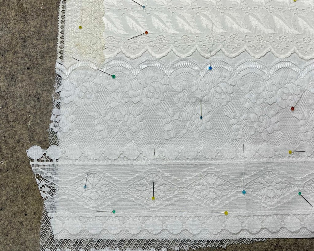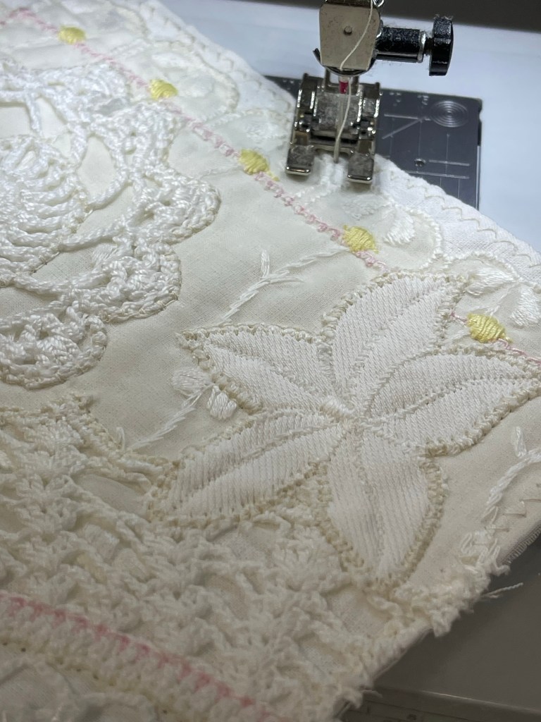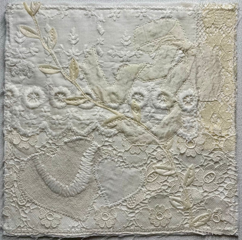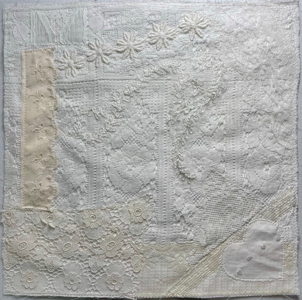 I began by making simple blocks randomly embellished with trims and laces and eyelets with a very small pop of color here and there.