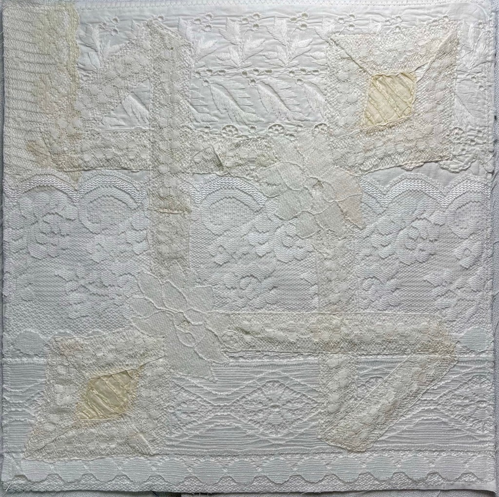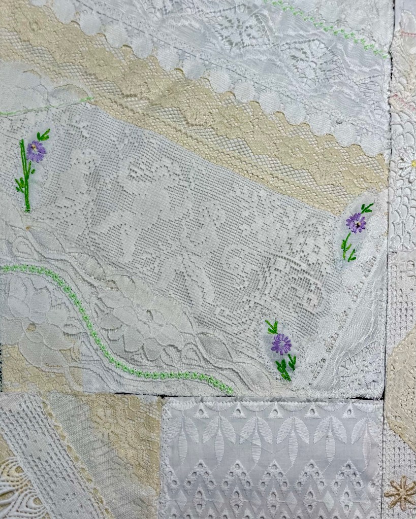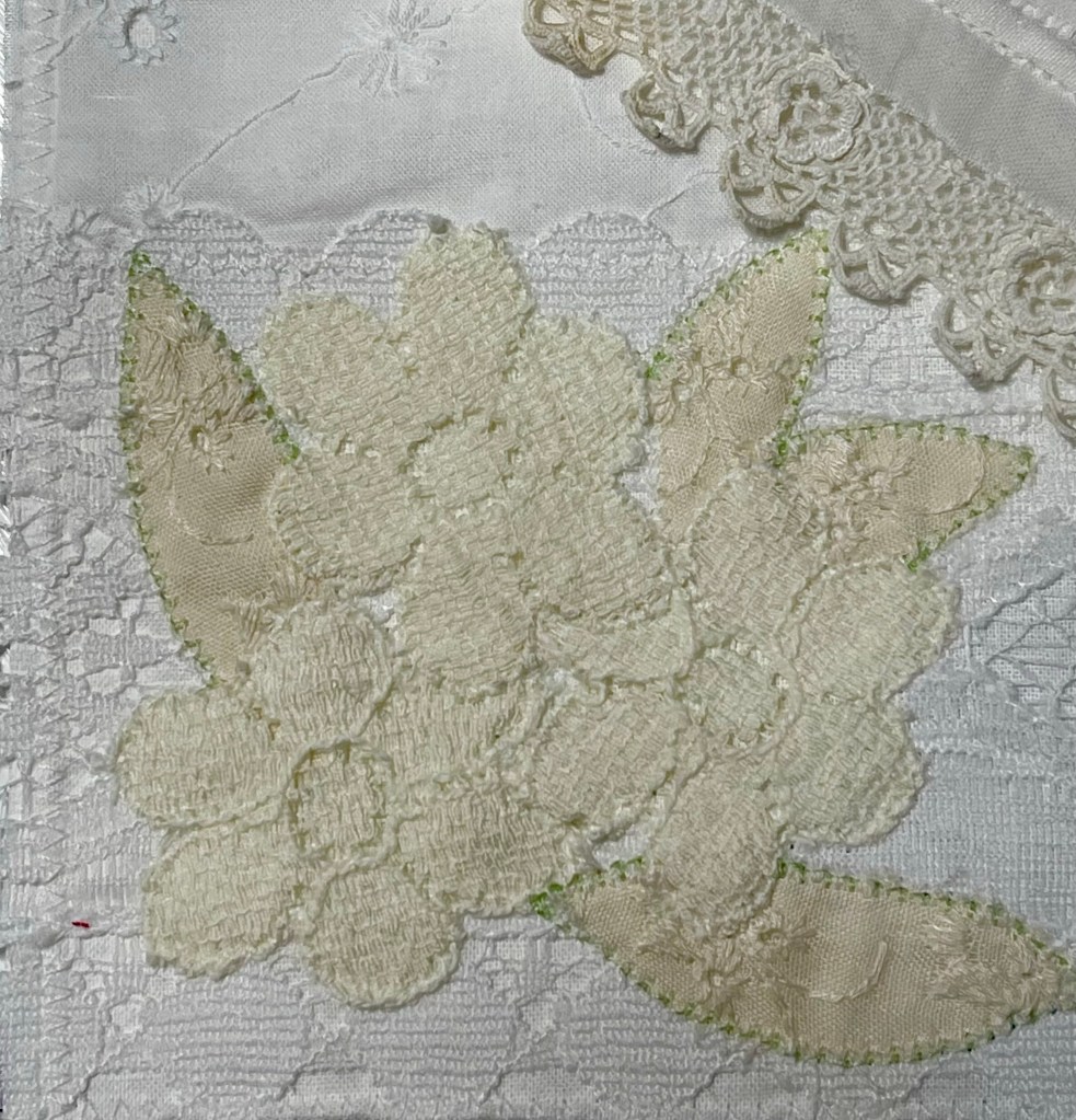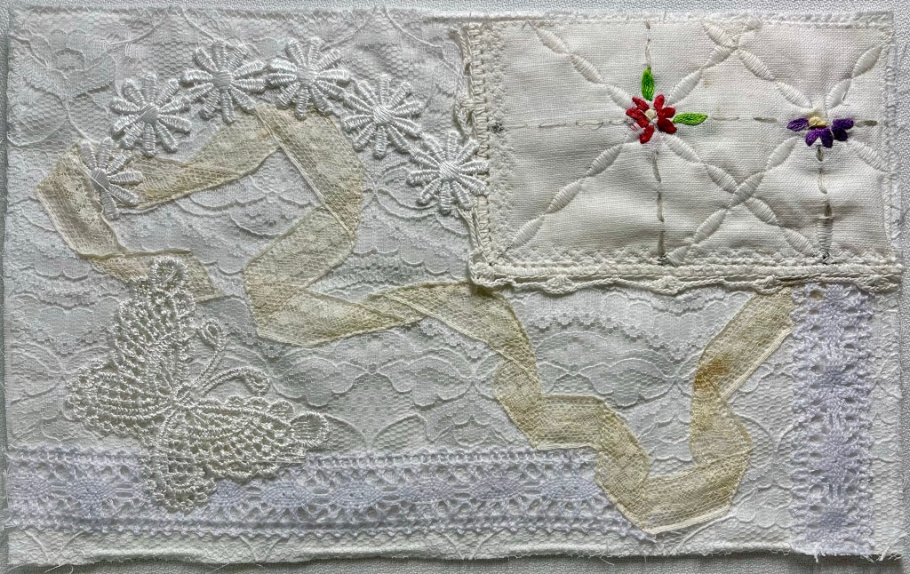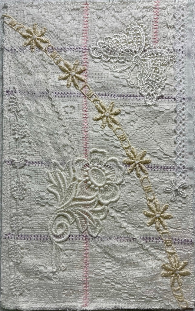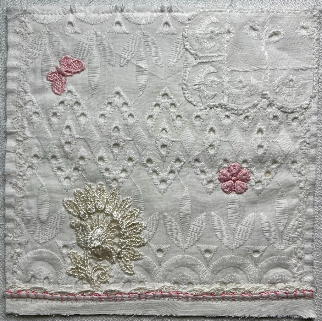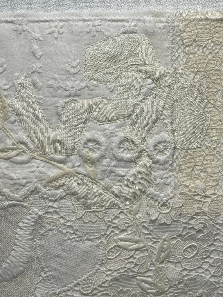 I began by making simple blocks randomly embellished with trims and laces and eyelets with a very small pop of color here and there.