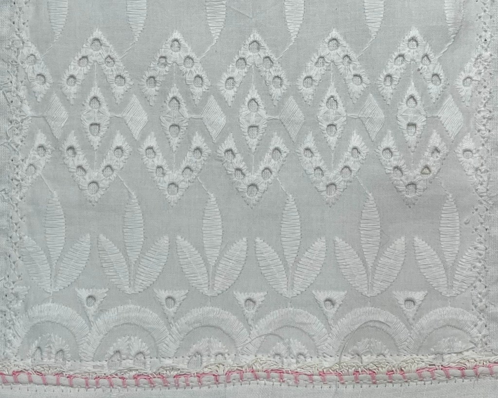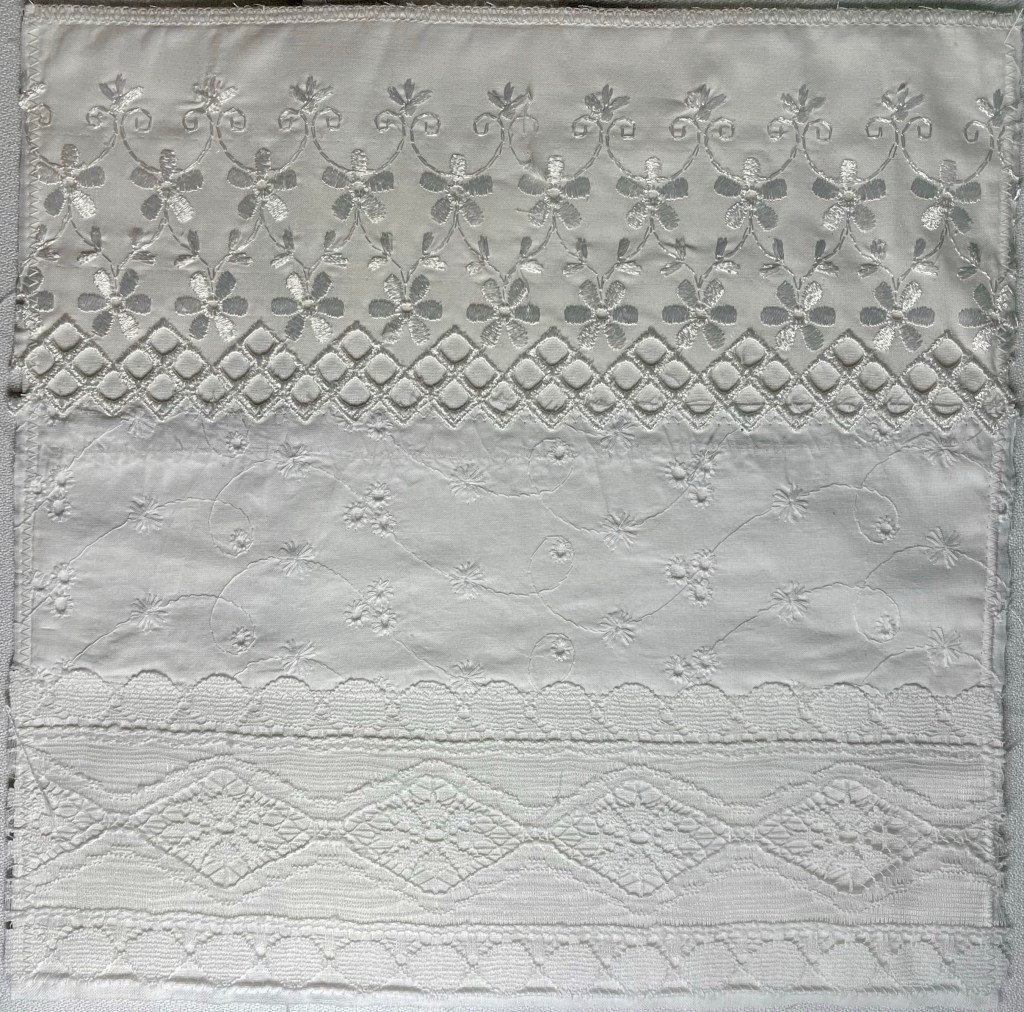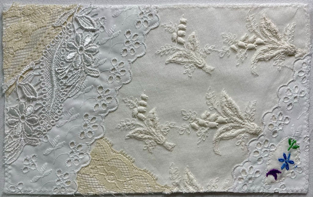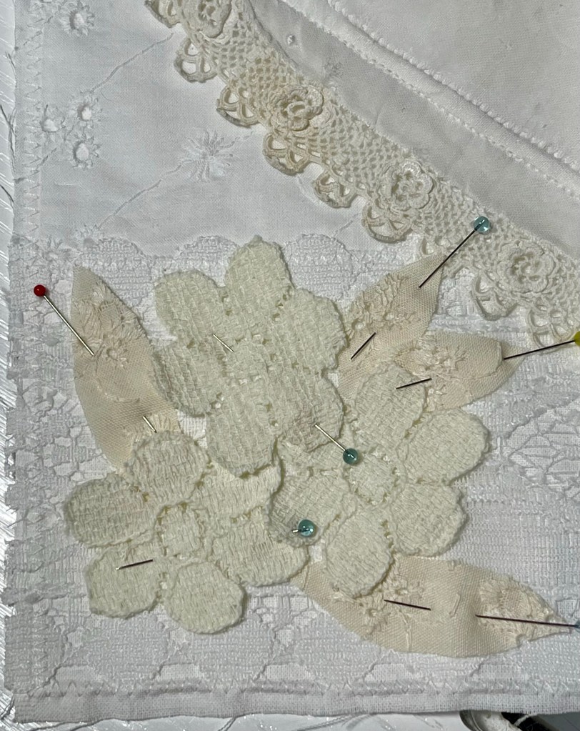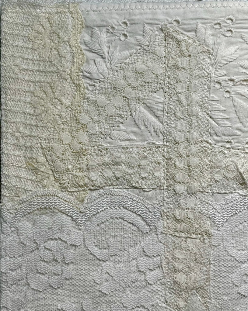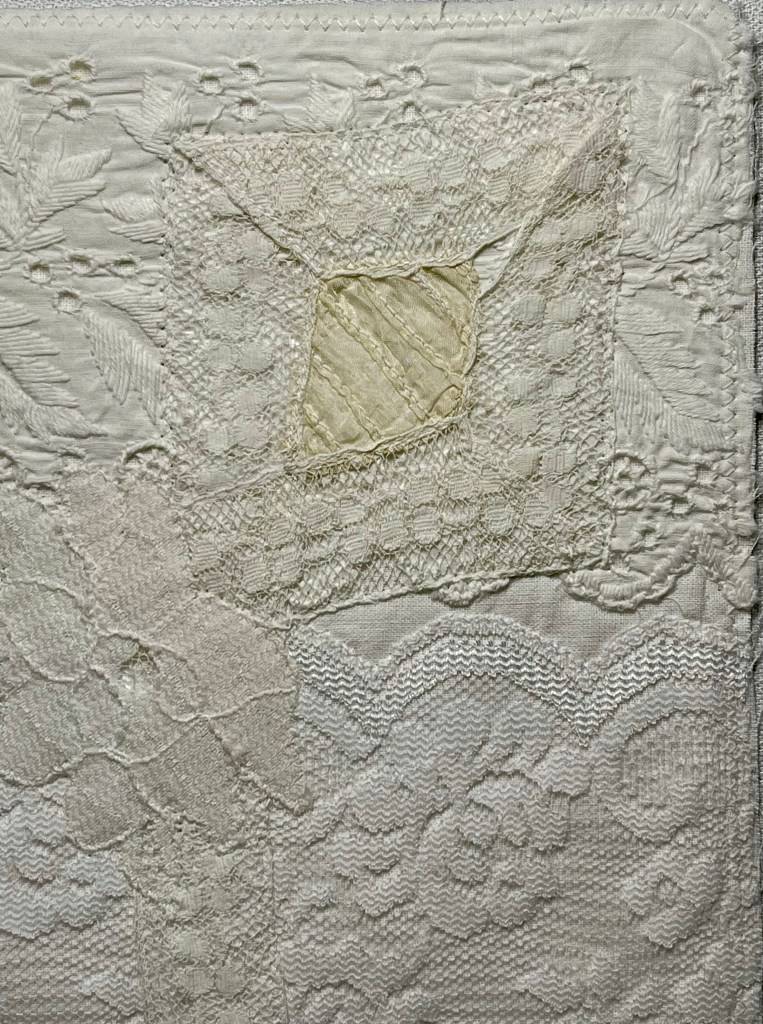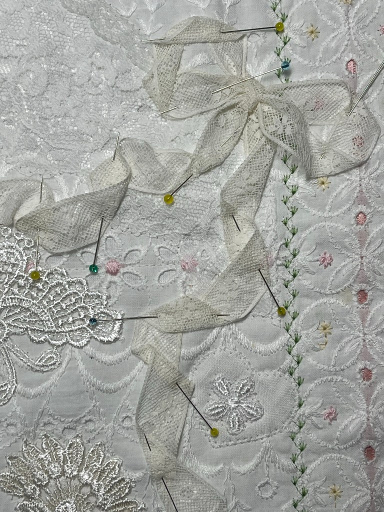 I began by making simple blocks randomly embellished with trims and laces and eyelets with a very small pop of color here and there.