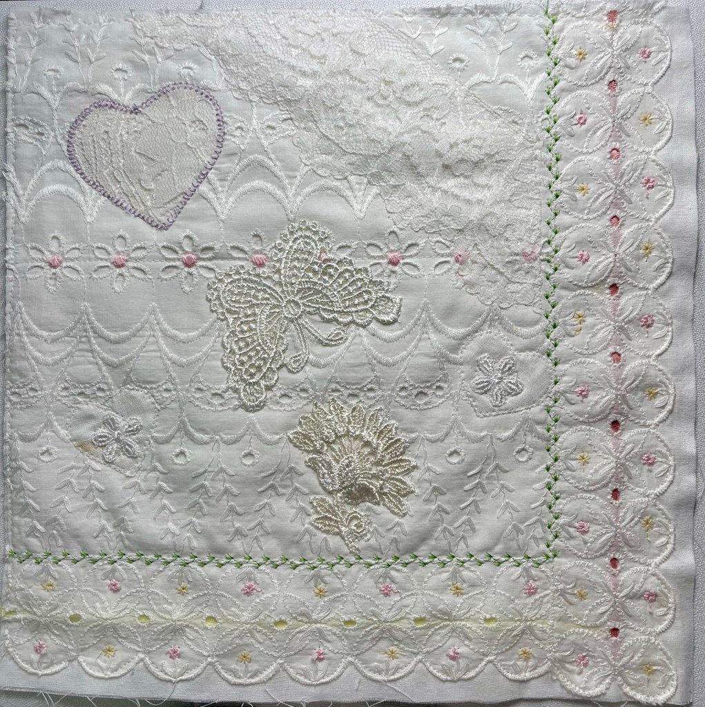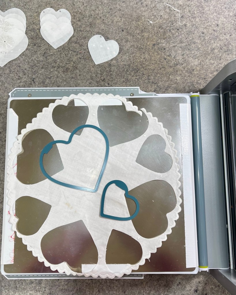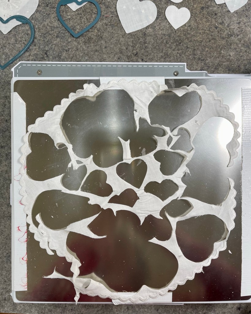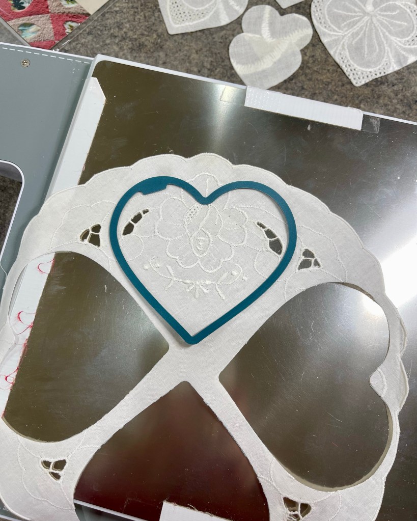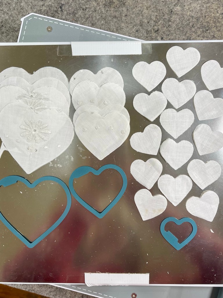 This vintage white circle doily gave me so many hearts, each one so far fussy cut to take advantage of the white embroidery in the doily.