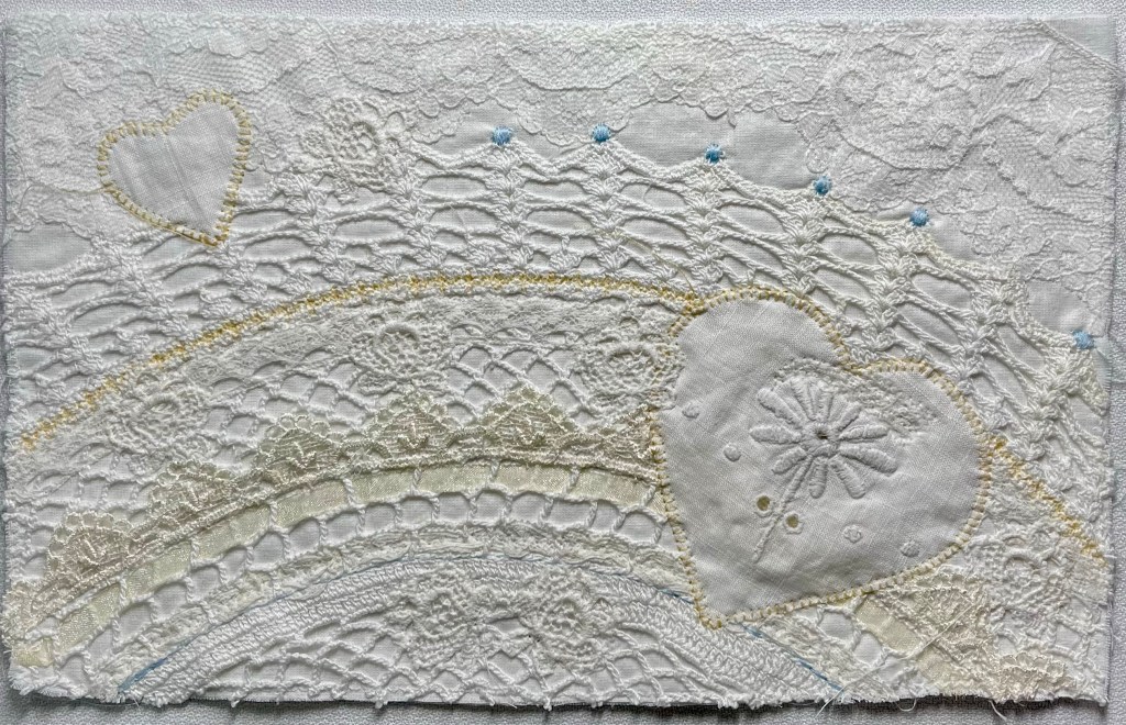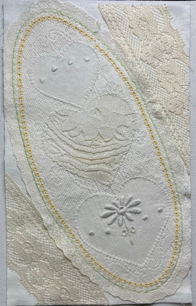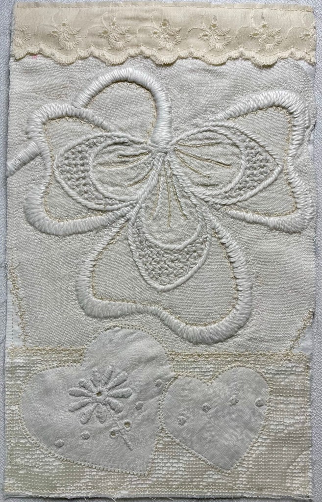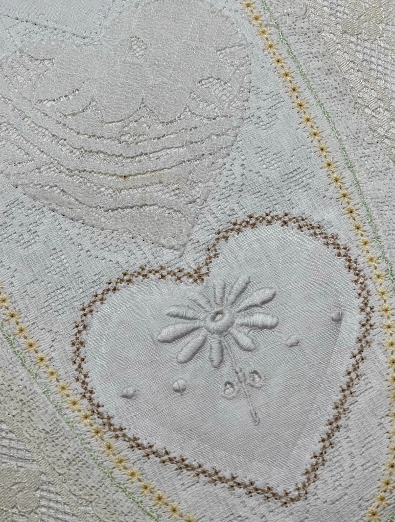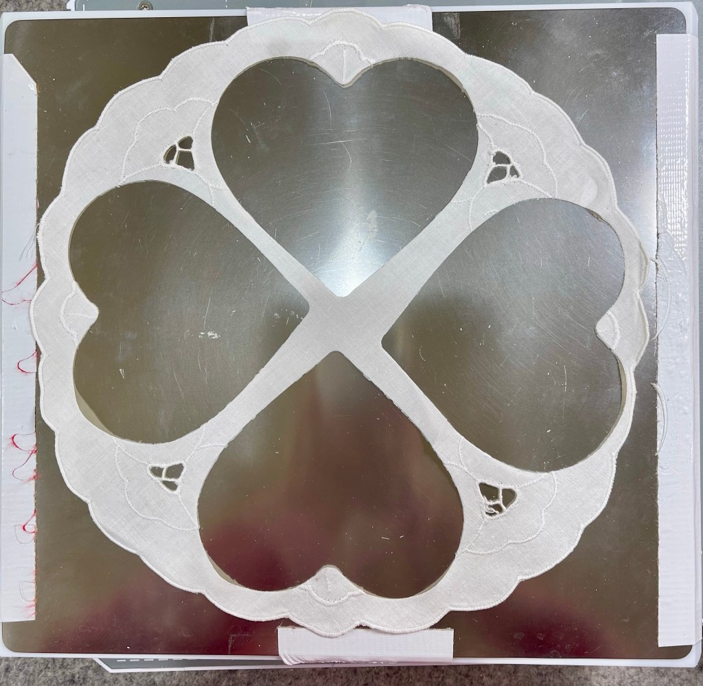 This vintage white circle doily gave me so many hearts, each one so far fussy cut to take advantage of the white embroidery in the doily.