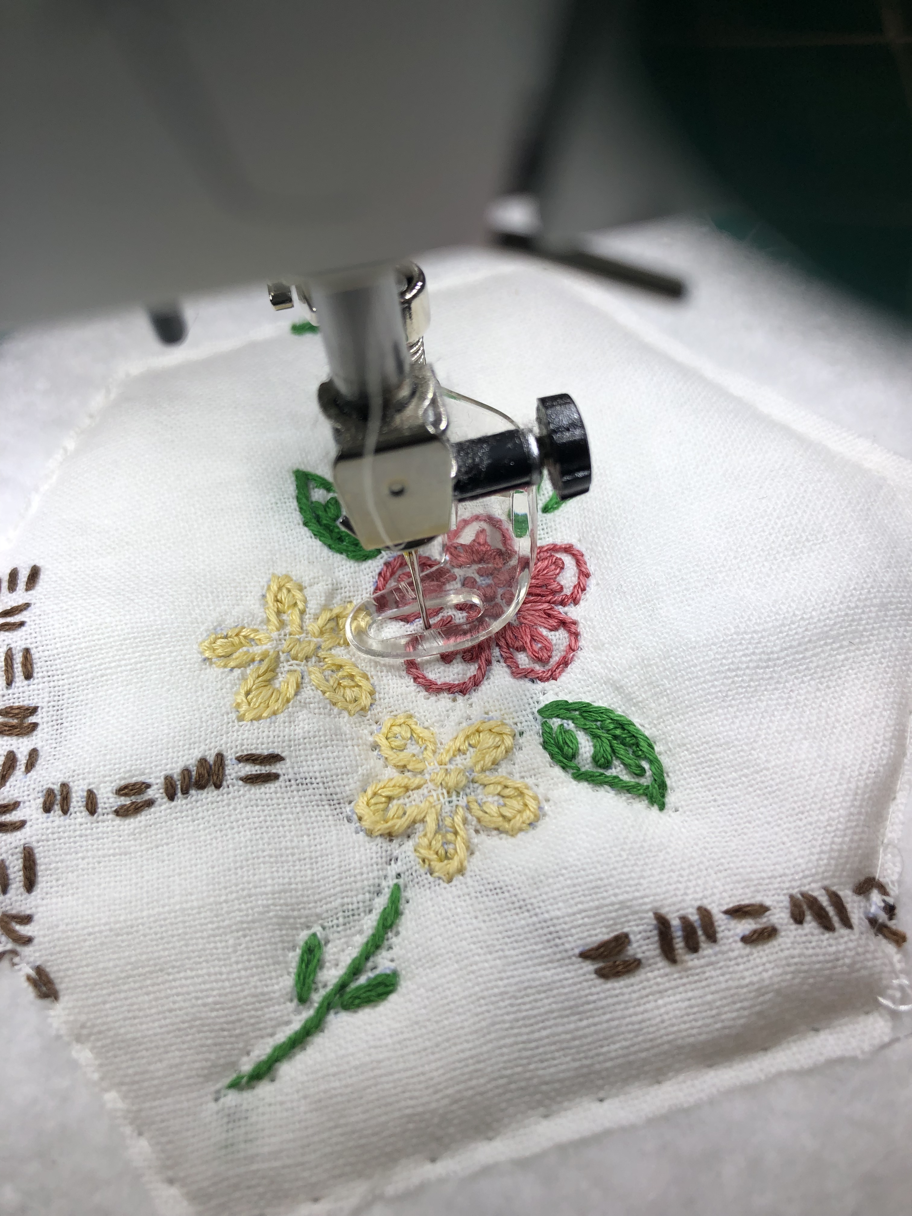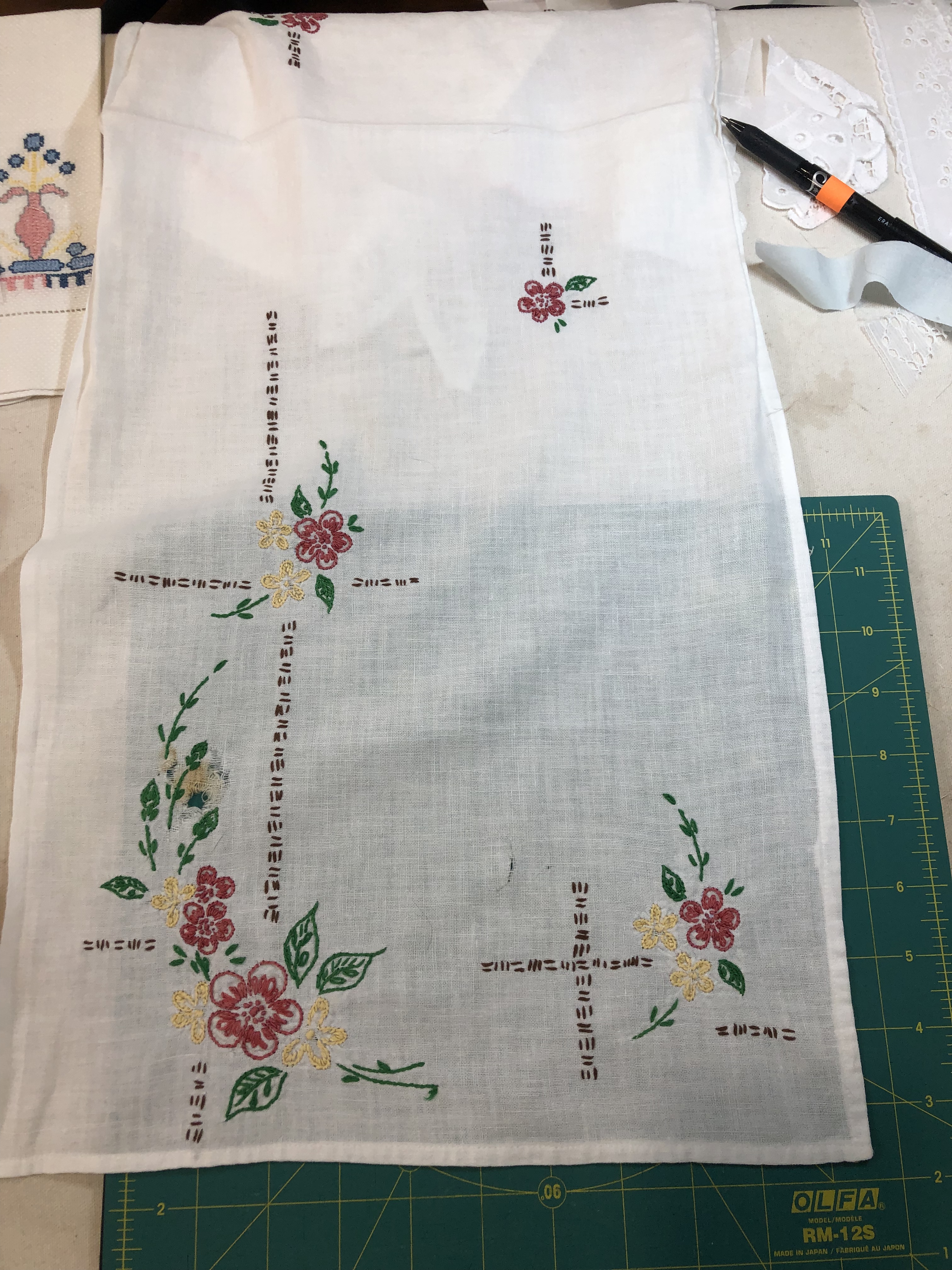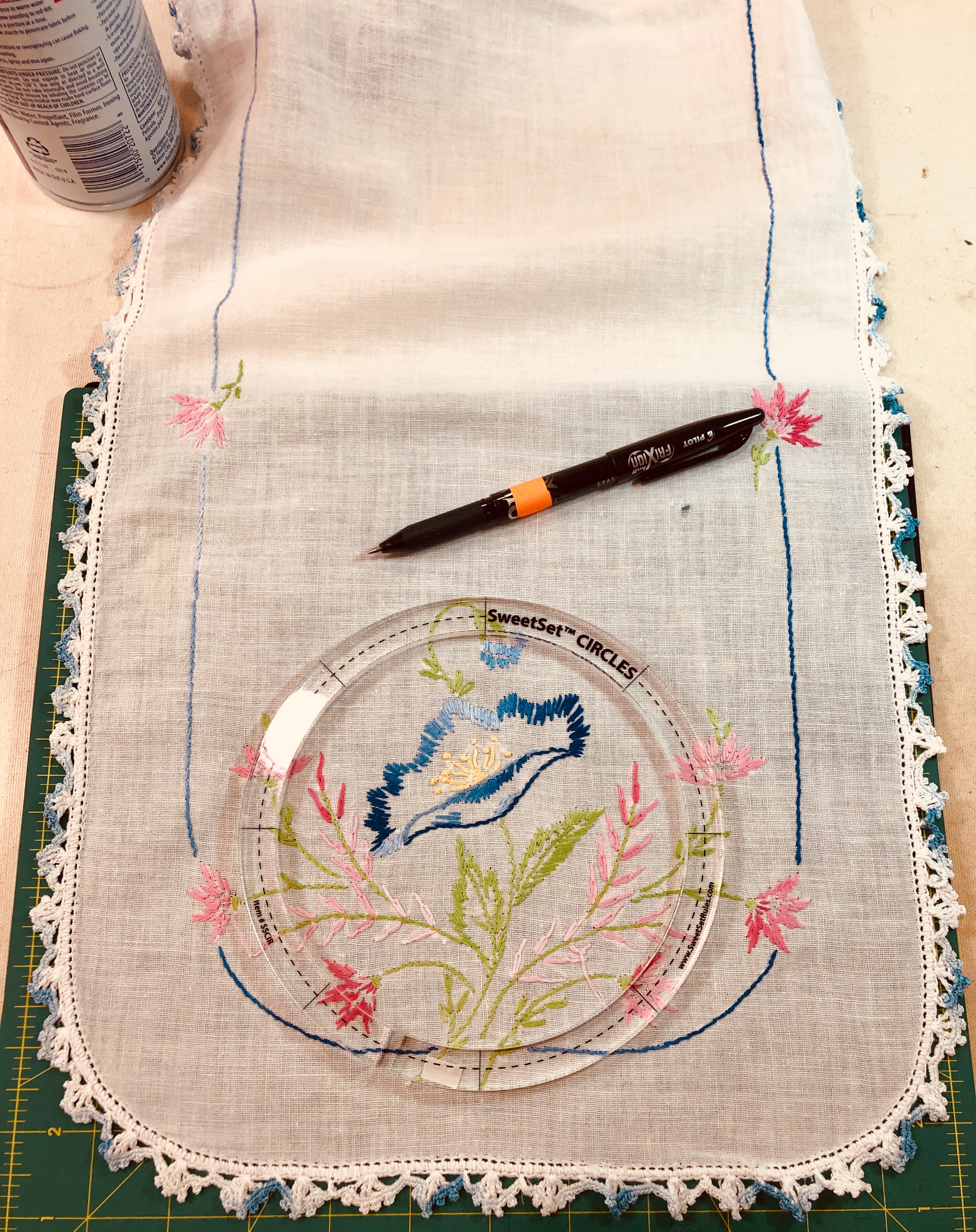 Above, the butterfly is new, the flowers are part of a vintage table topper.