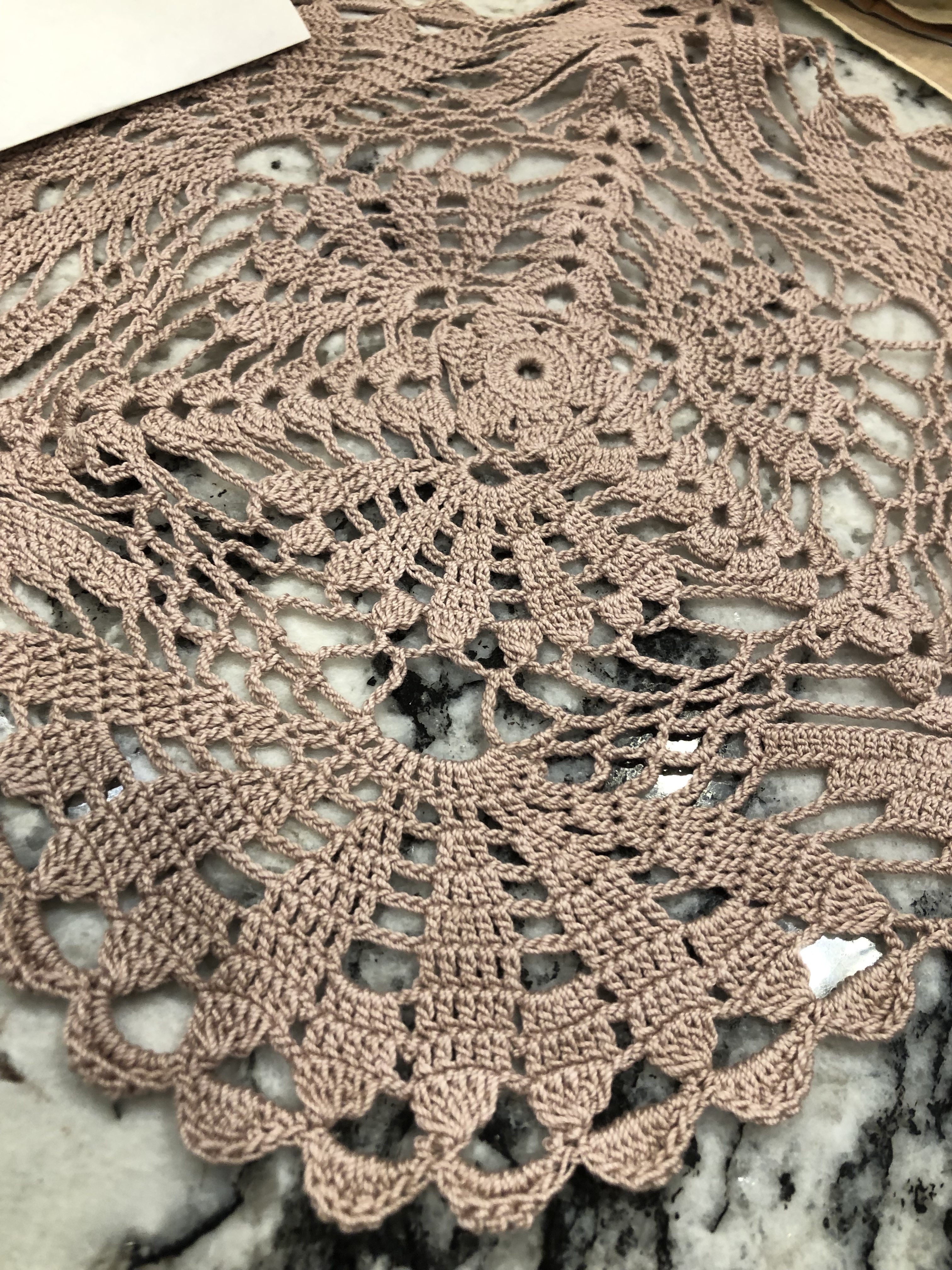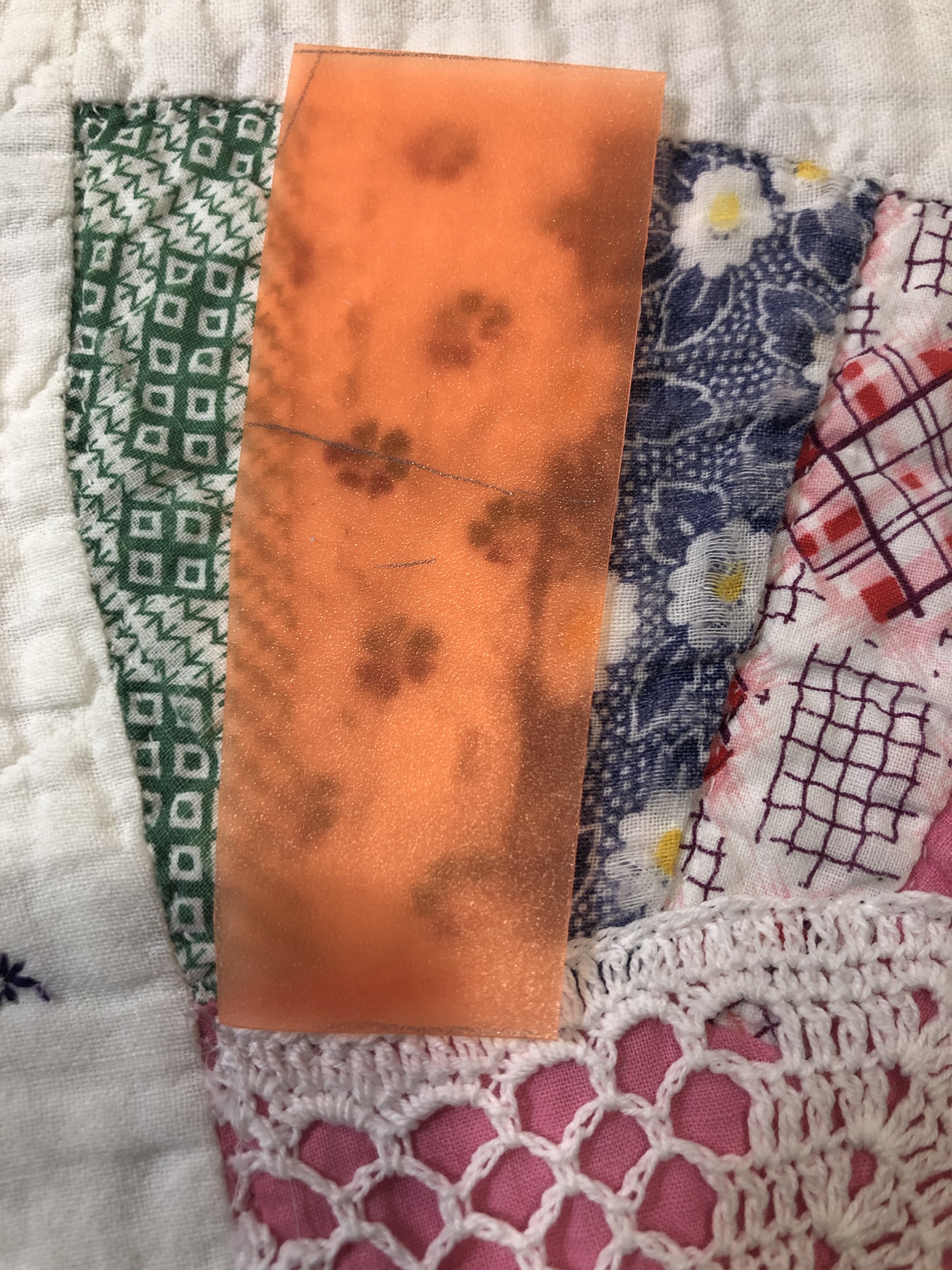 This orange and blue hexie took forever but I feel it was worth the time and effort. I’m not a blue or orange person but after having worked with this for so long I came to understand how they work so well together. The crochet flowers were saved from a very damaged doily.
