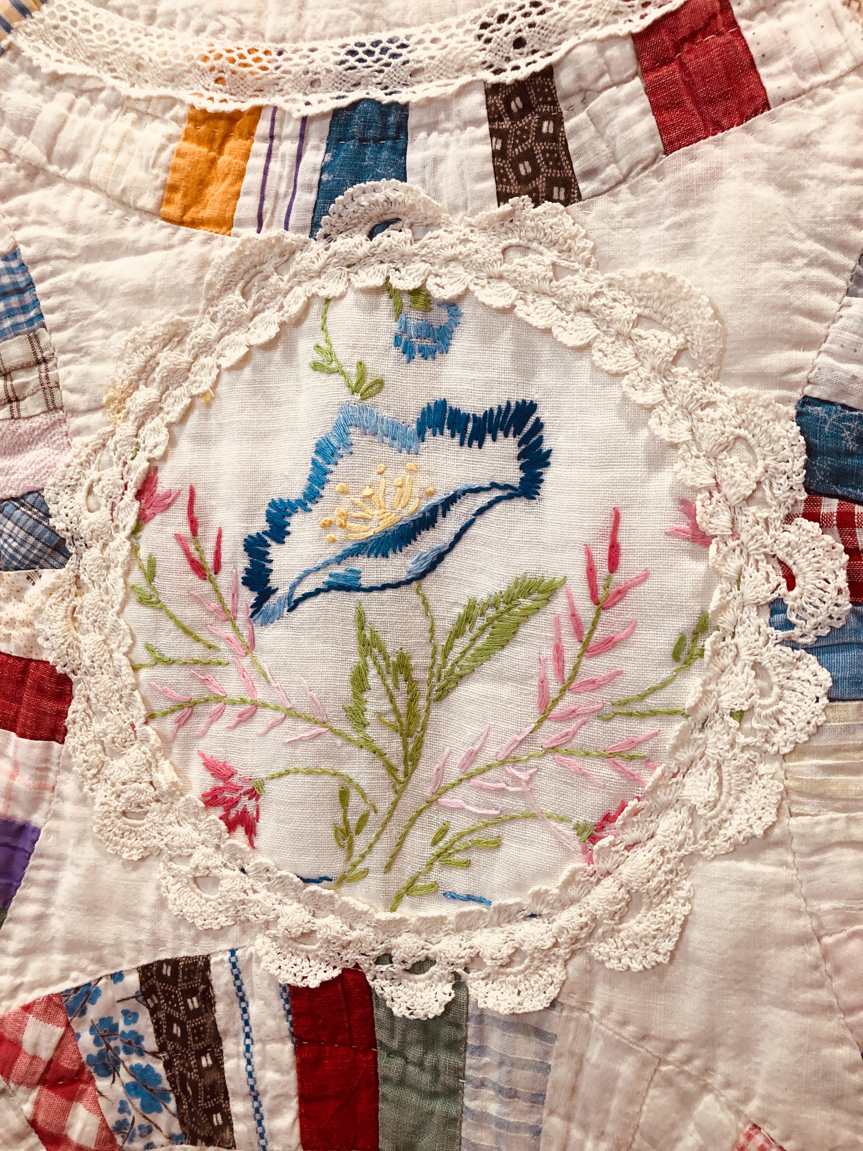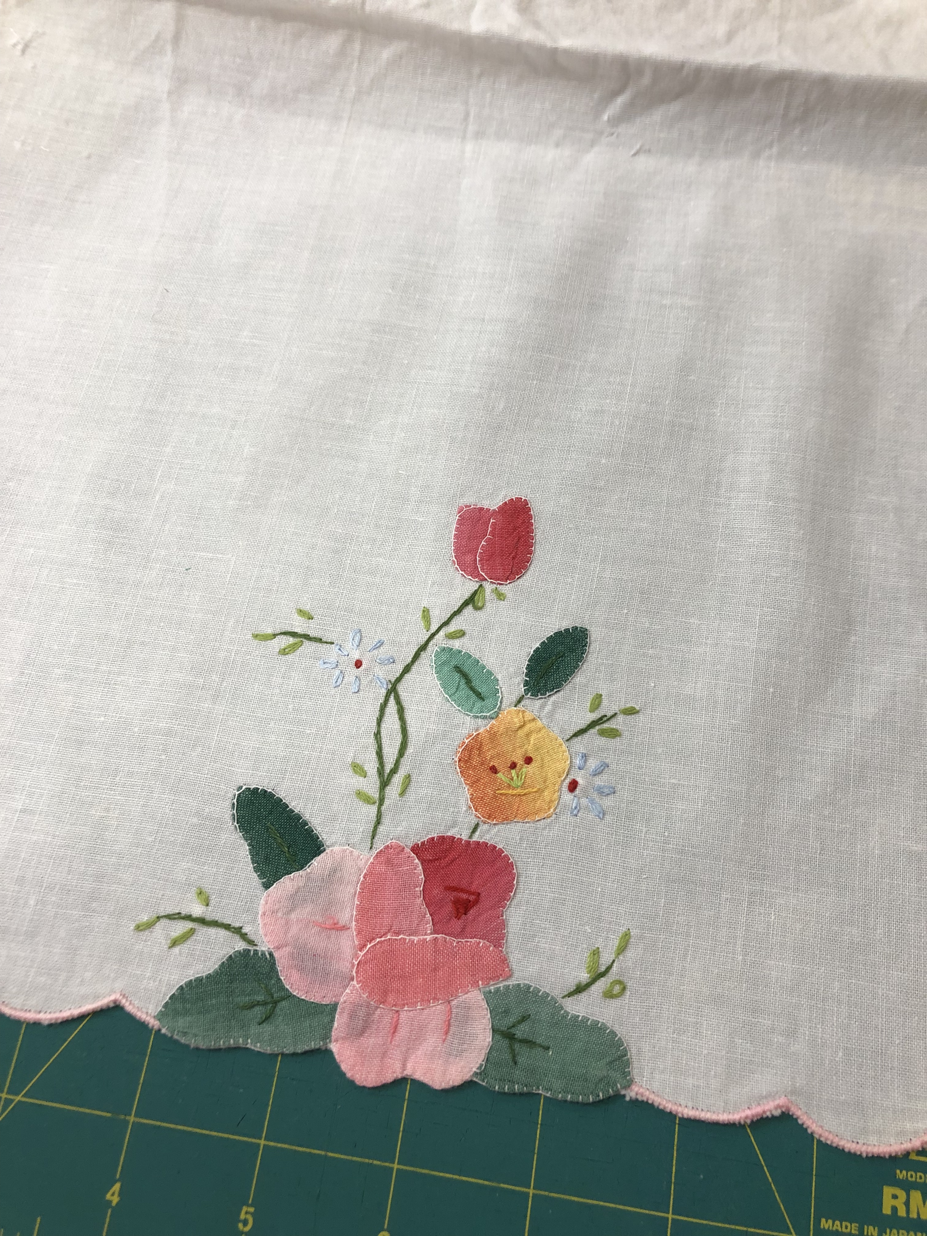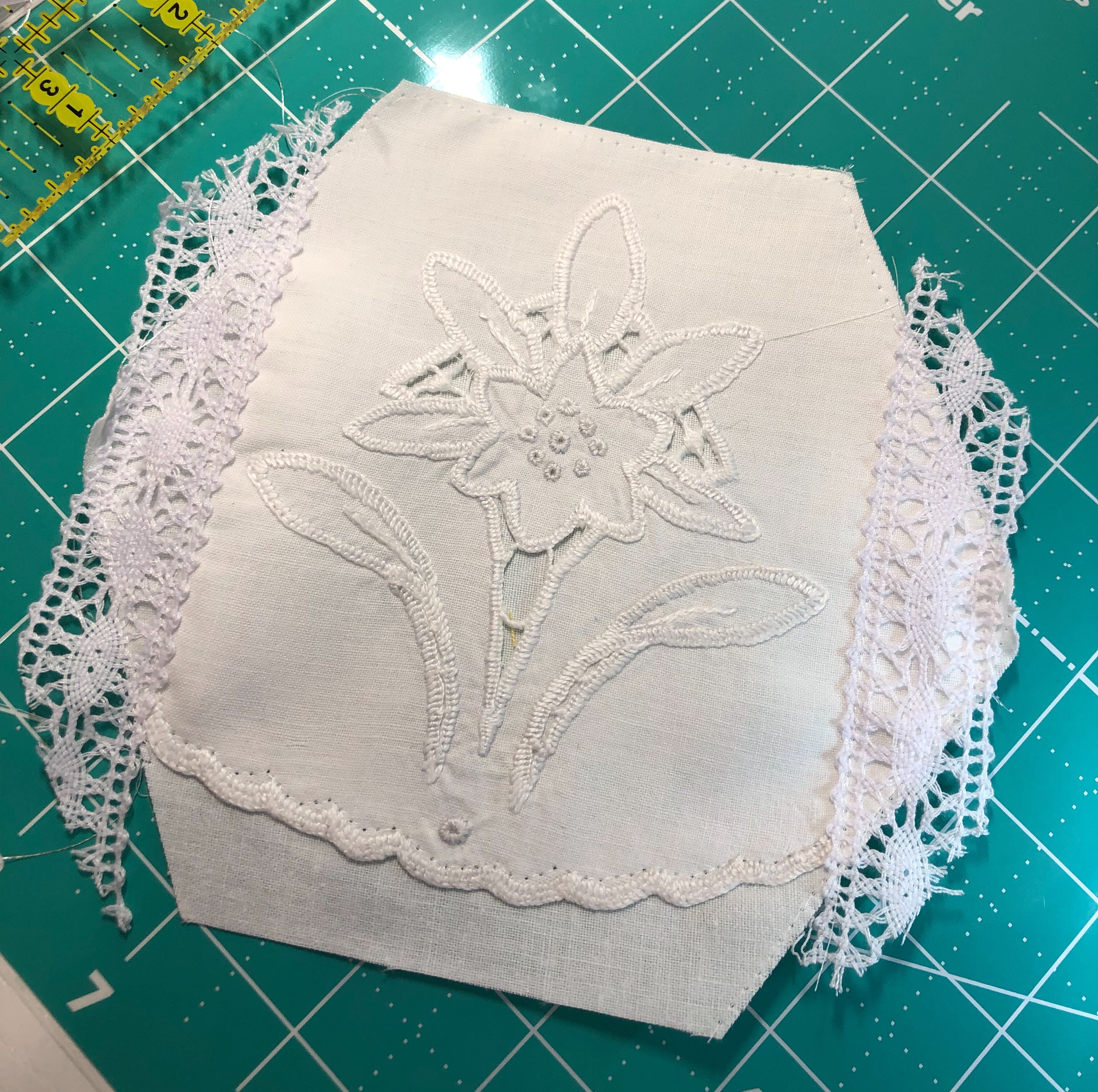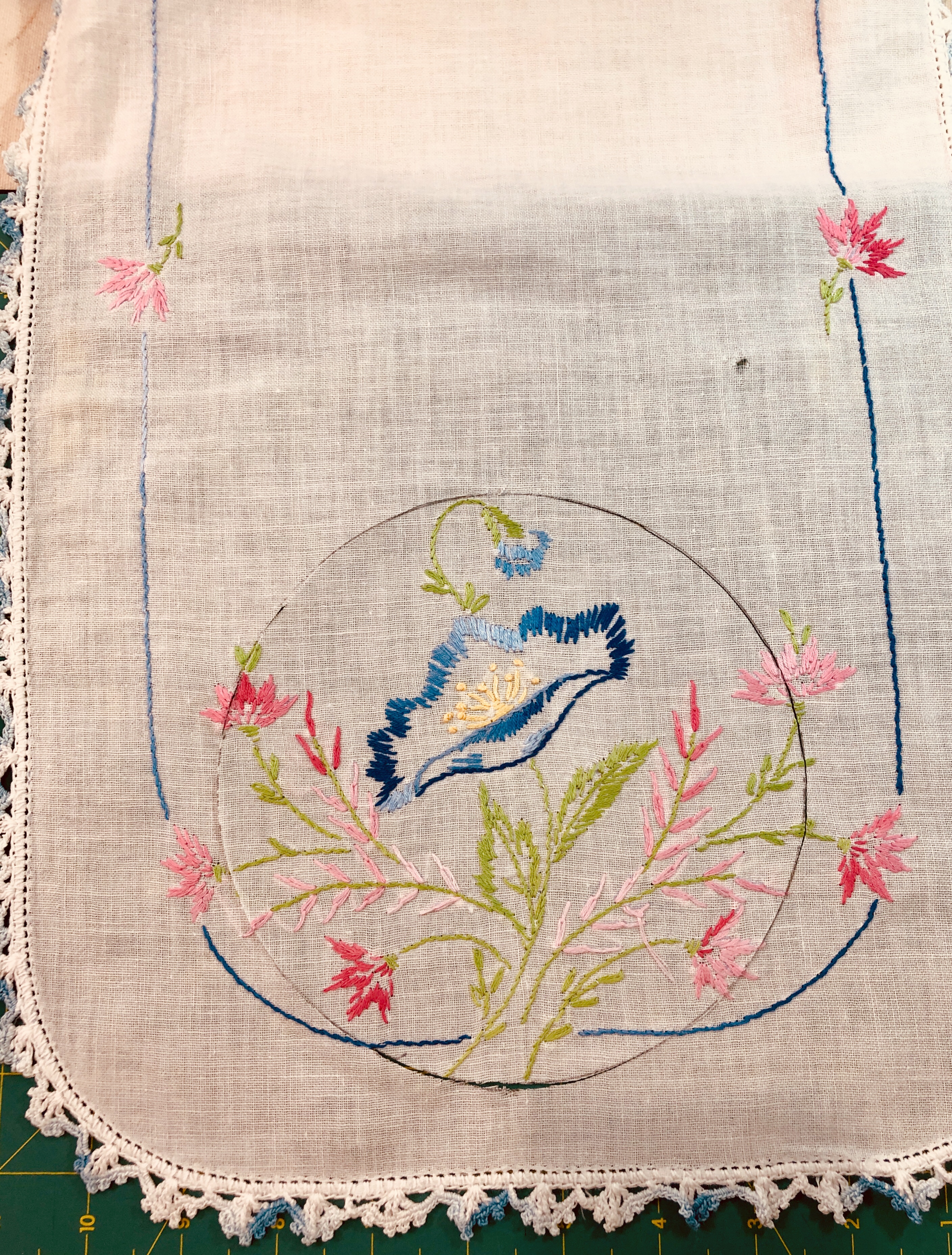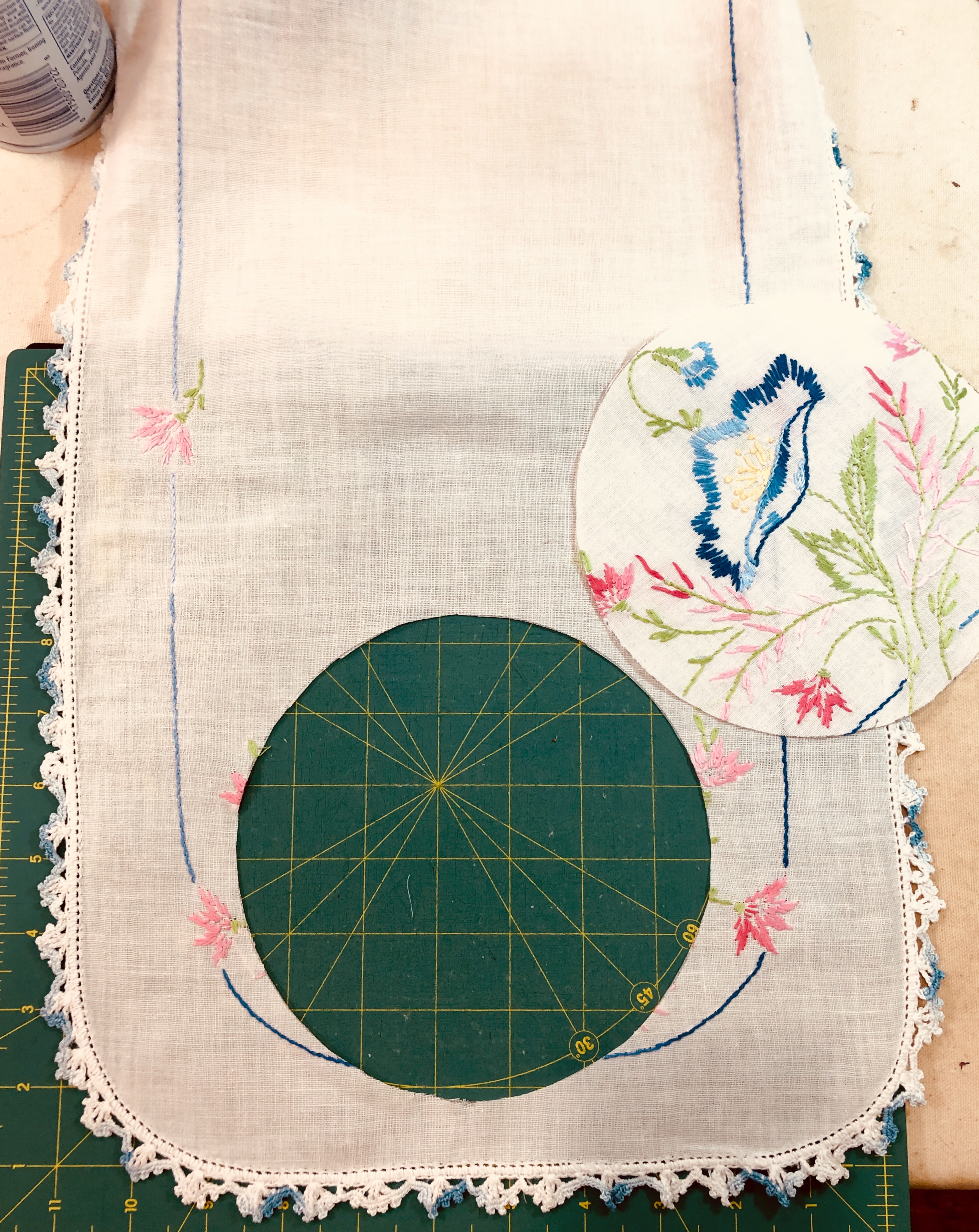 This piece features a vintage embroidered flower spray doily with an ivory hand crocheted edging. The remaining embroidery was done my your truly to enhance the vintage work. Look closely and you can pick out the ivory Dresden Plate.