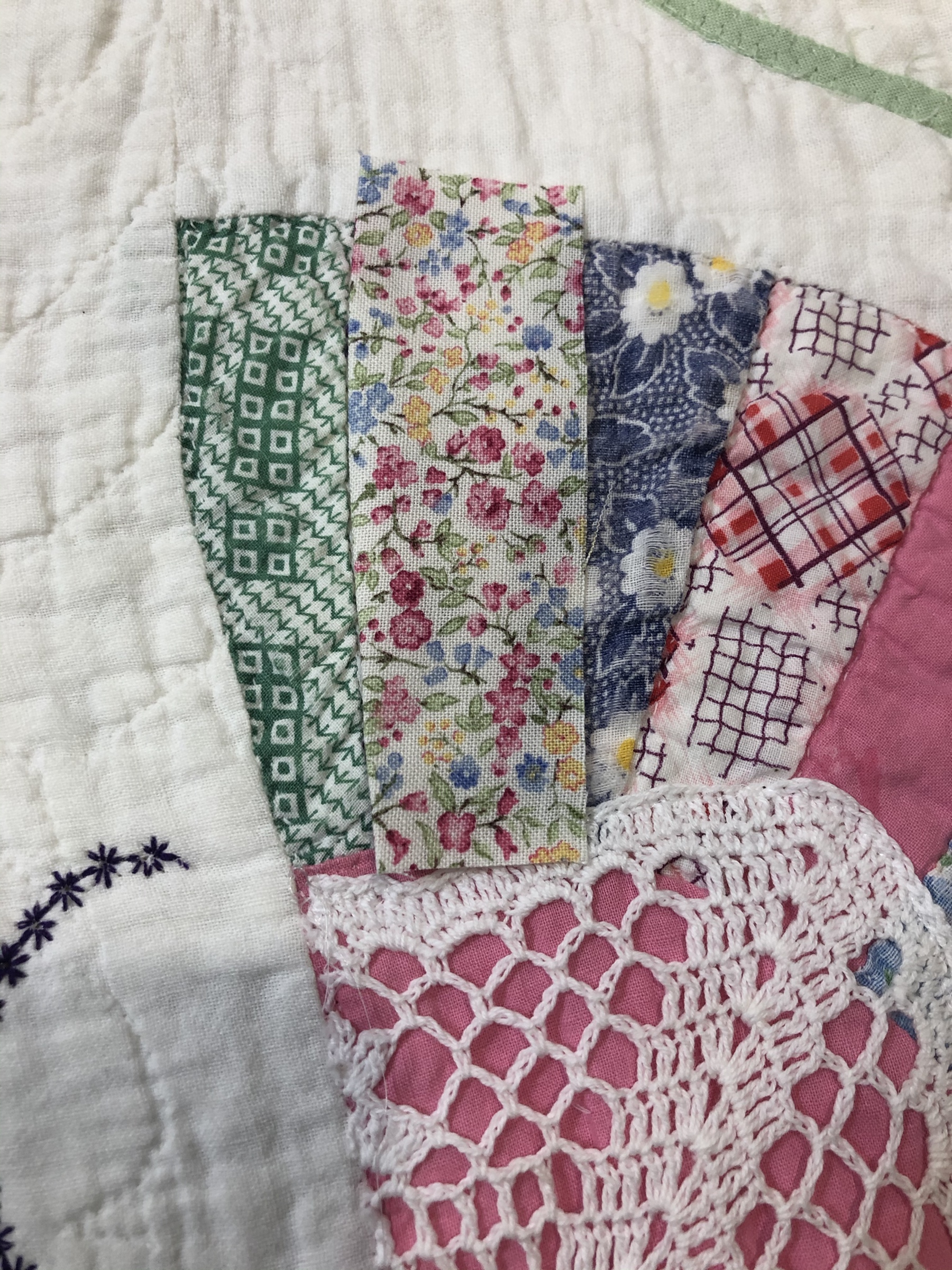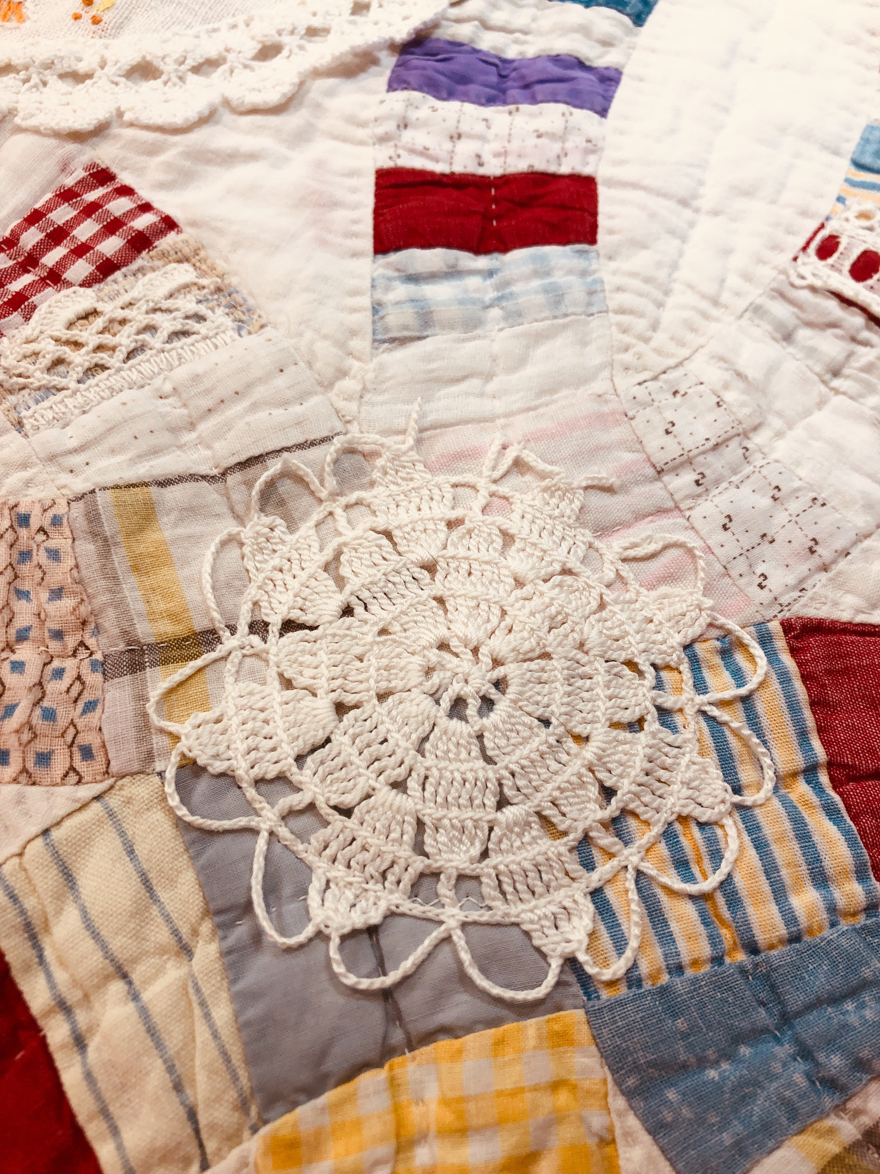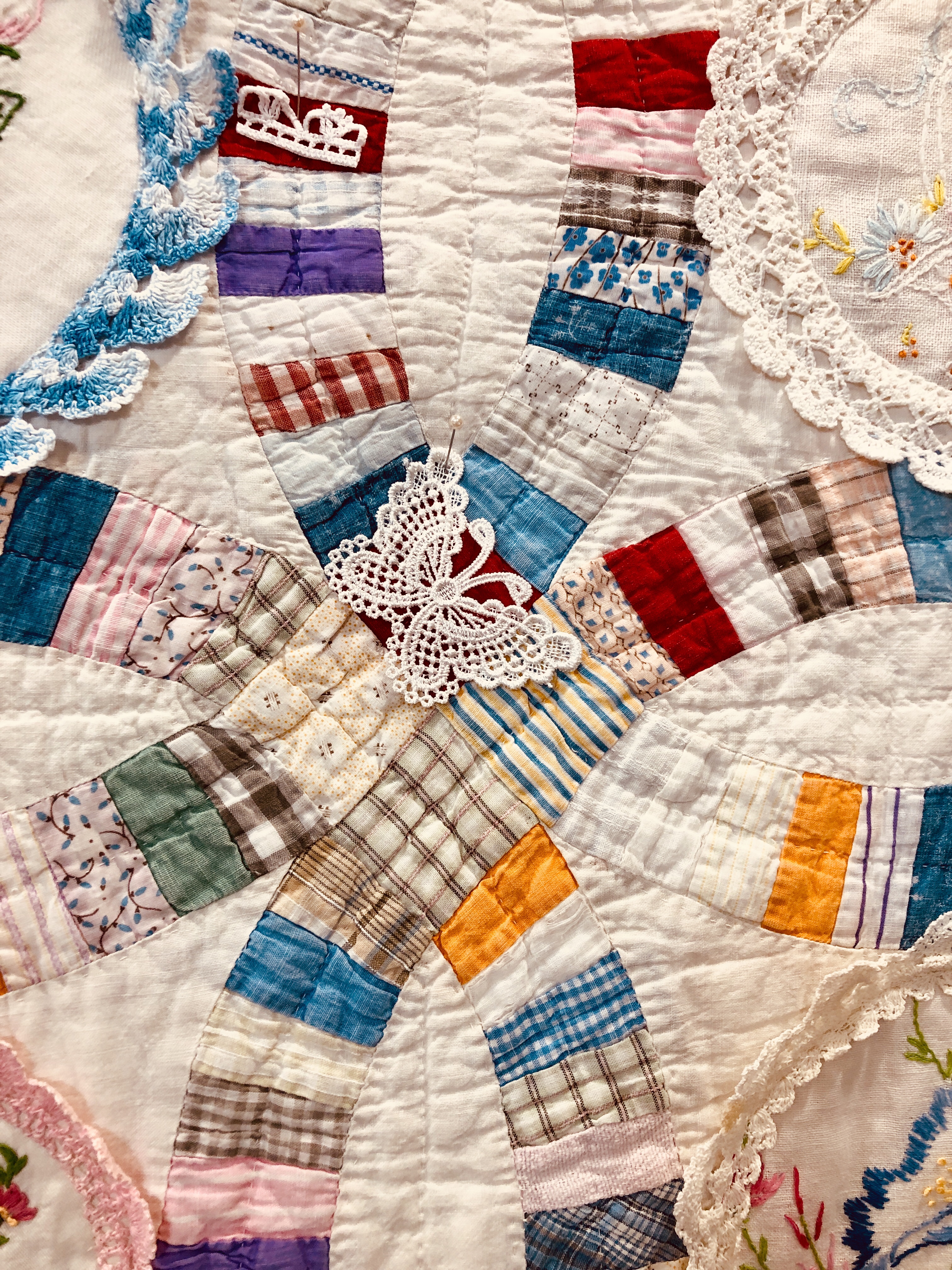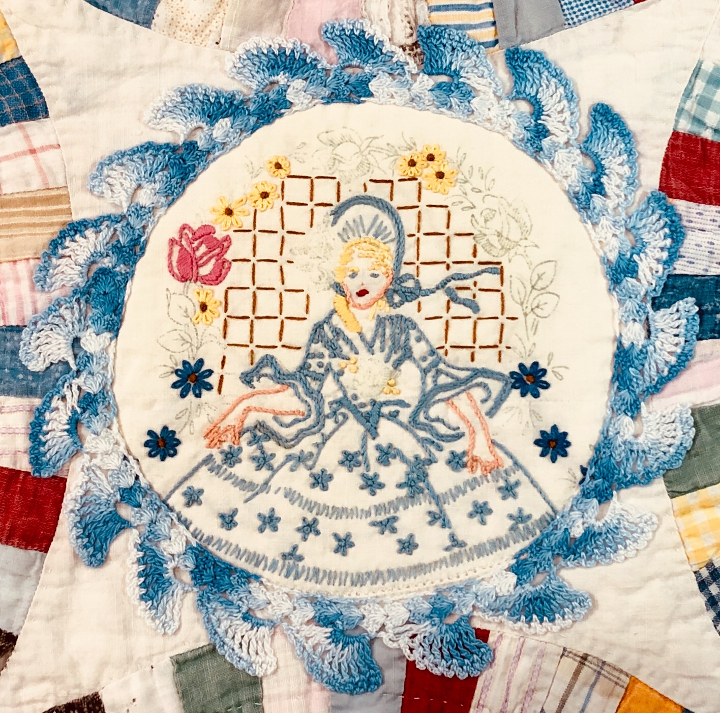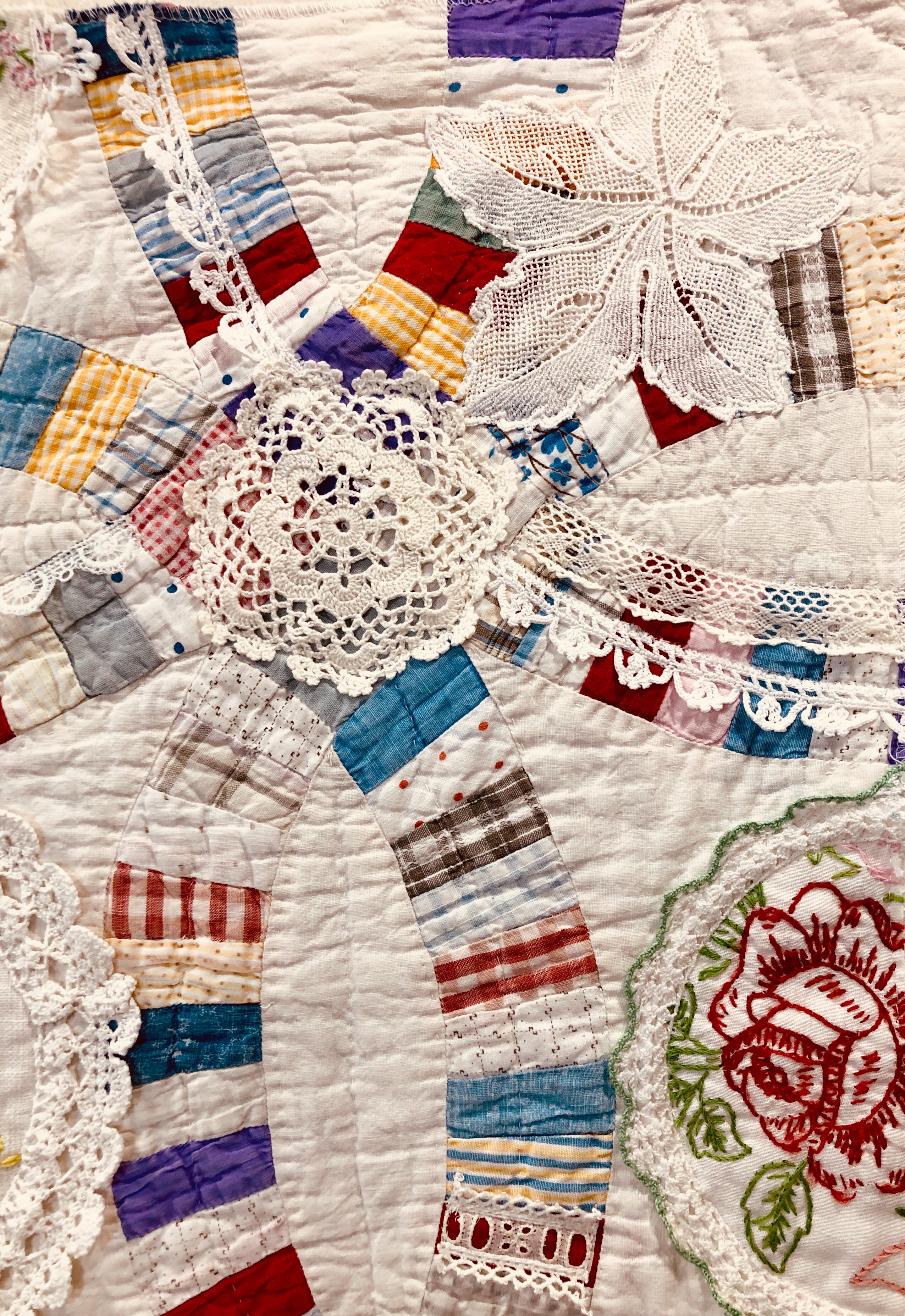 This piece features a vintage embroidered flower spray doily with an ivory hand crocheted edging. The remaining embroidery was done my your truly to enhance the vintage work. Look closely and you can pick out the ivory Dresden Plate.