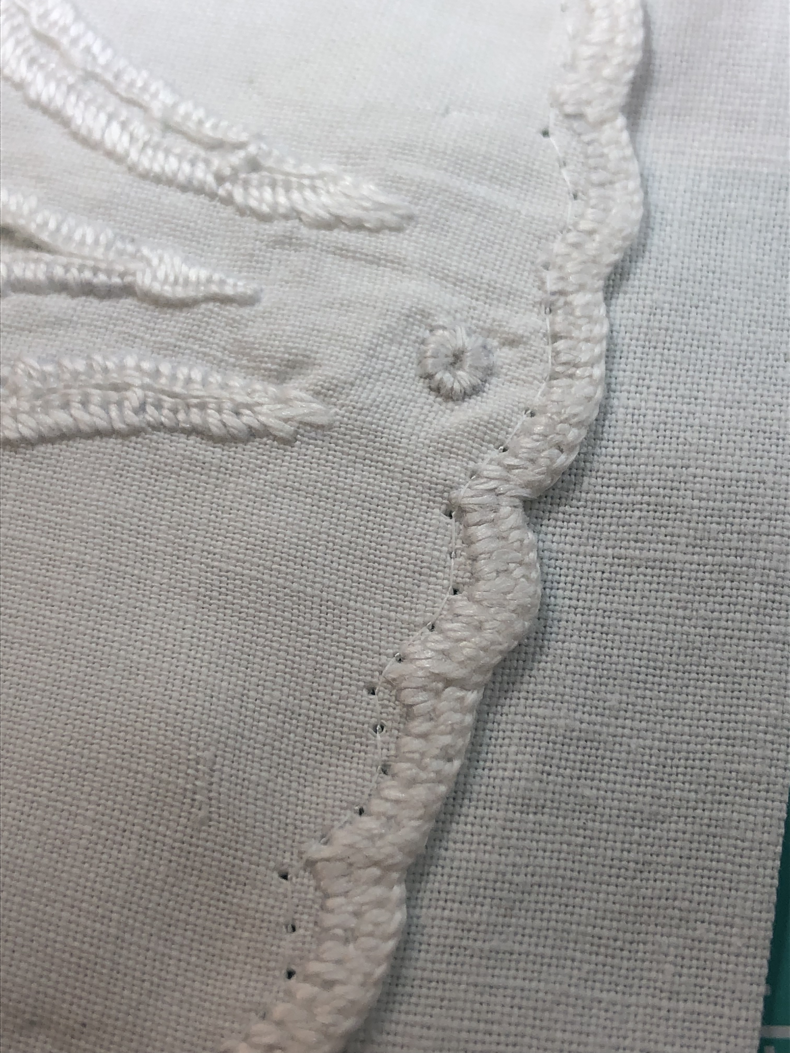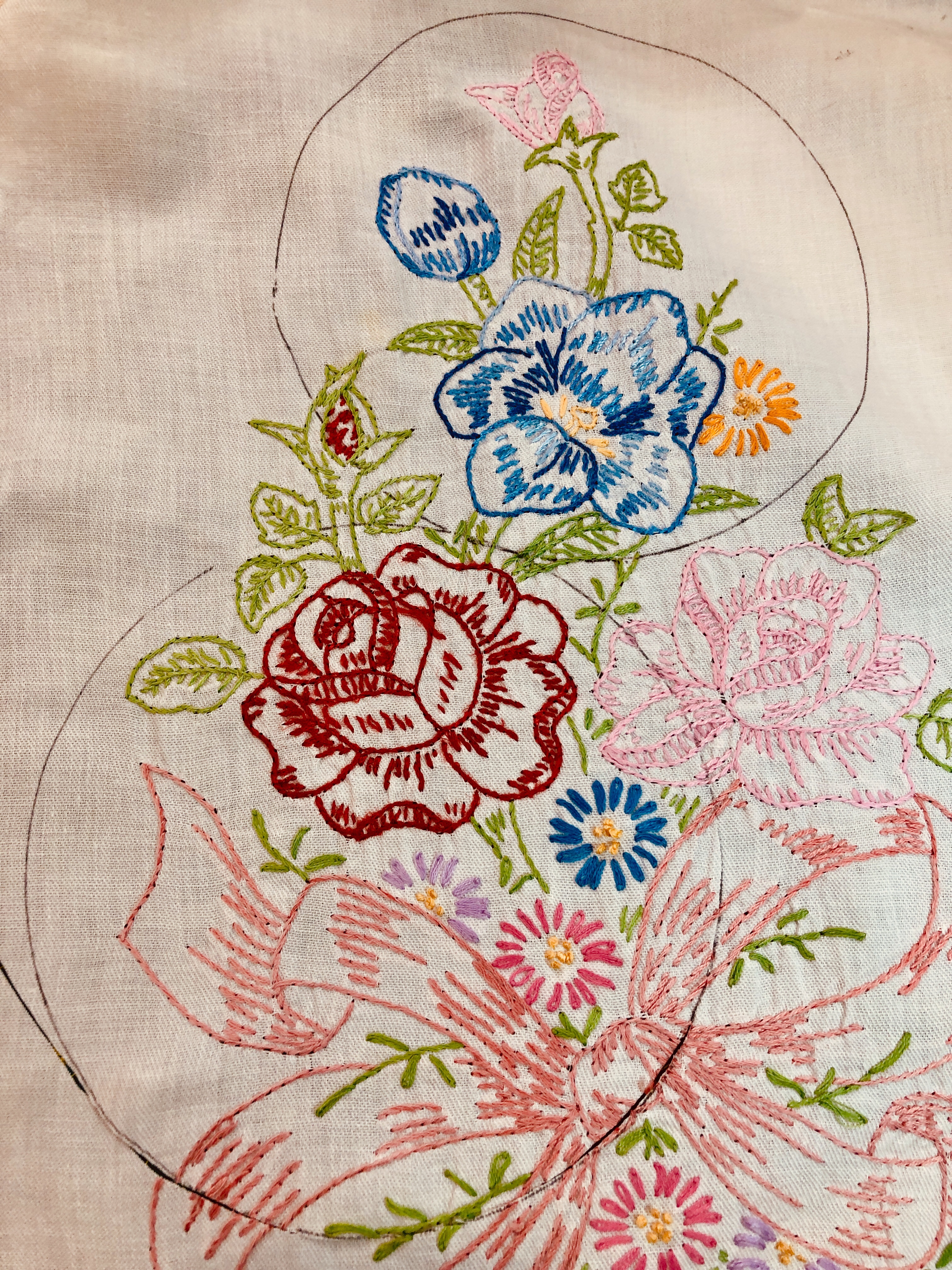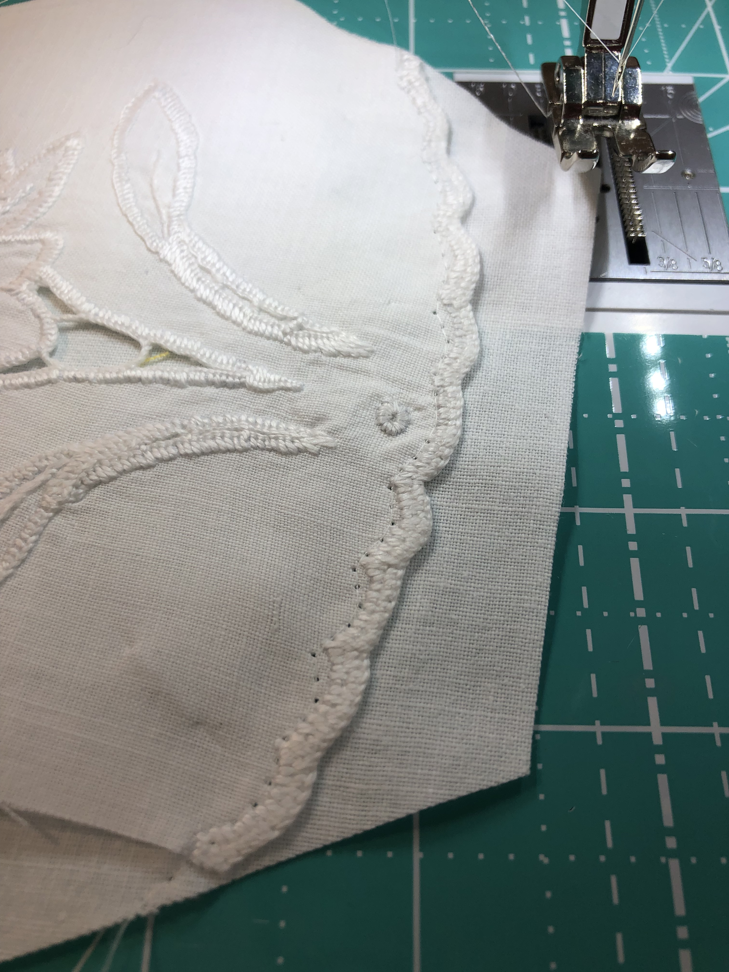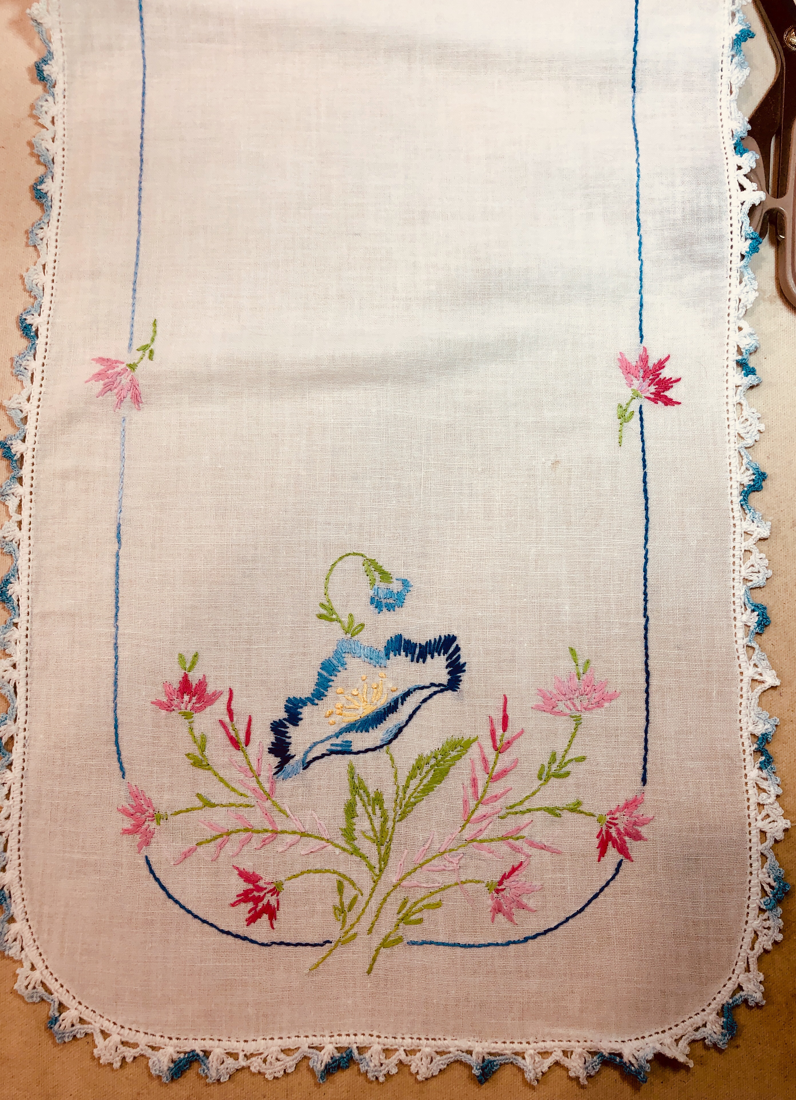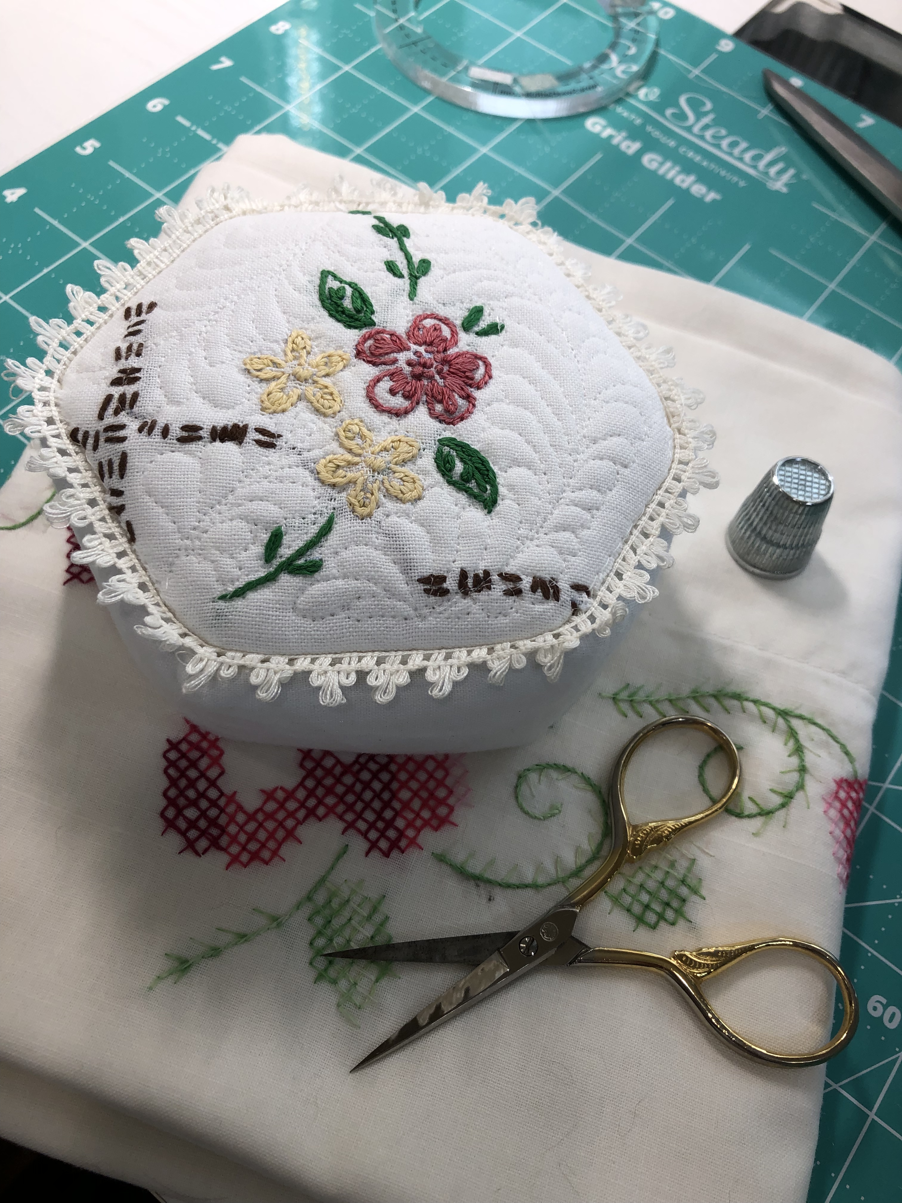 This piece features a vintage embroidered flower spray doily with an ivory hand crocheted edging. The remaining embroidery was done my your truly to enhance the vintage work. Look closely and you can pick out the ivory Dresden Plate.