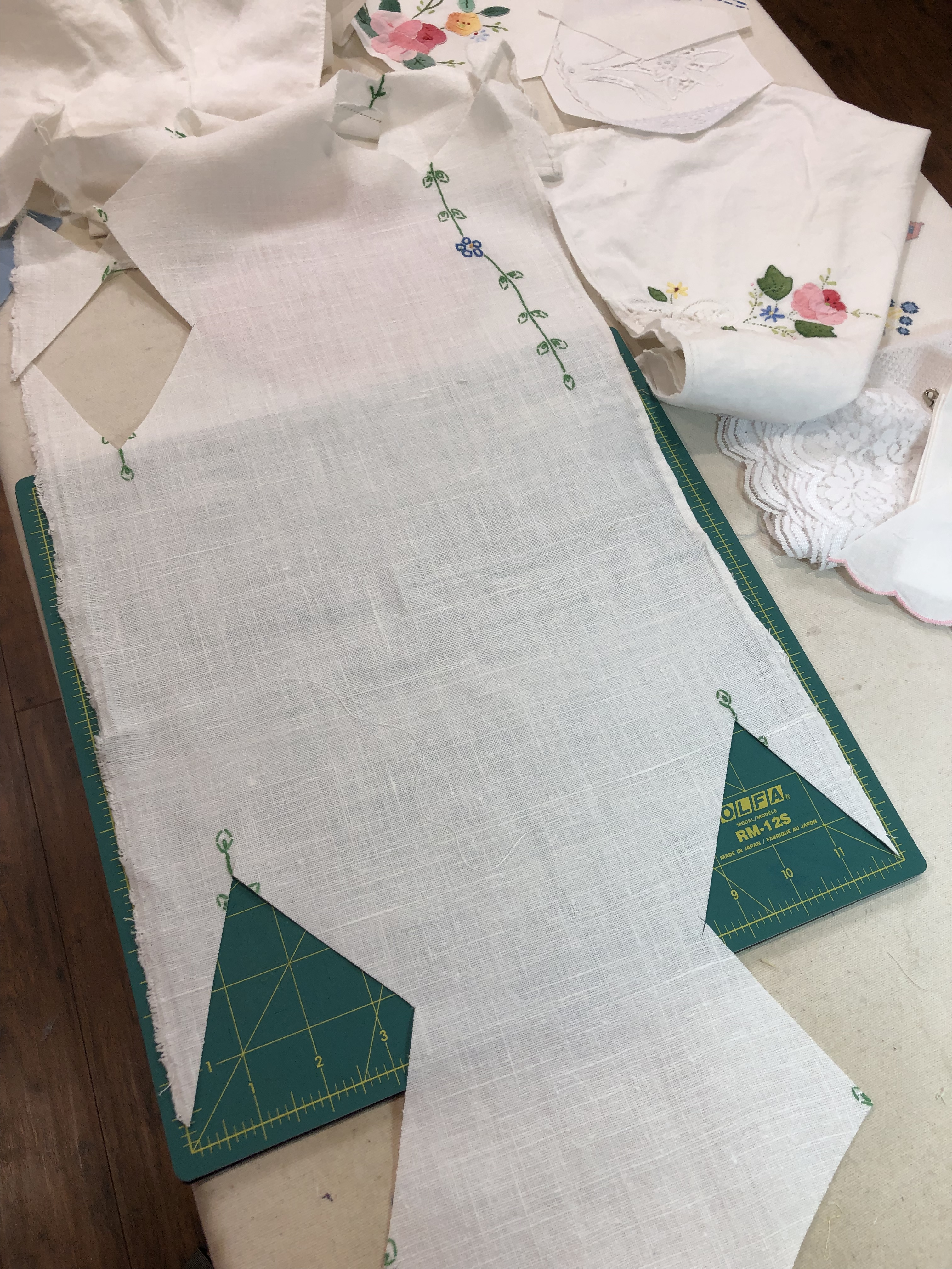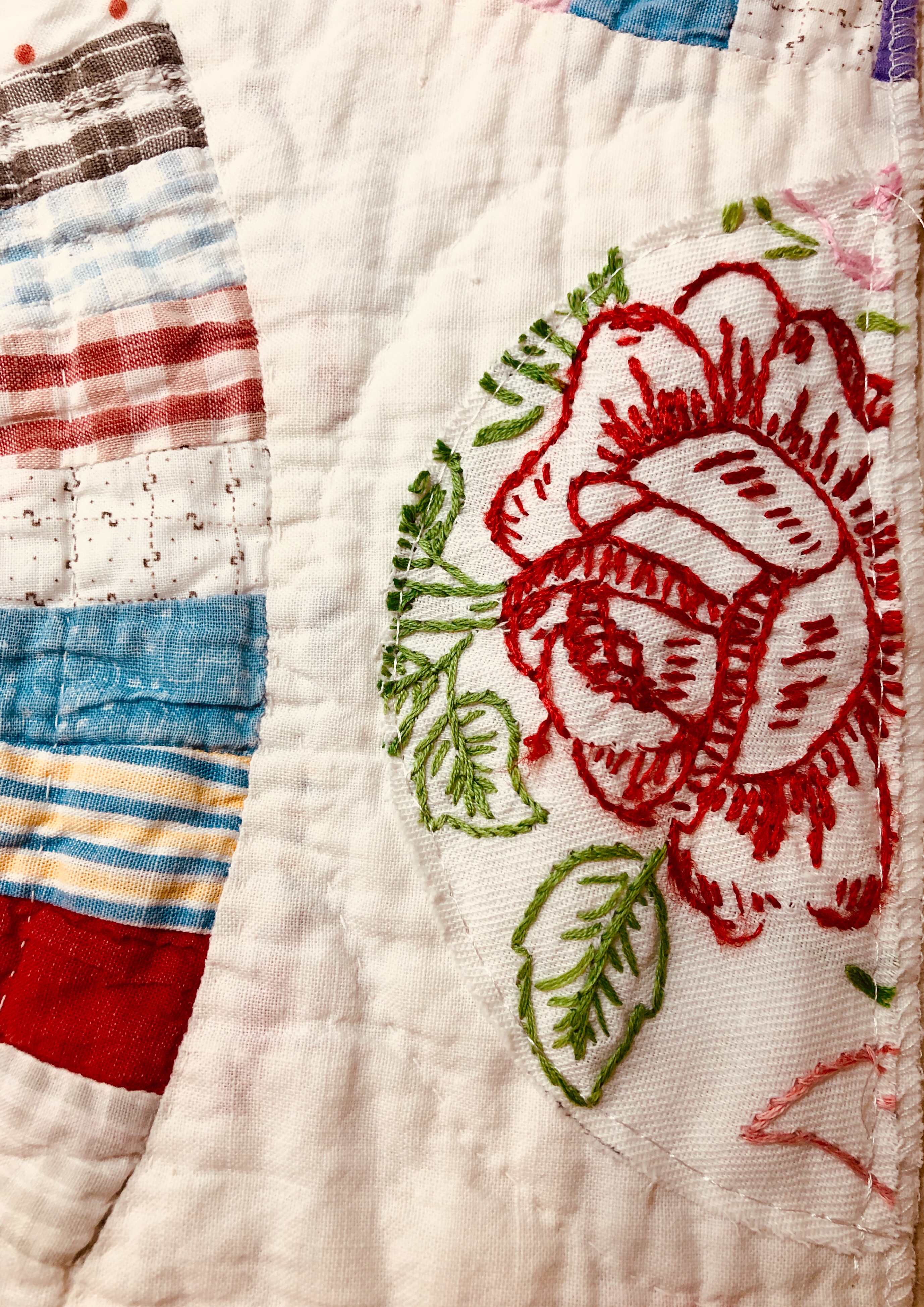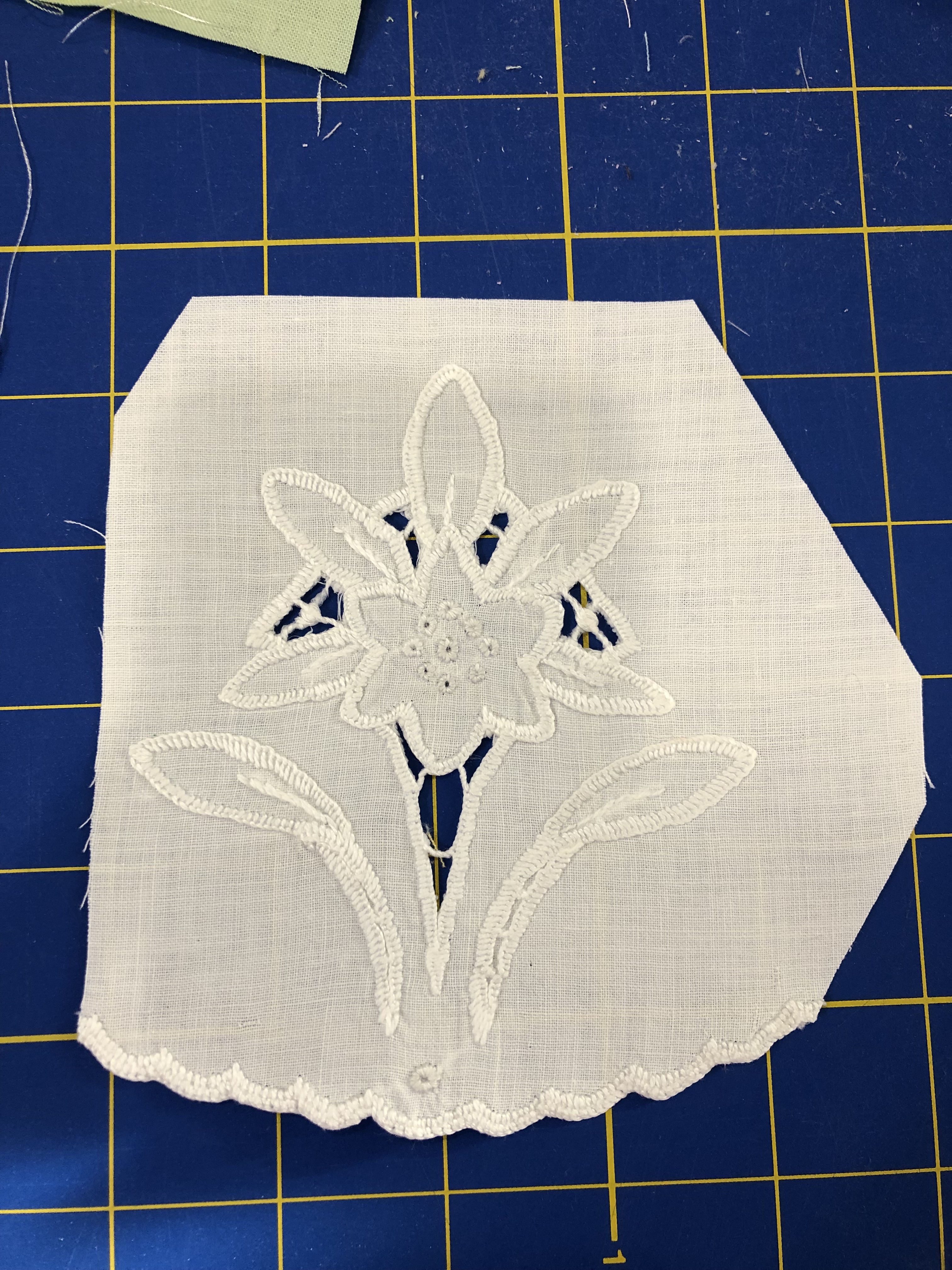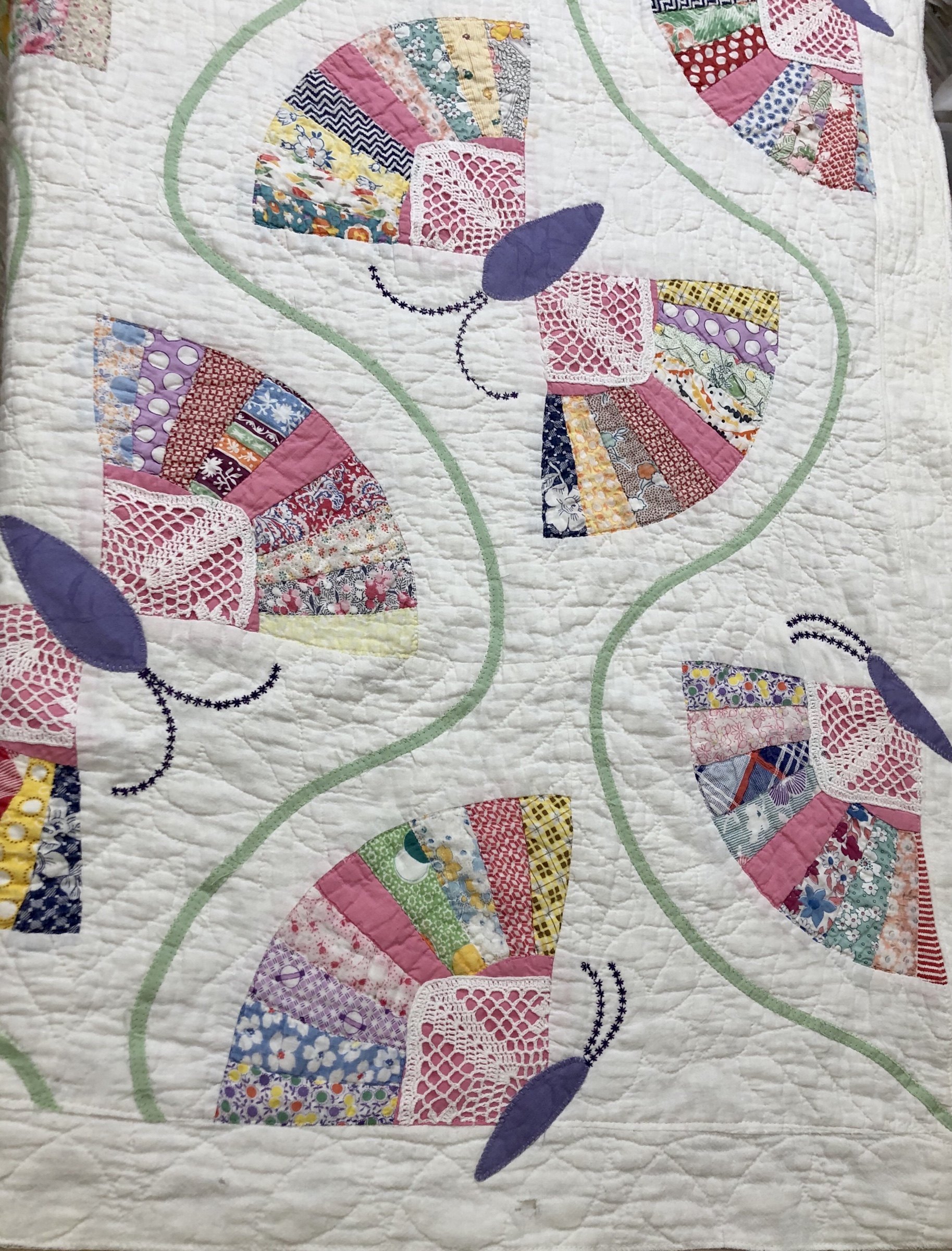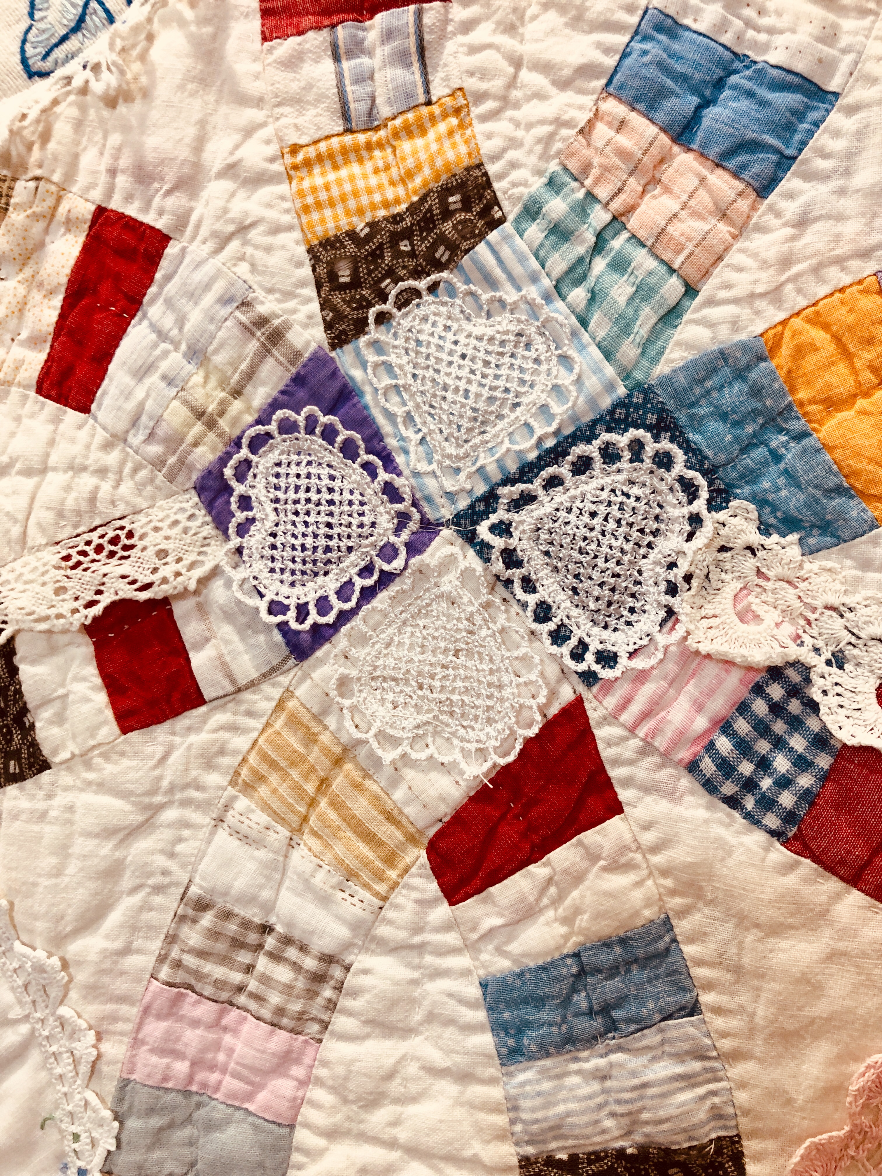 This piece features a vintage embroidered flower spray doily with an ivory hand crocheted edging. The remaining embroidery was done my your truly to enhance the vintage work. Look closely and you can pick out the ivory Dresden Plate.