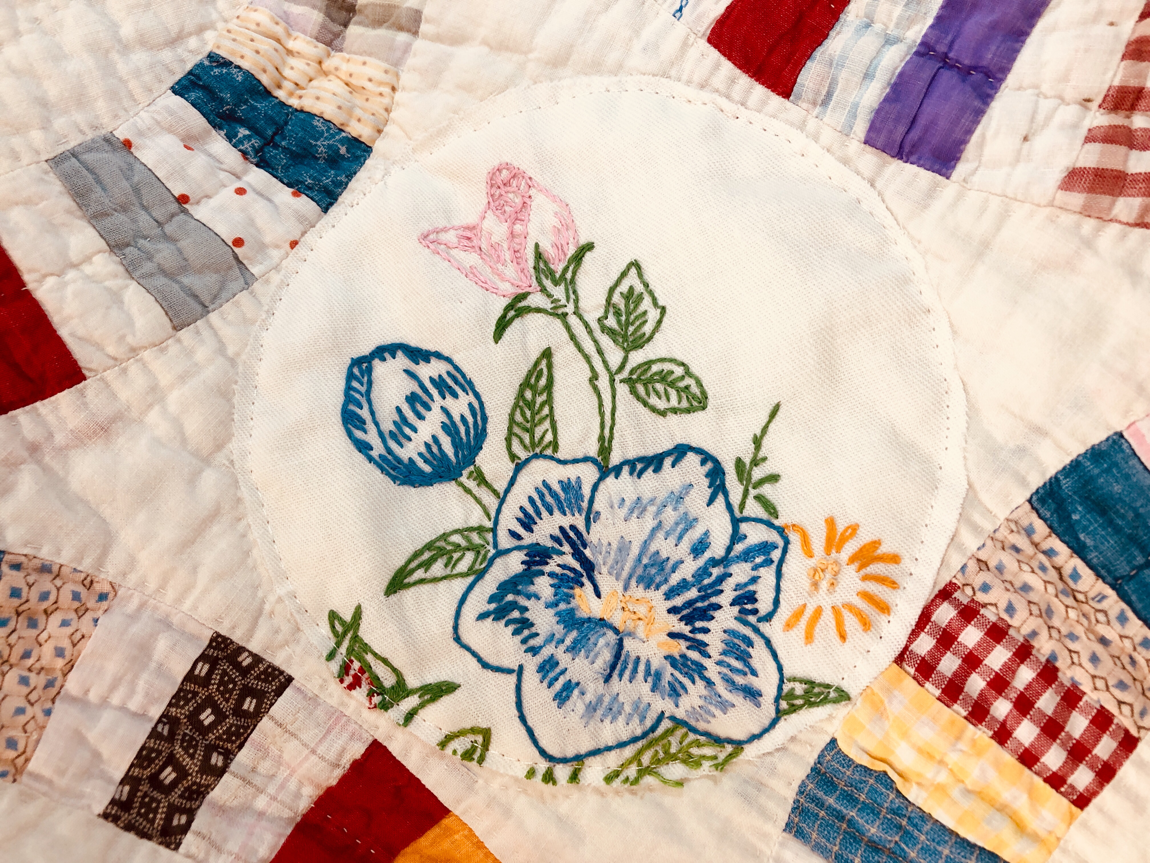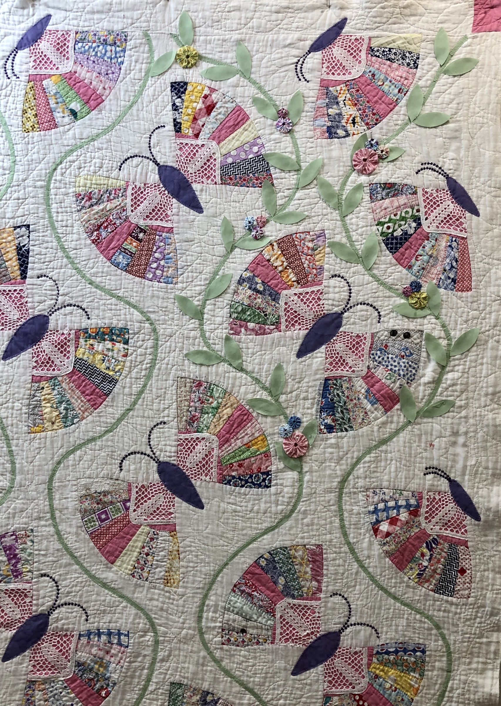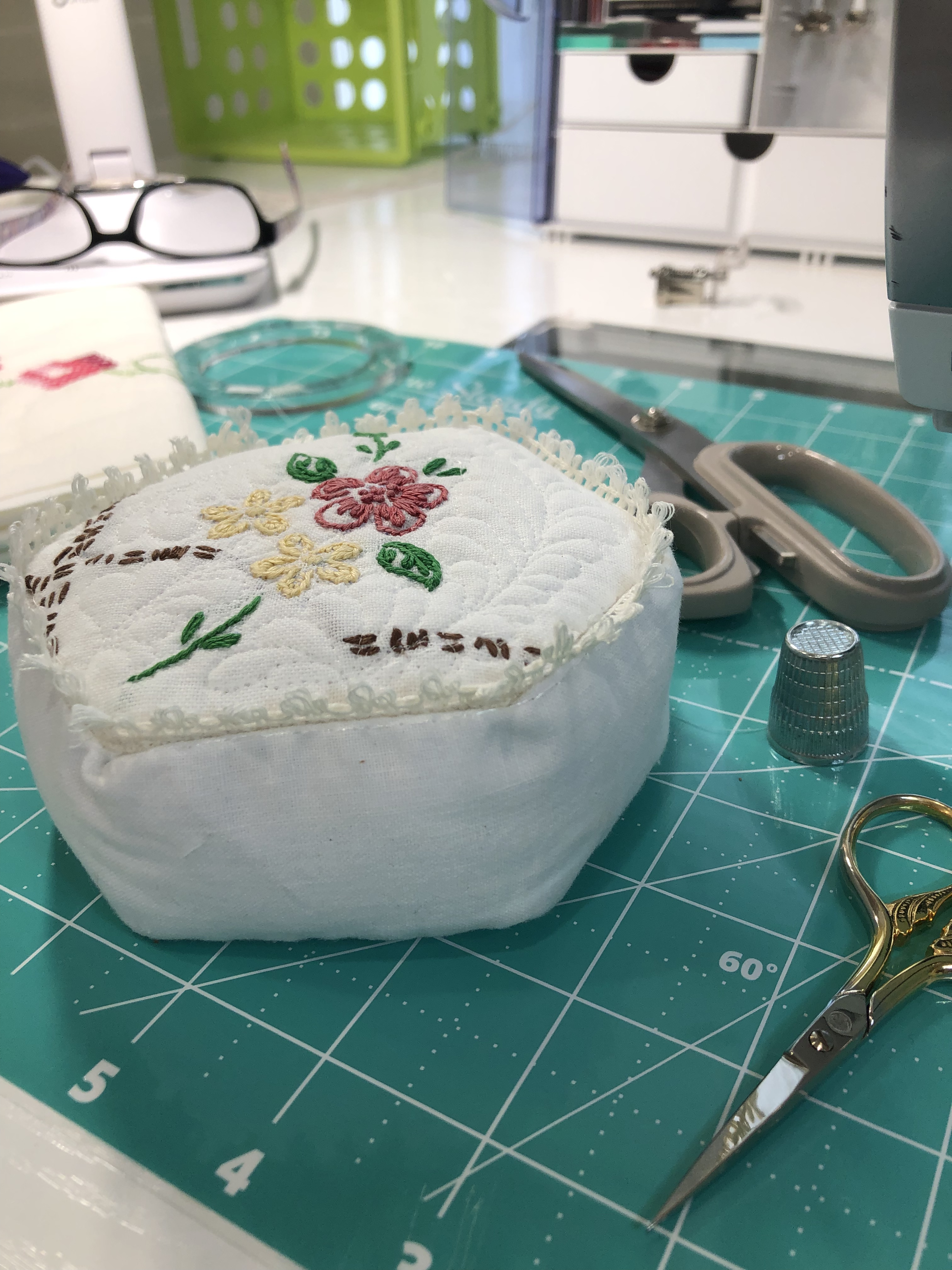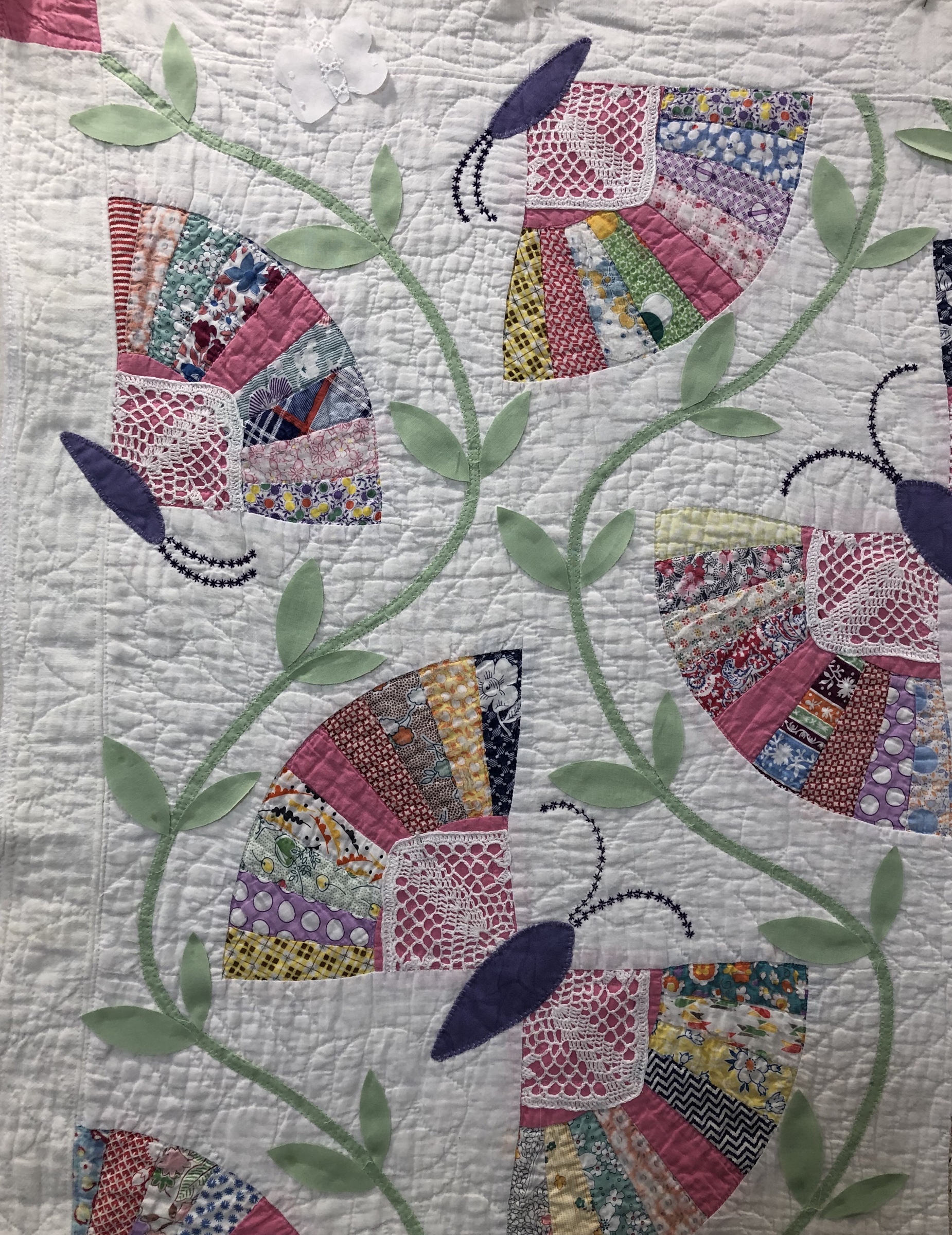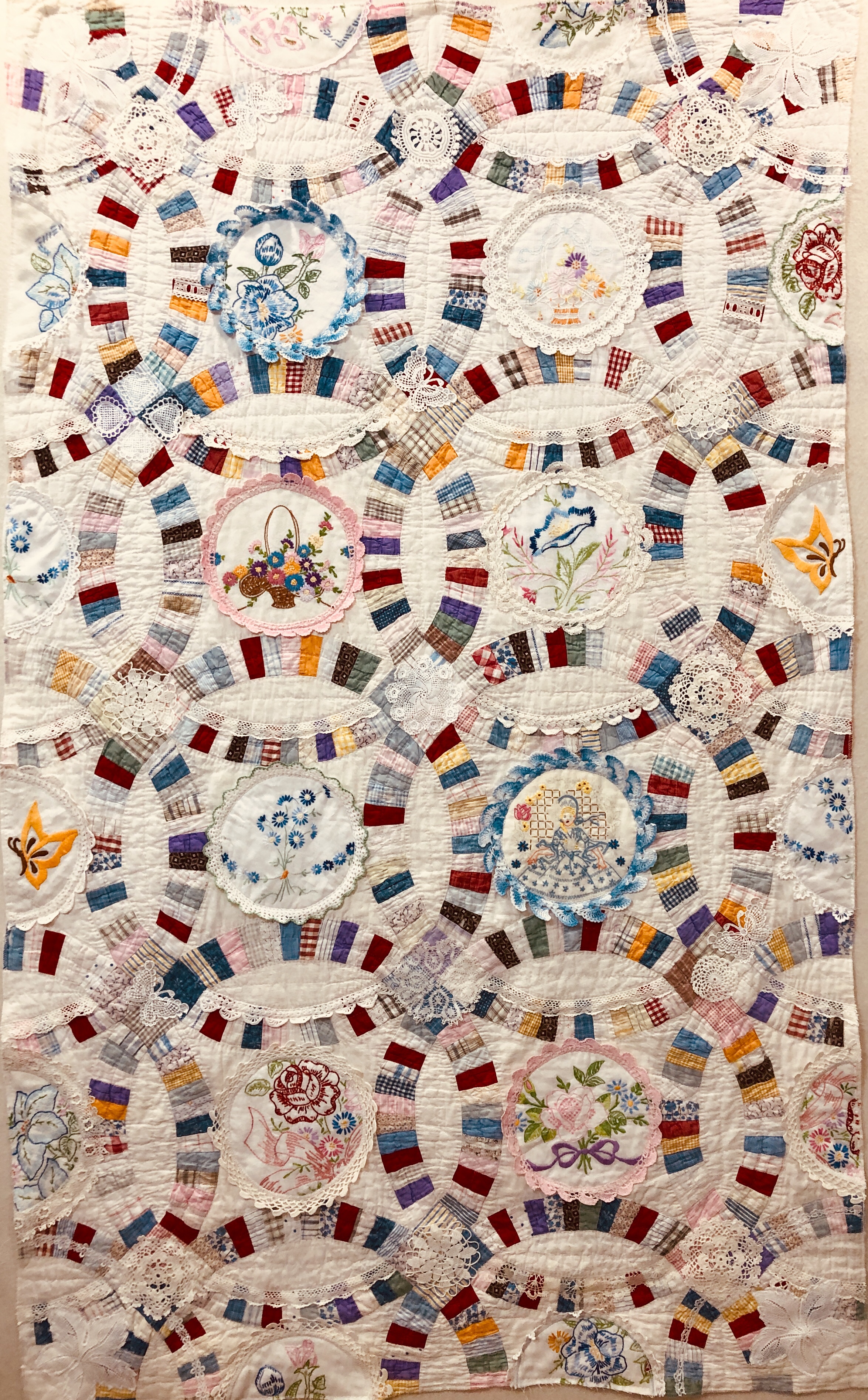 This piece features a vintage embroidered flower spray doily with an ivory hand crocheted edging. The remaining embroidery was done my your truly to enhance the vintage work. Look closely and you can pick out the ivory Dresden Plate.