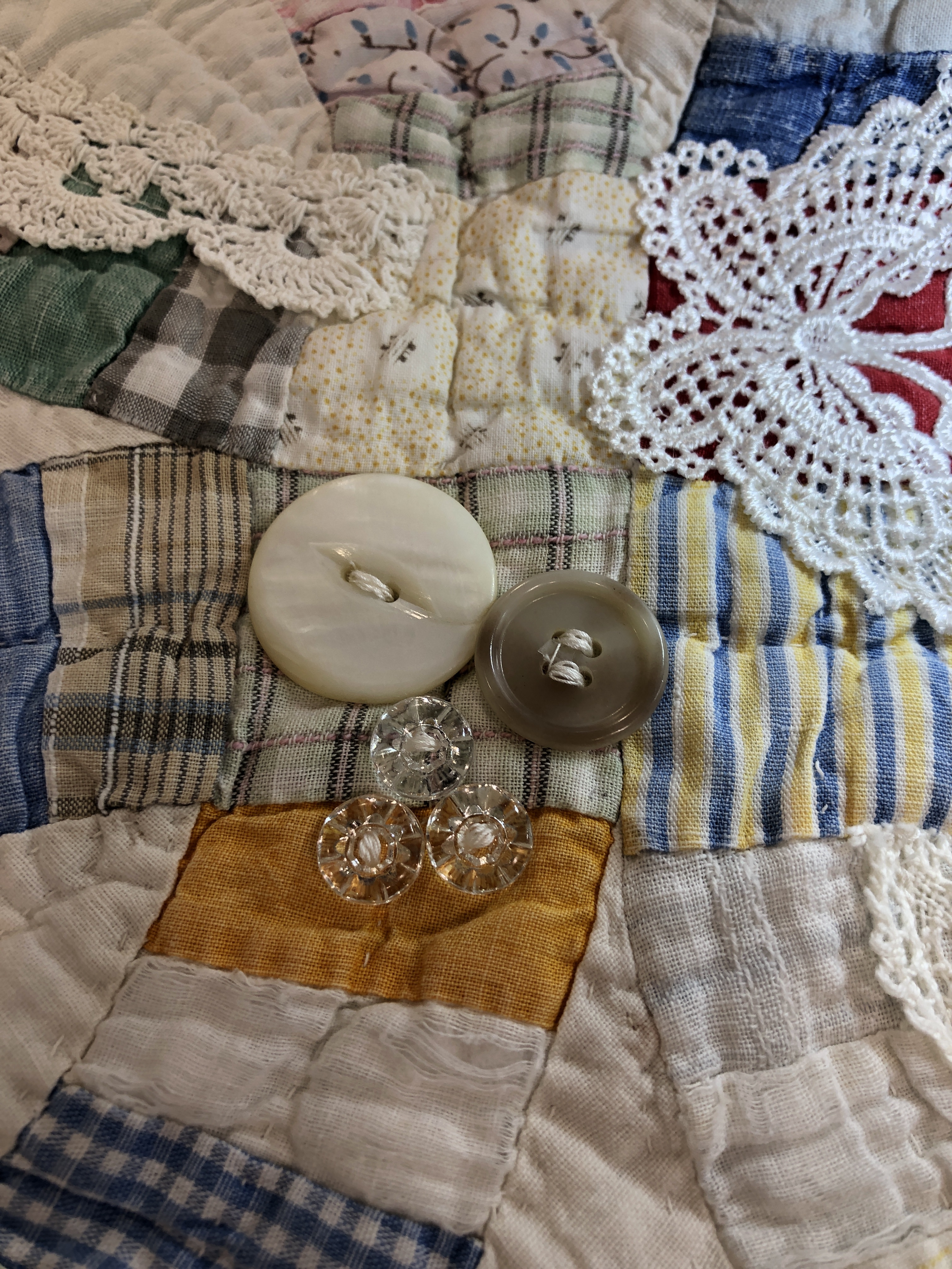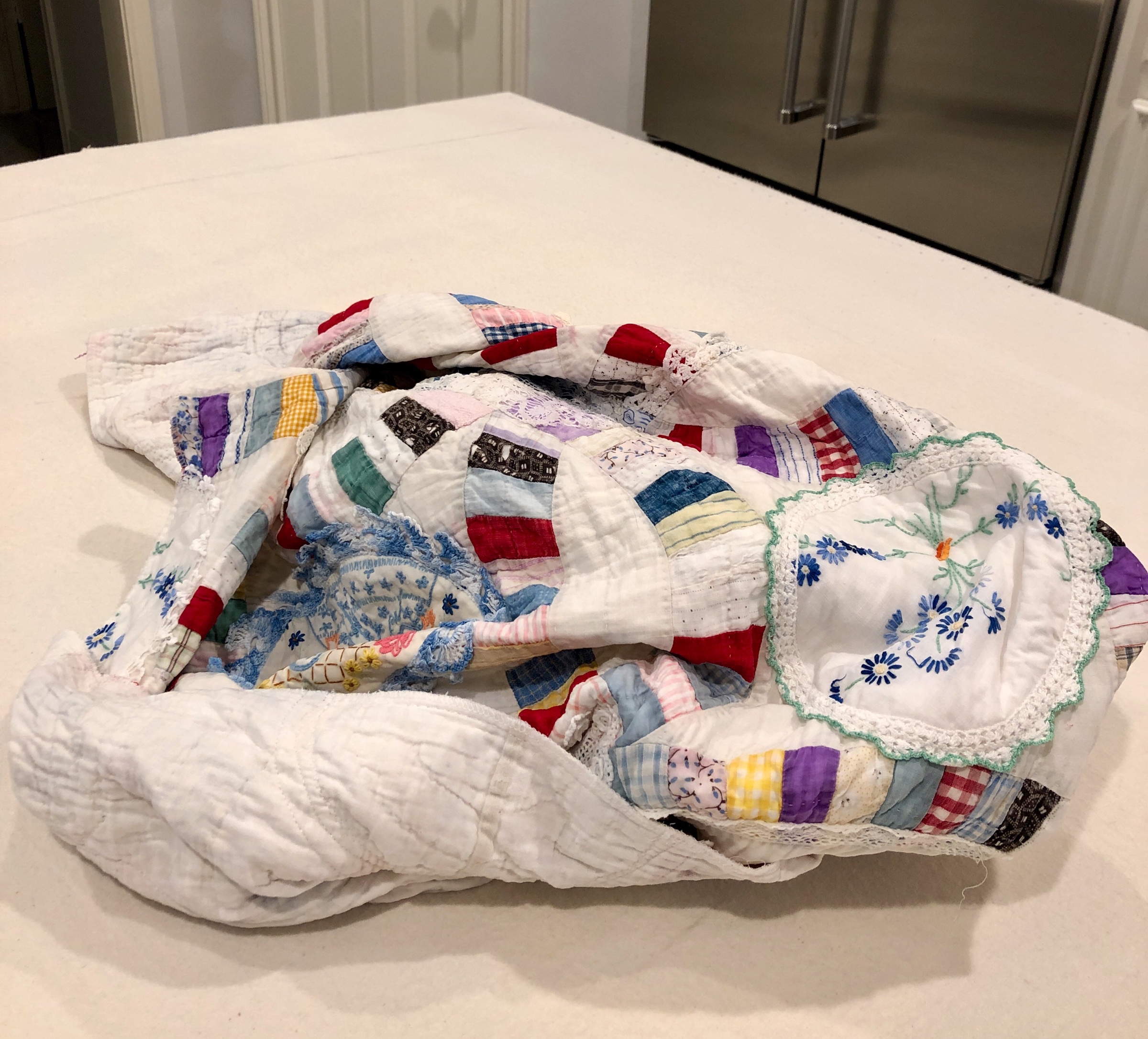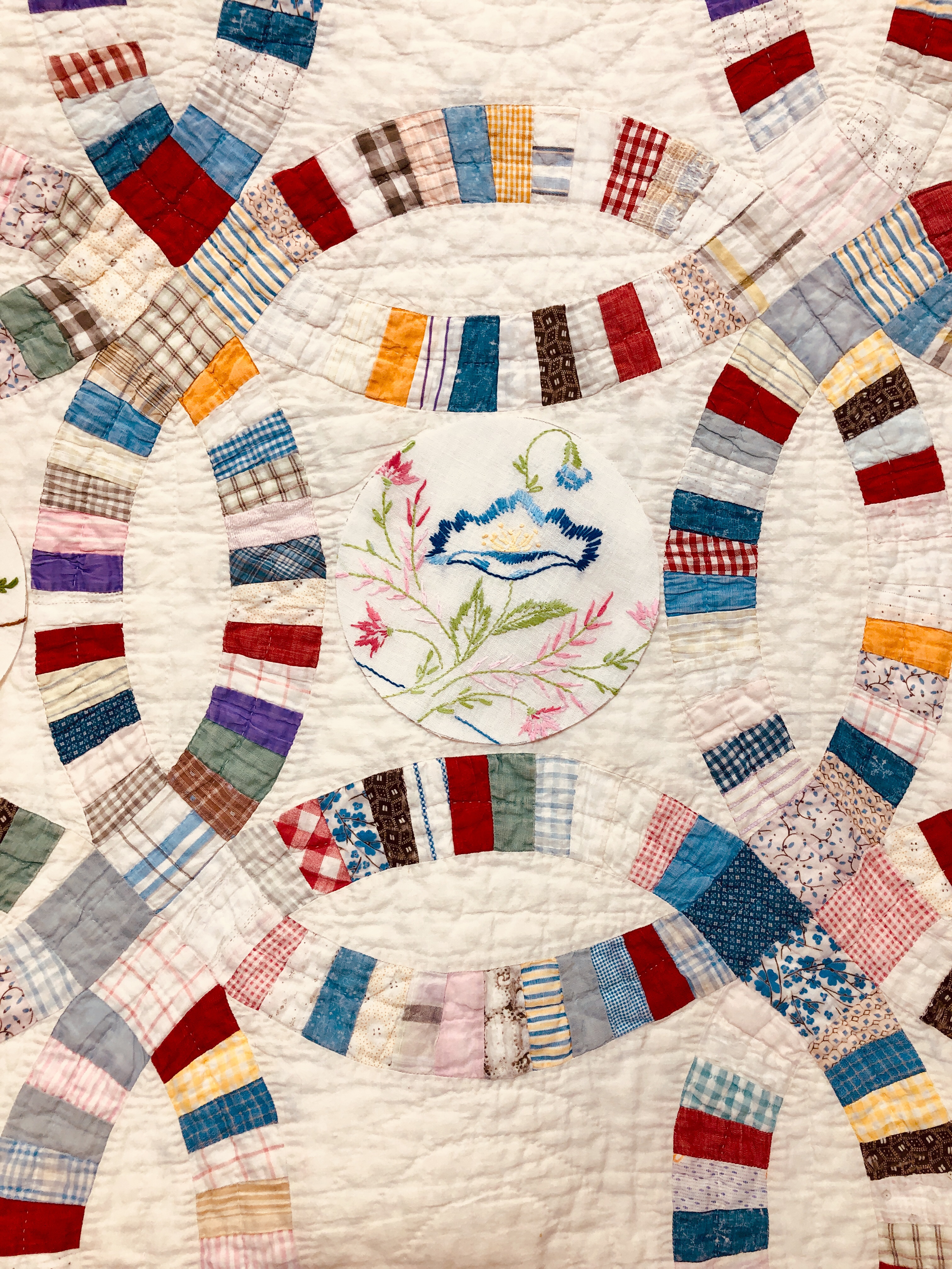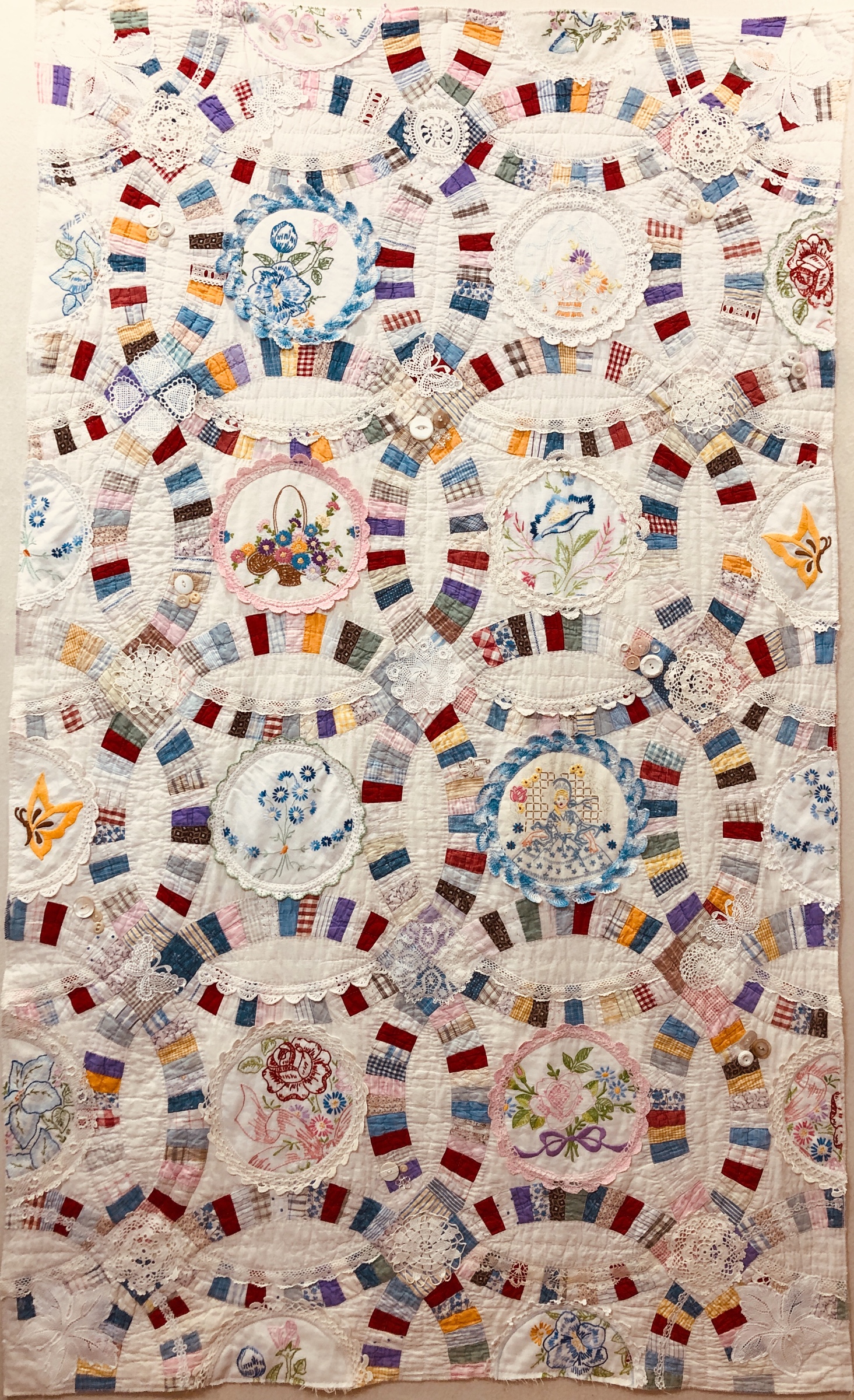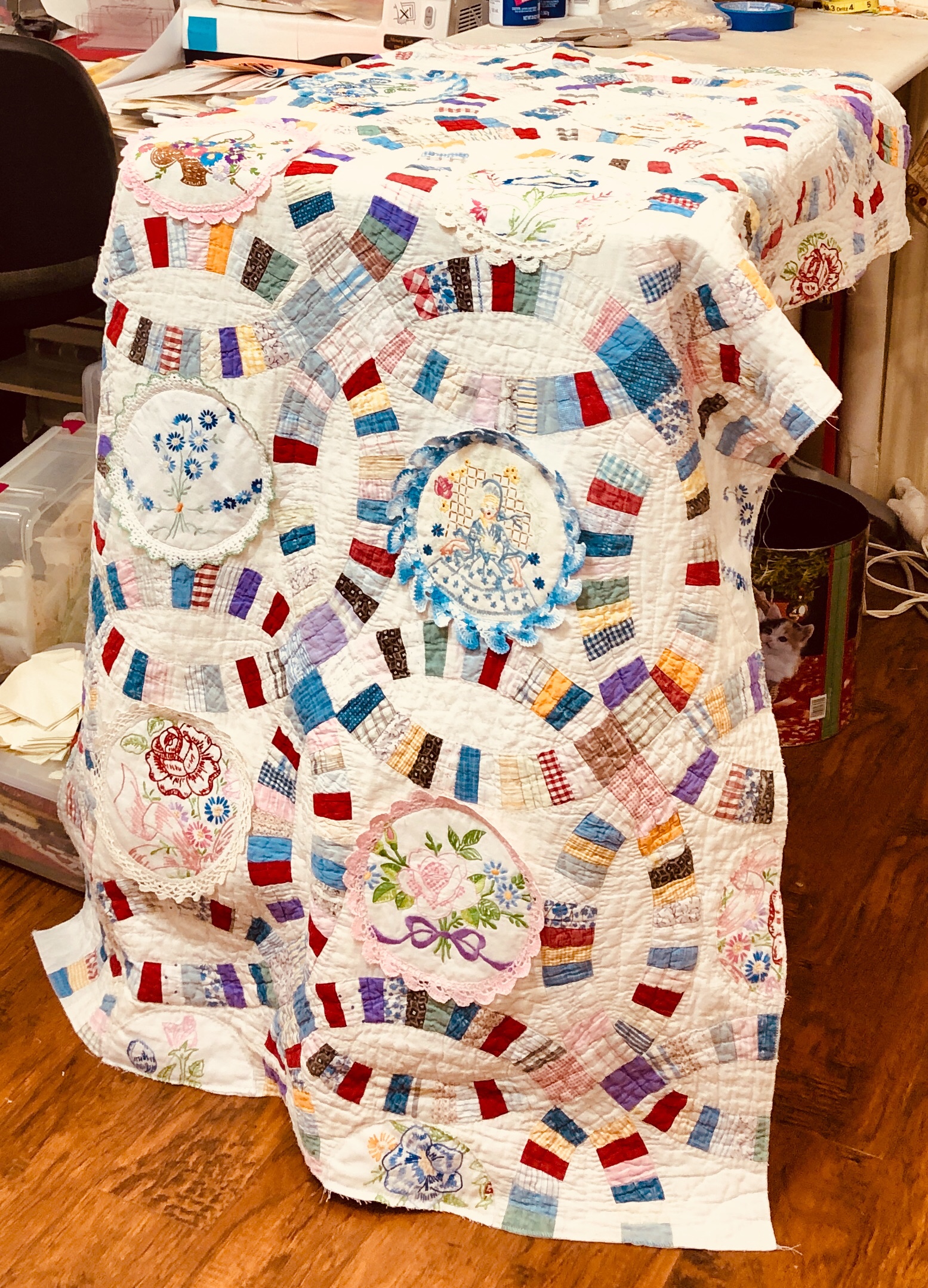 This piece features a vintage embroidered flower spray doily with an ivory hand crocheted edging. The remaining embroidery was done my your truly to enhance the vintage work. Look closely and you can pick out the ivory Dresden Plate.