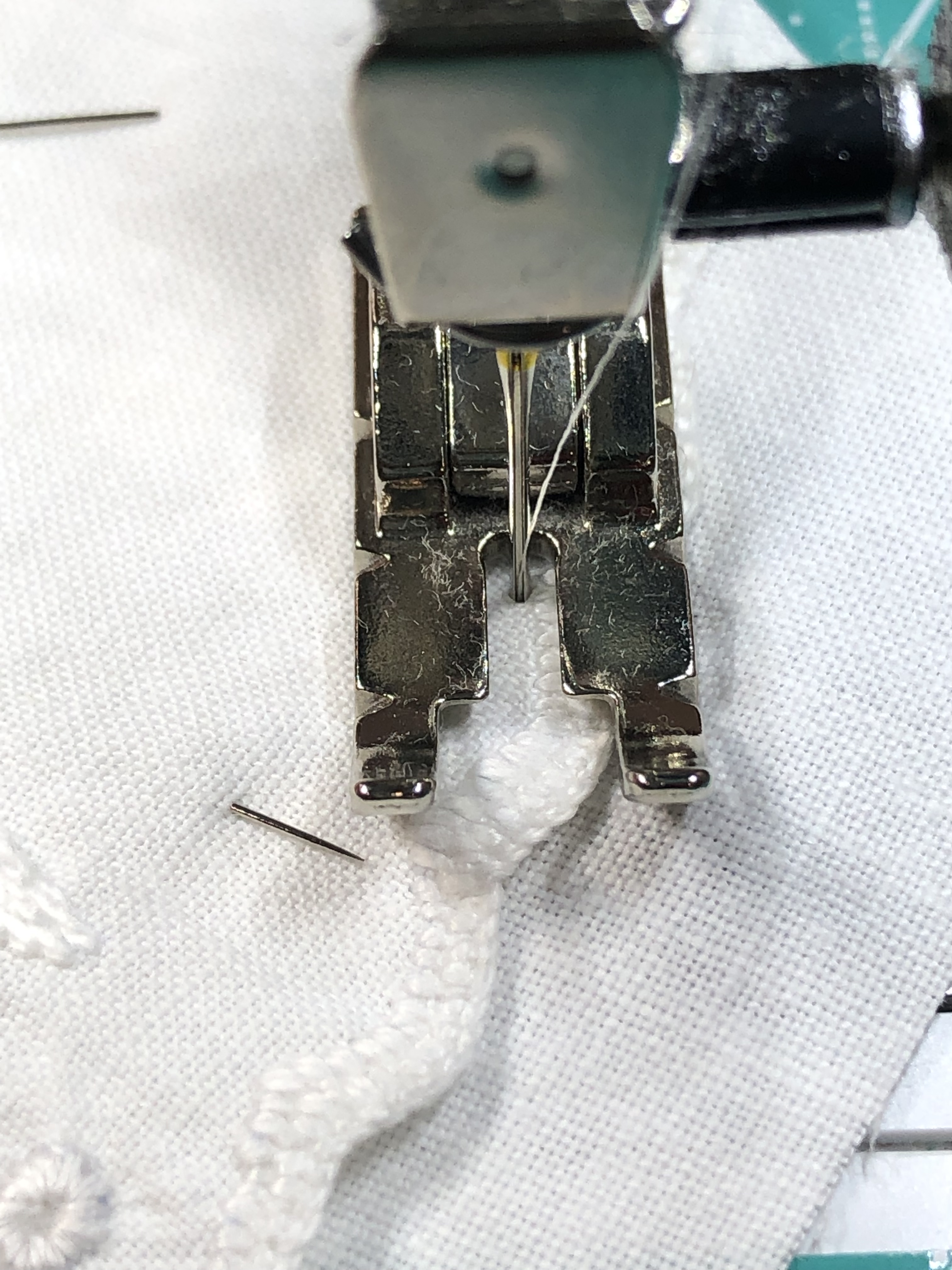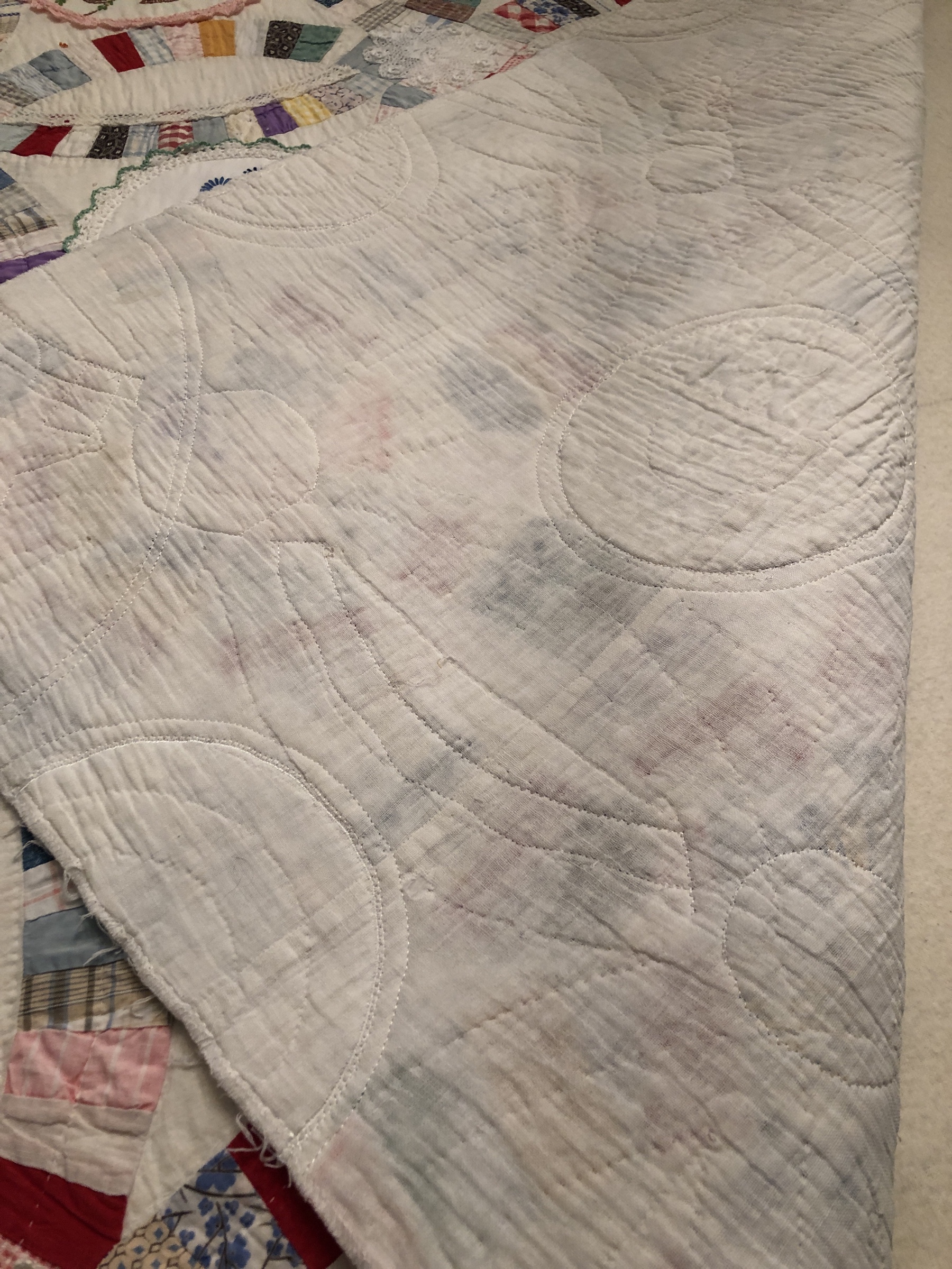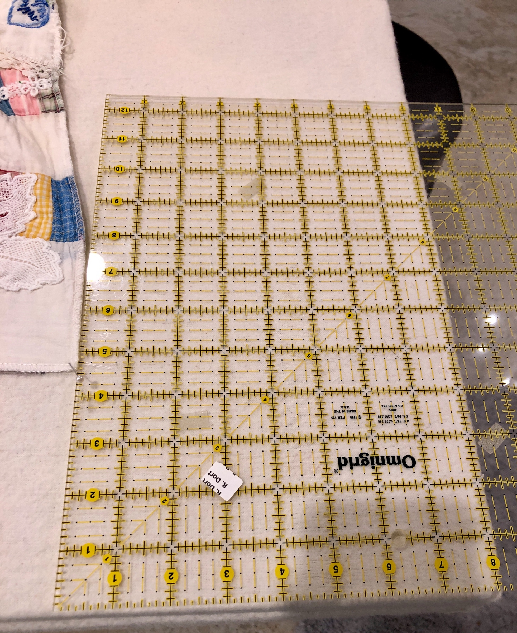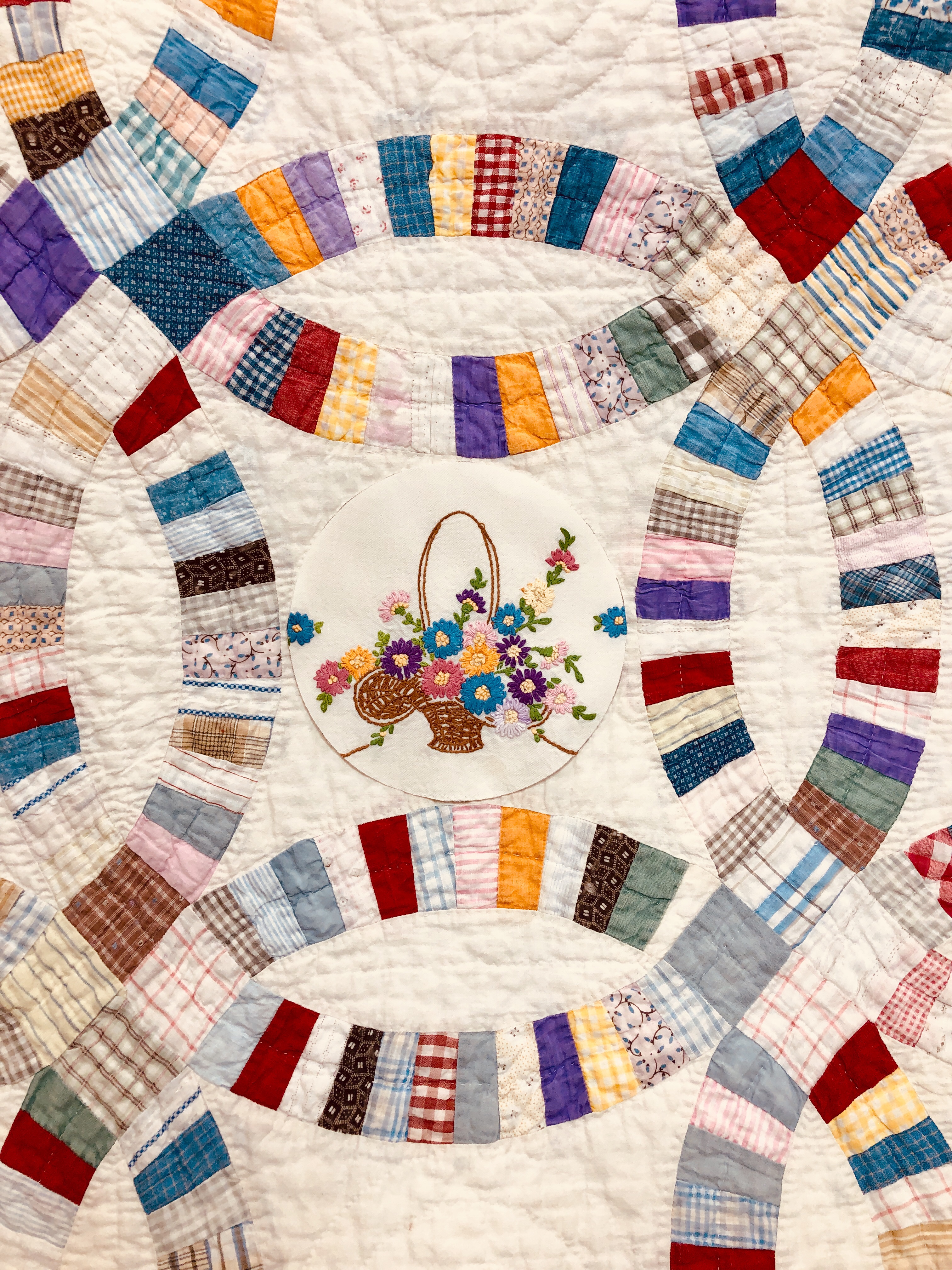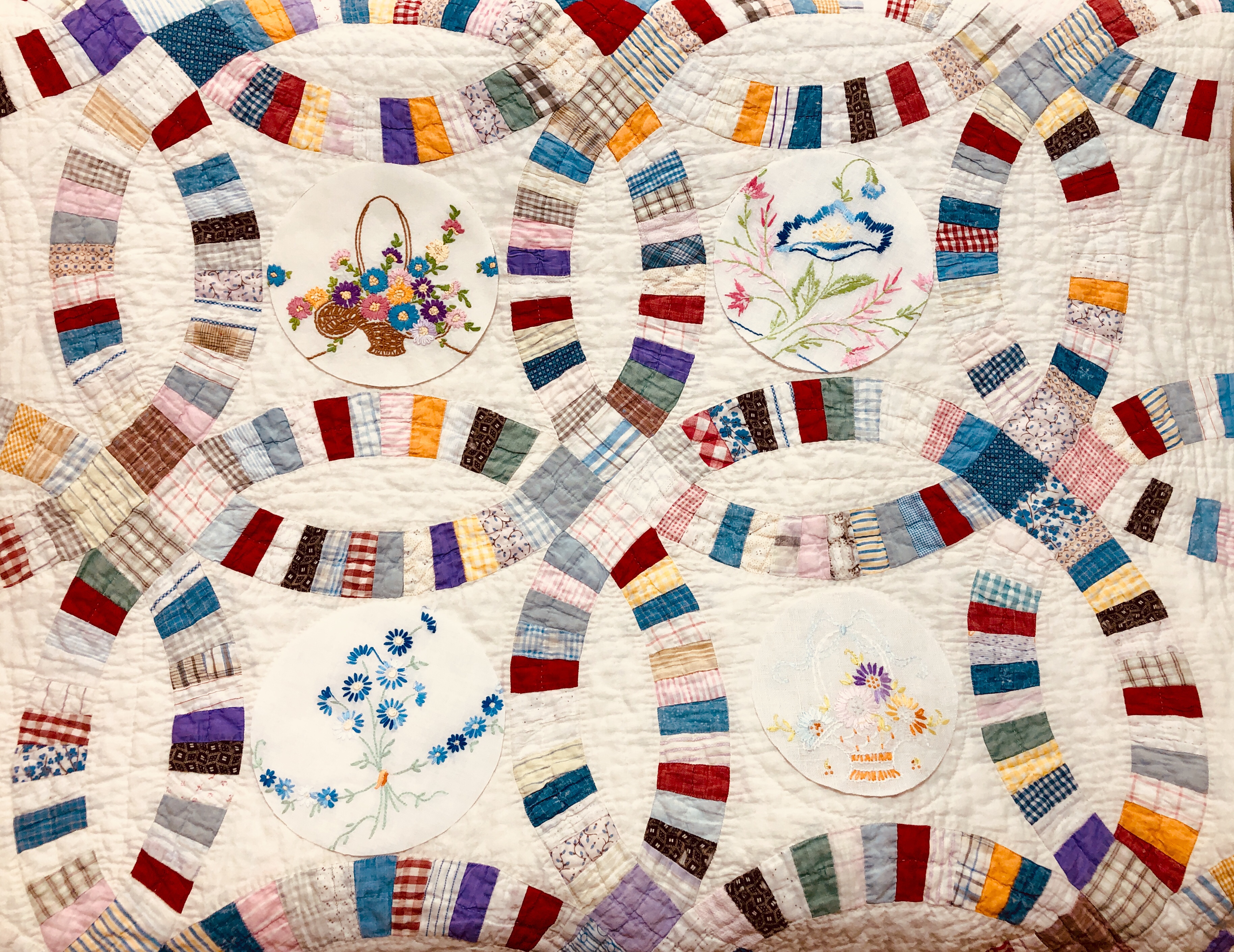 This piece features a vintage embroidered flower spray doily with an ivory hand crocheted edging. The remaining embroidery was done my your truly to enhance the vintage work. Look closely and you can pick out the ivory Dresden Plate.