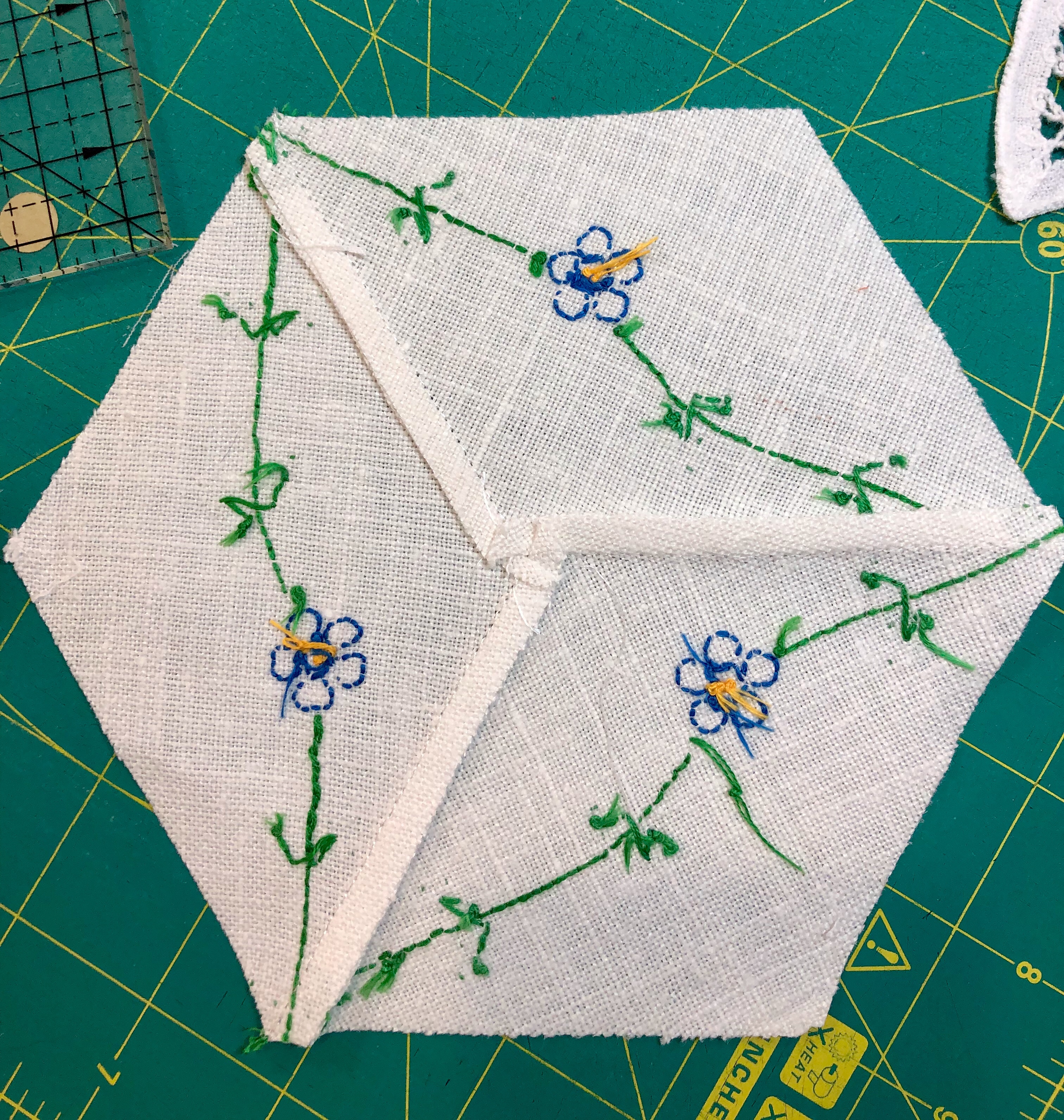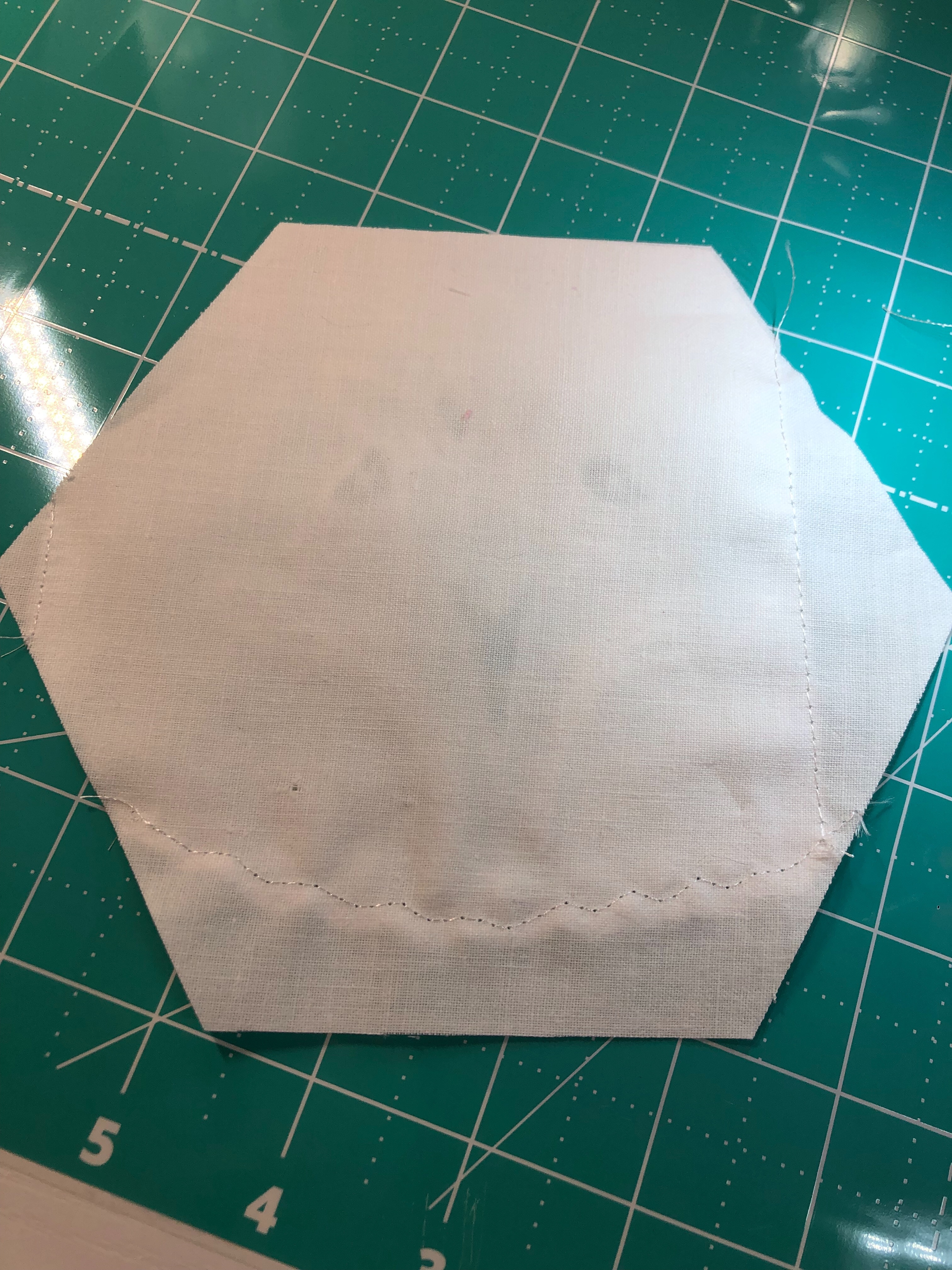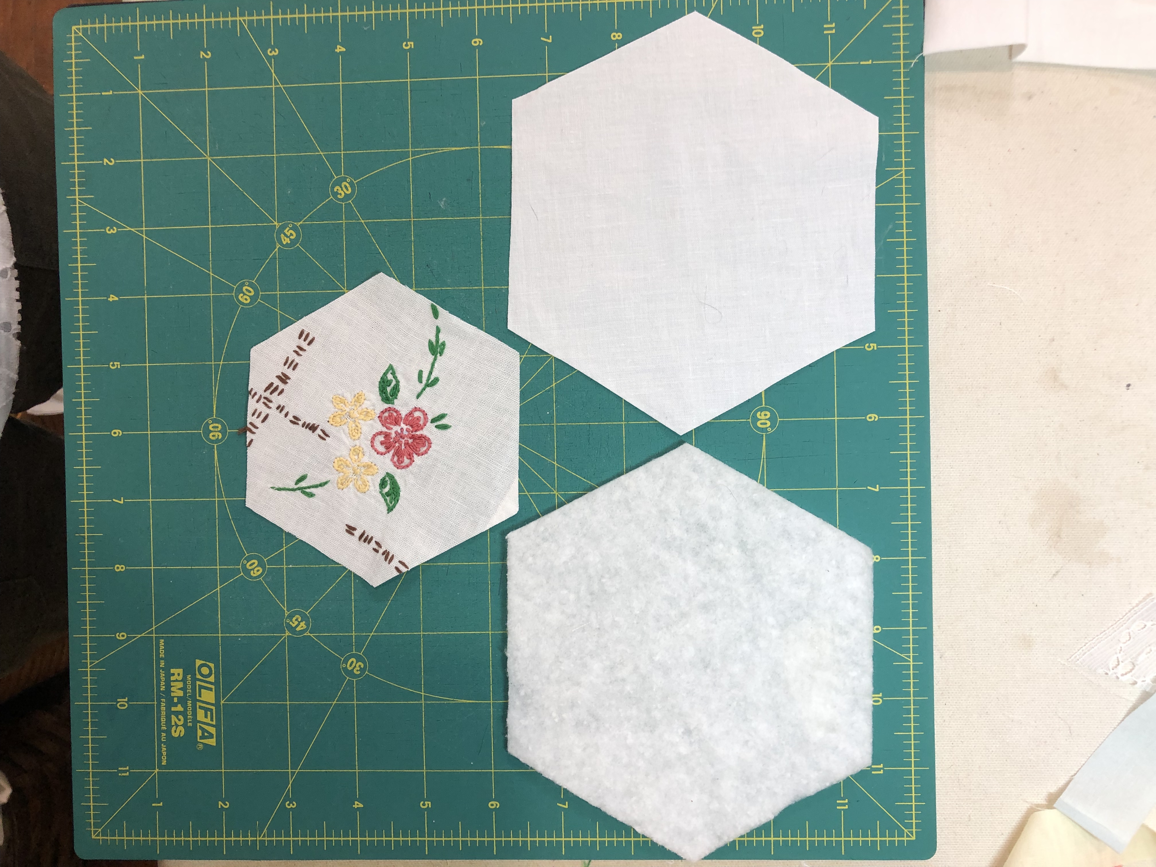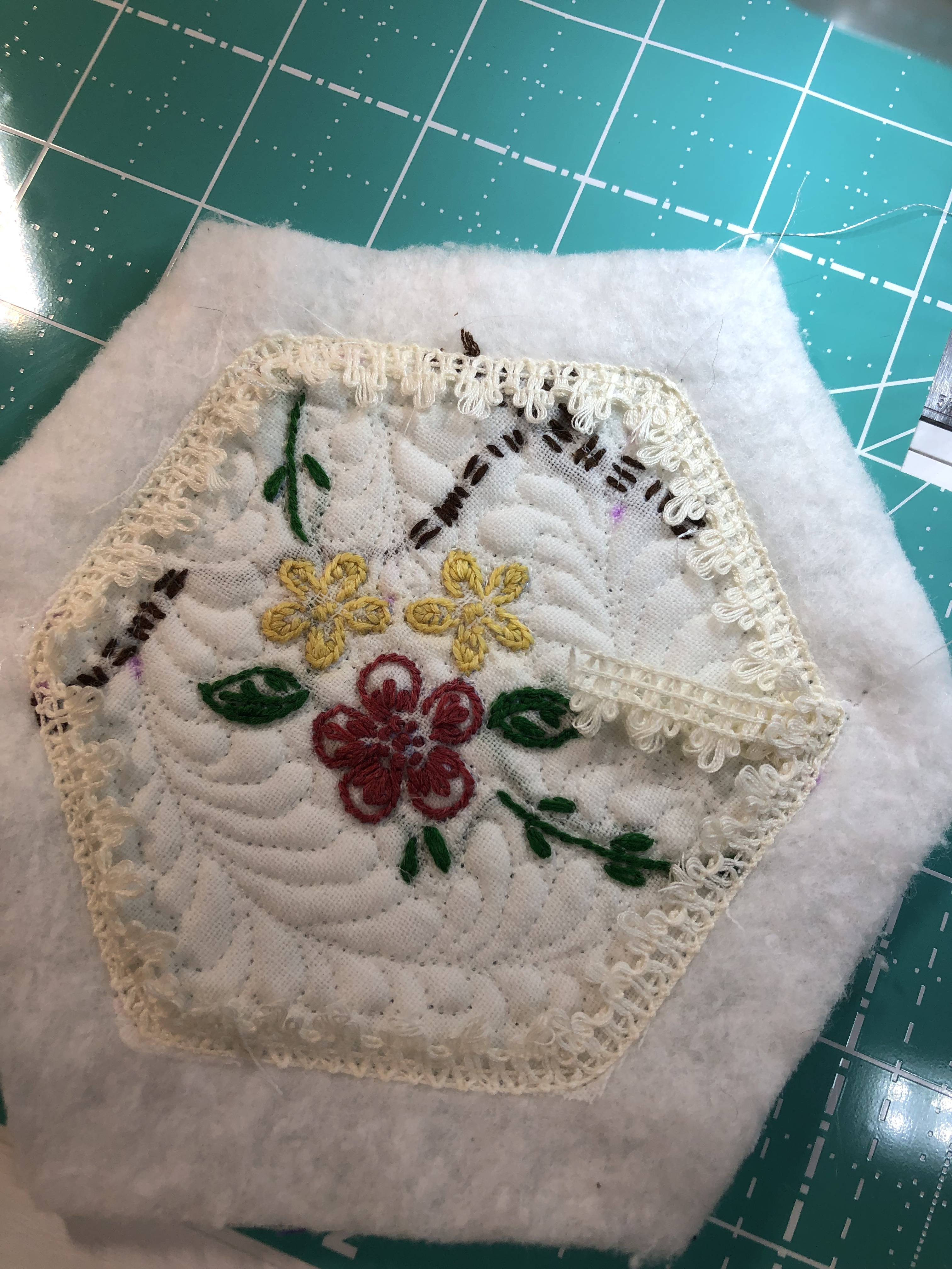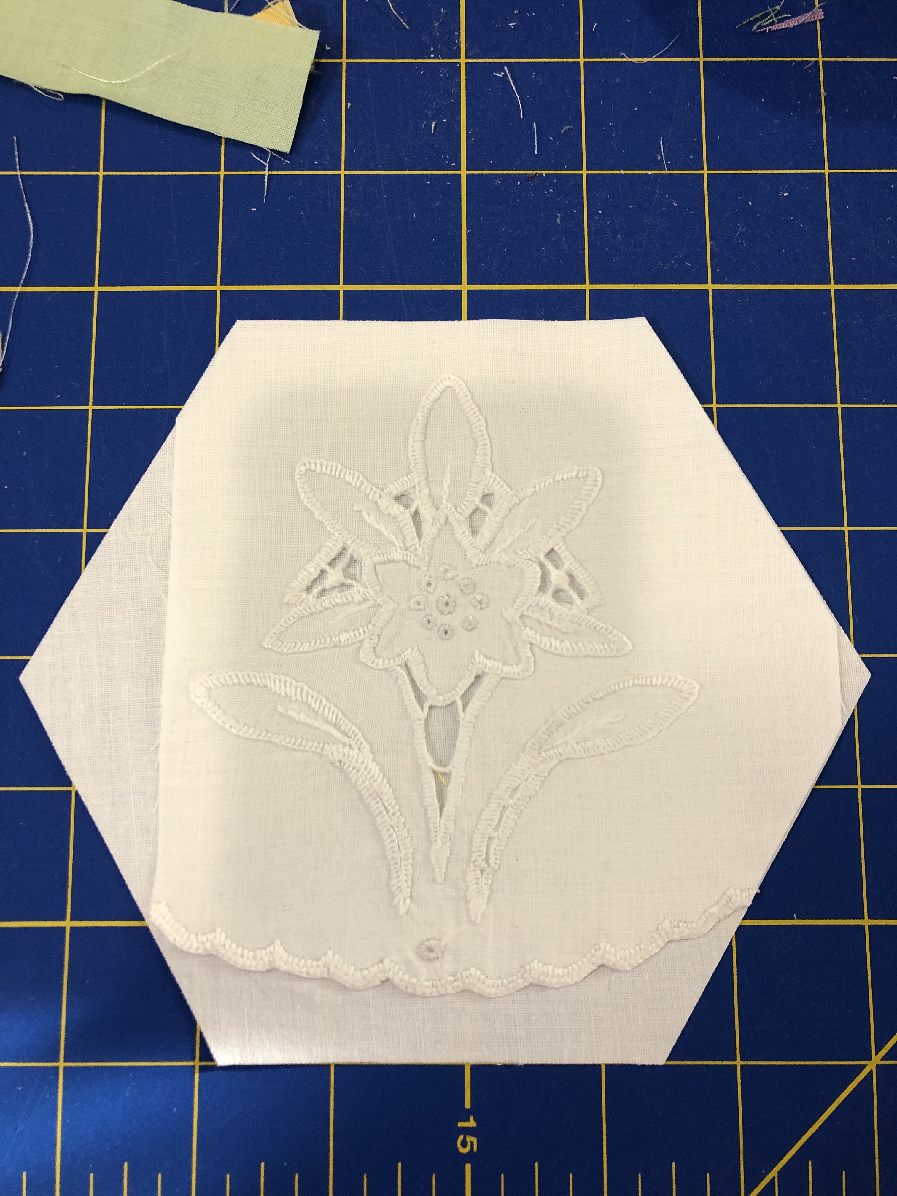 The backing fabric is cut 5/8″ larger on all sides. It is folded once to meet the raw edge of the embellished hexagon and the final fold will take it over the edge to the front where it frames the hexagon nicely and is hand stitched in place.